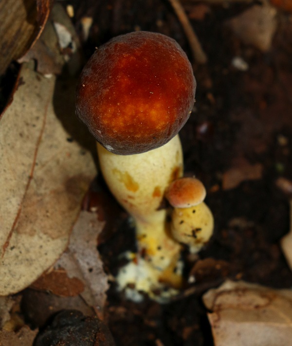 This collection often formed thick stipes and spherical reddish to reddish-brown pileus not much broader from the stipe (probably it will extend to a convex shape when fully mature).