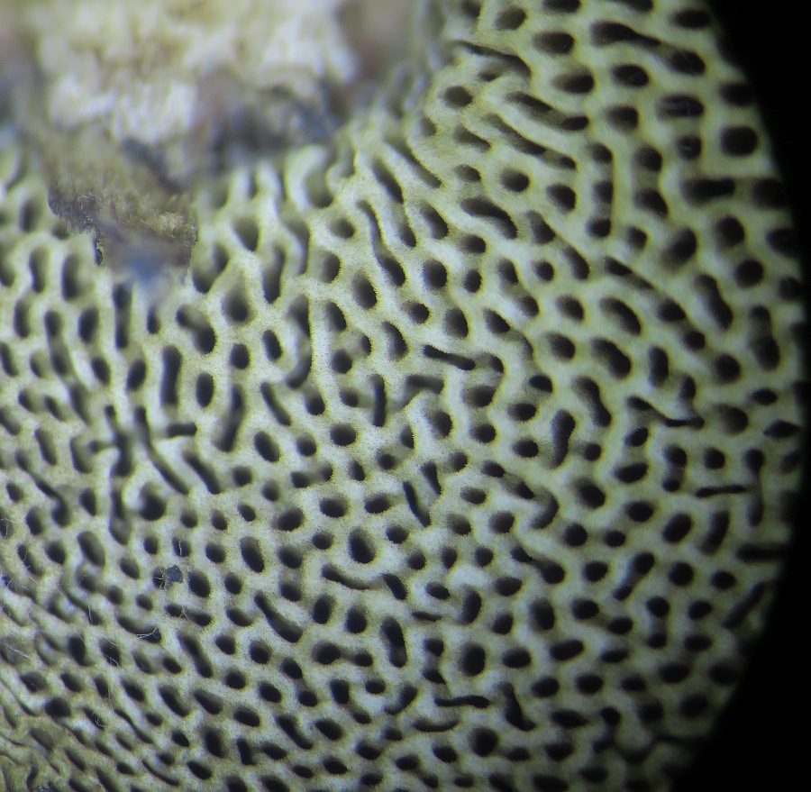Pores rounded, about 0.3mm diameter, circular to more often oval-ellipsoid, irregular and sometimes coalescing forming elongated (linear) shapes up to 1.2mm long