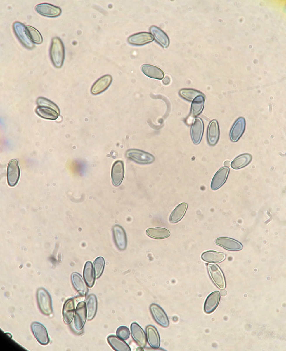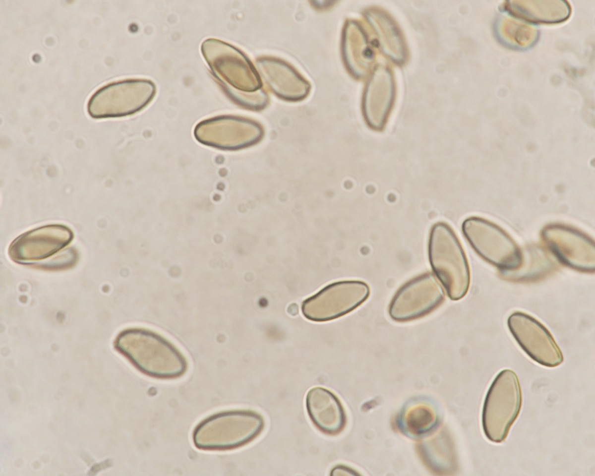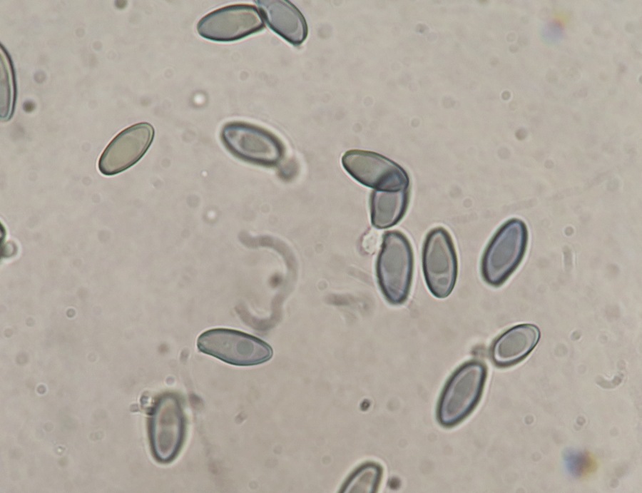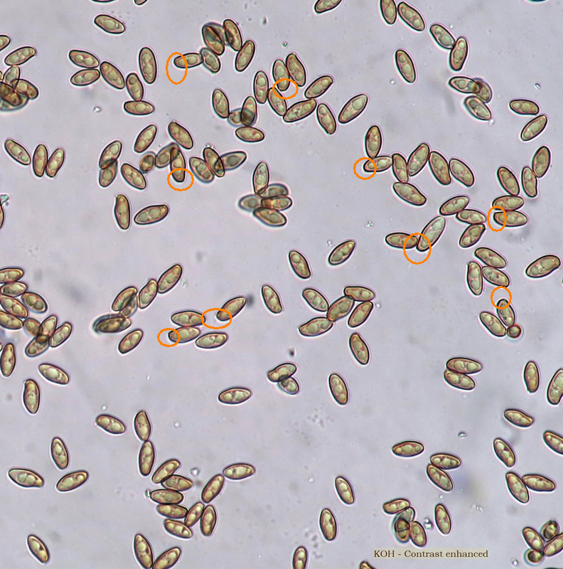 Spores fusiform-navicular with a tiny germ pore at one pole and a small eccentric apicullum at the other. Contents with 2-3 large oil drops sometimes with few smaller ones. Measurement: 9.7 [11 ; 11.6] 12.9 × 4.7 [5.3 ; 5.5] 6.1 µm [ Me = 11.3 × 5.4 µm ; Qe = 2.1]. Spore mass dull olive-brown, darkens slightly in KOH.