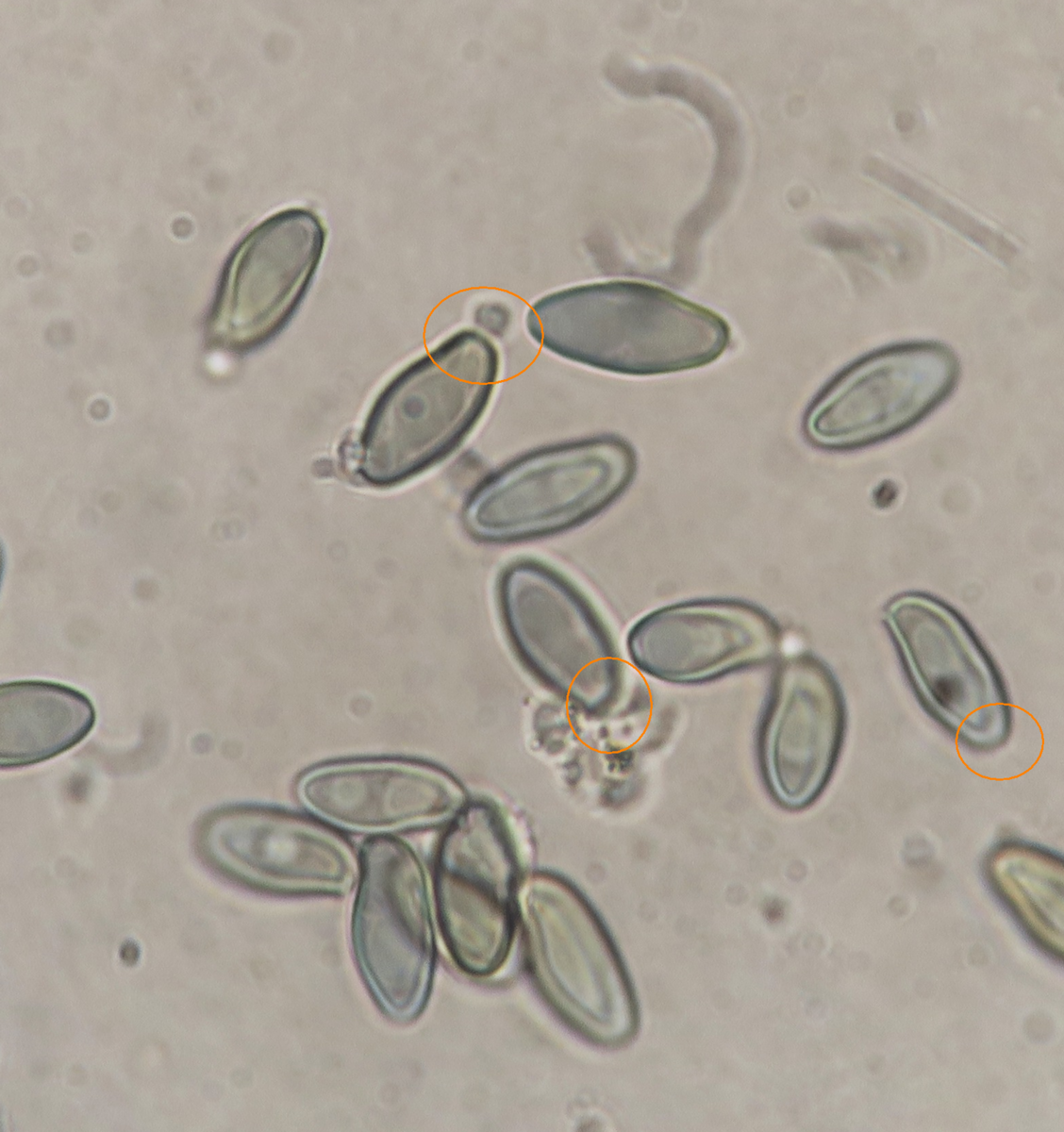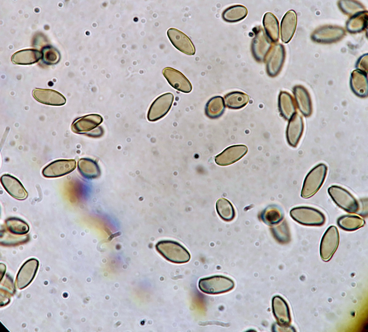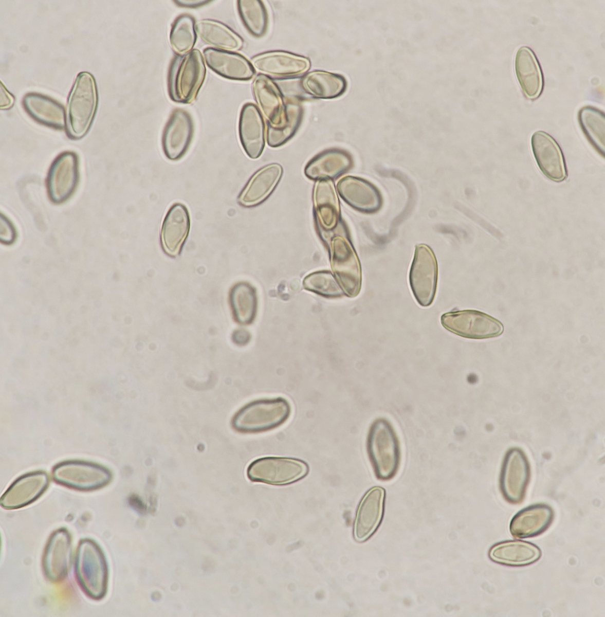 Spores fusiform-navicular with a tiny germ pore at one pole and a small eccentric apicullum at the other. Contents with 2-3 large oil drops sometimes with few smaller ones. Measurement: 9.7 [11 ; 11.6] 12.9 × 4.7 [5.3 ; 5.5] 6.1 µm [ Me = 11.3 × 5.4 µm ; Qe = 2.1]. Spore mass dull olive-brown, darkens slightly in KOH.
