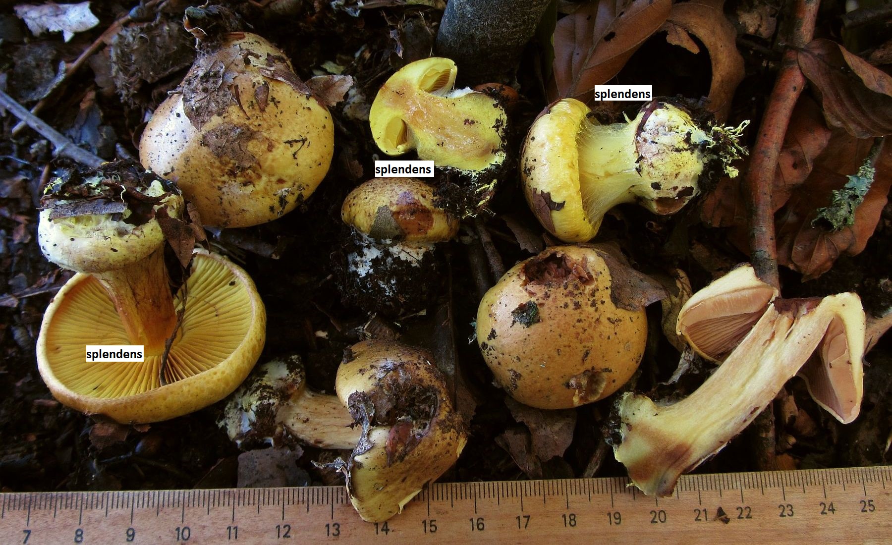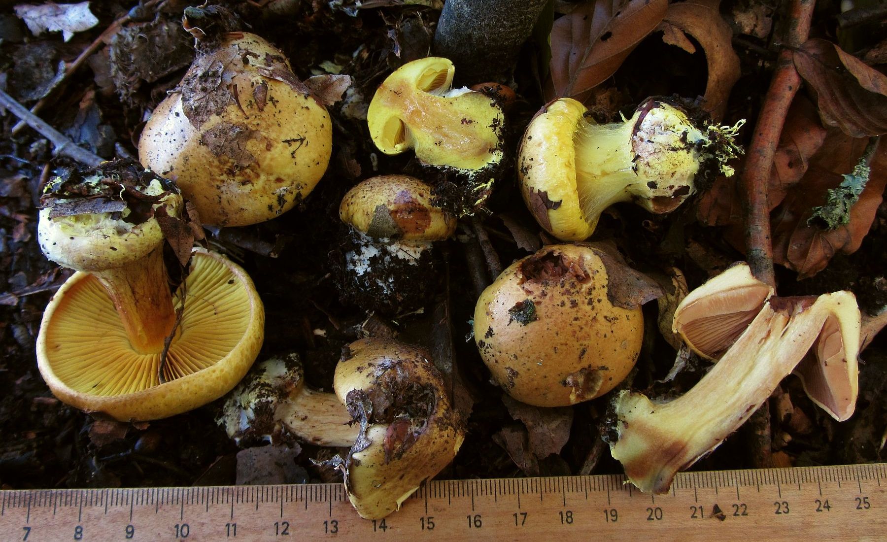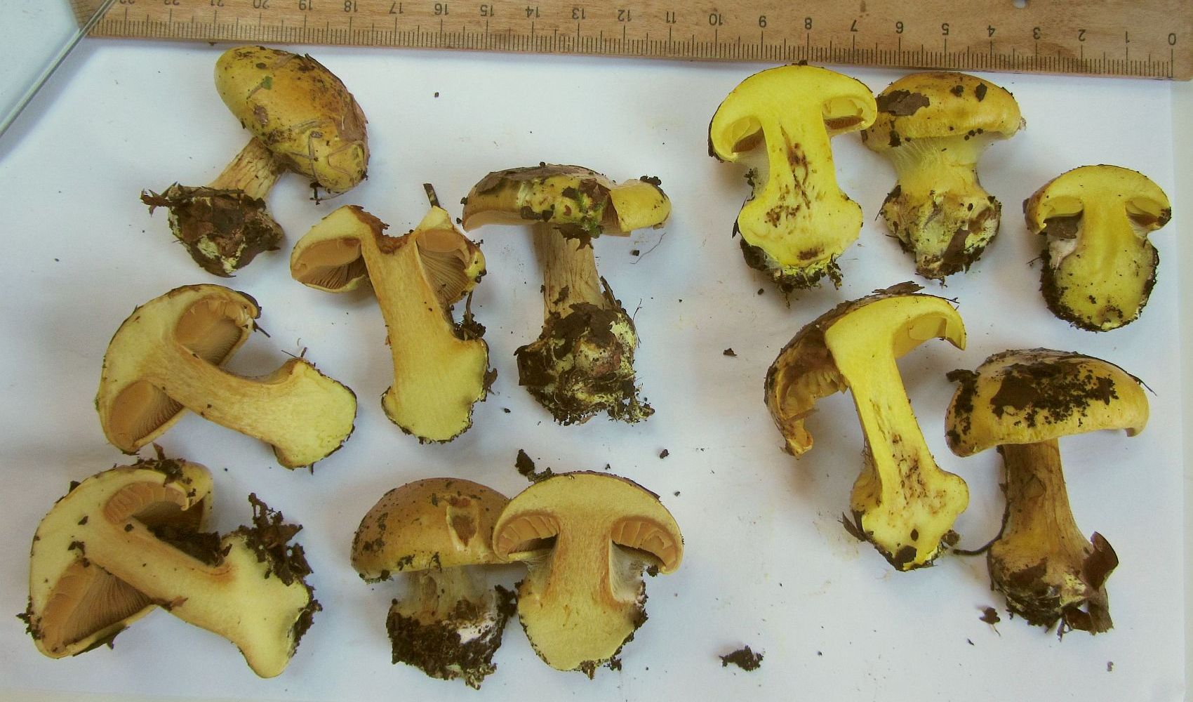 Manchmal sogar fast in Form brauchbarer Kollektionen. Aber Obacht: Ein Mycel bildet zwar gerne seine Fruchtkörper in einer bestimmten Anordnung (Kreise, Bögen, Linien, Fächer). Doch wenn man sowas in diesem Jahr findet (in dem Fall einen kleinen "Fruchtkörperbogen"), könnte unter Umständen was nicht stimmen, da eine Kollektion von mehr als drei Fruchtkörpern aus einem Phlegmacien - Mycel eine absolute Rarität zu sein scheint (mit wenigen Ausnahmen).