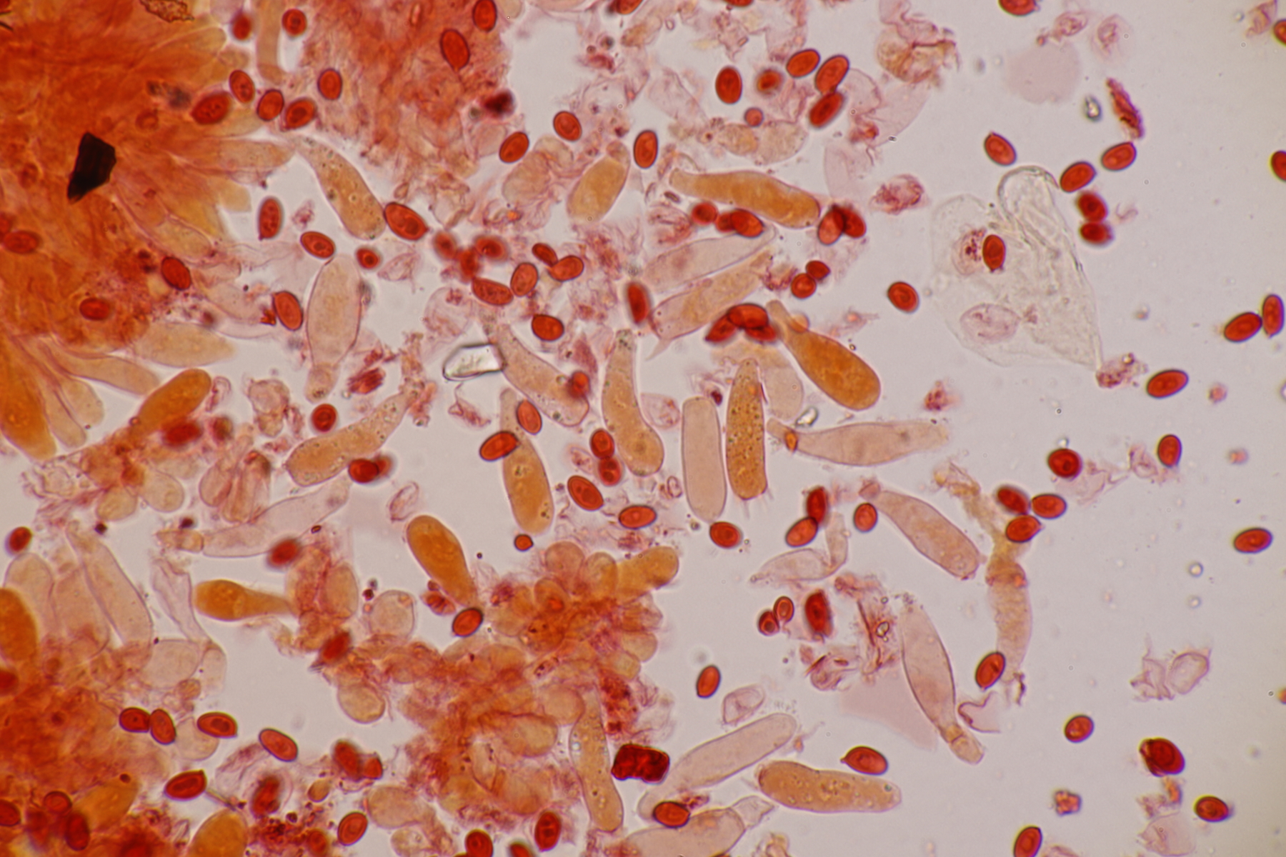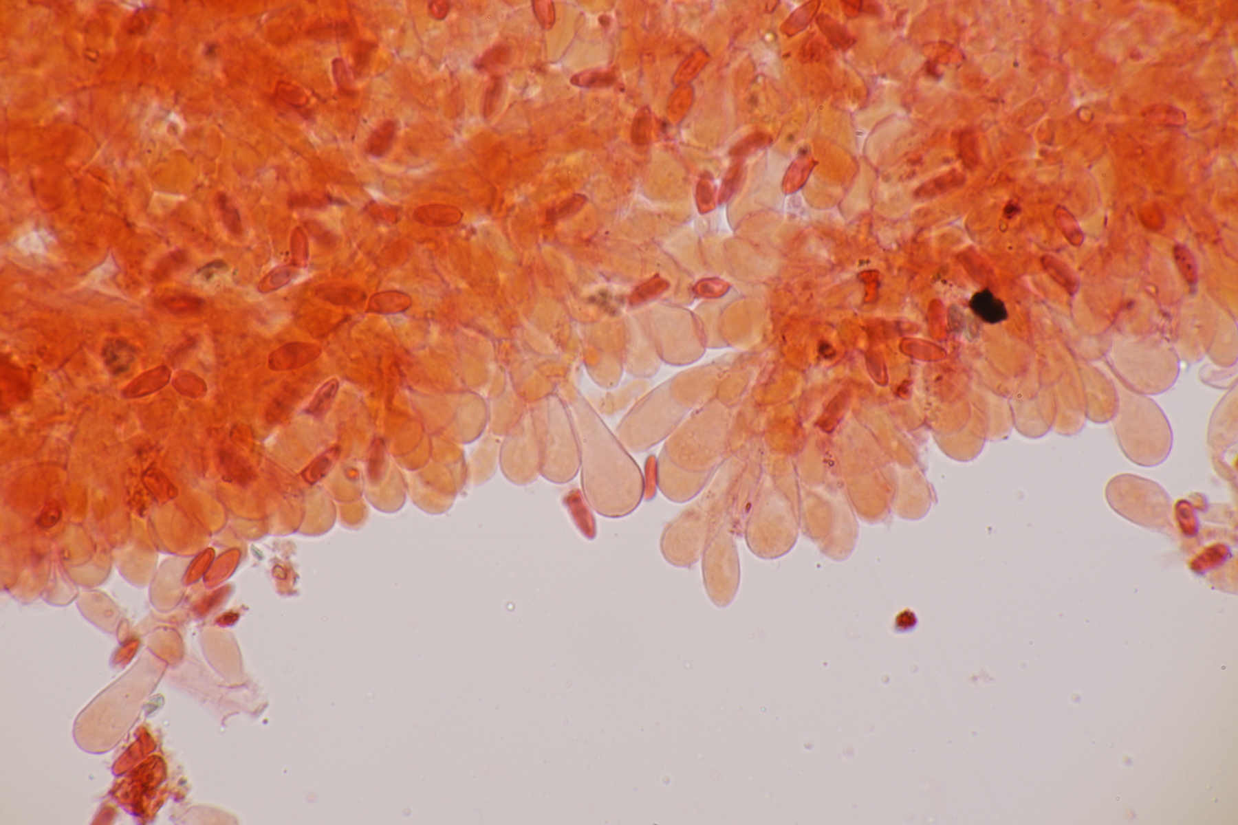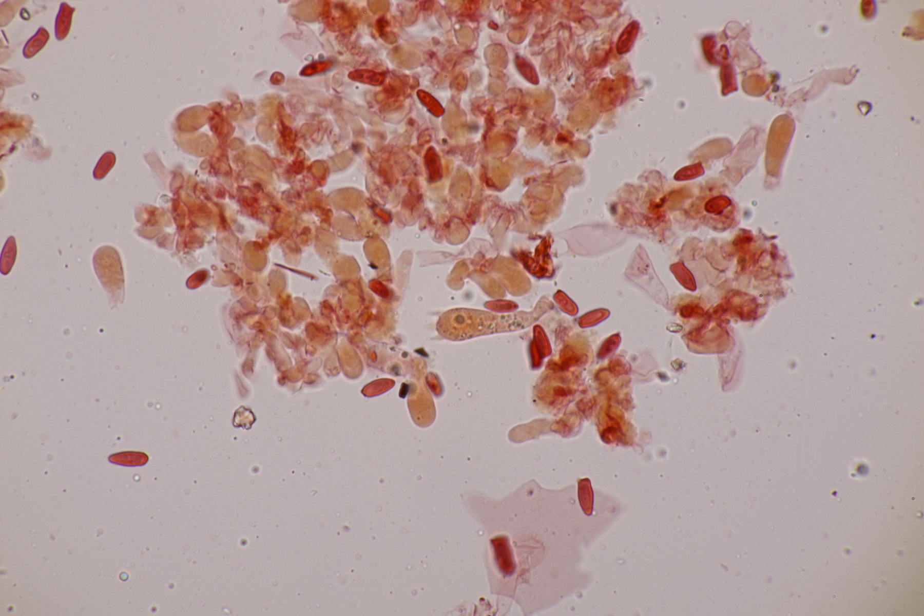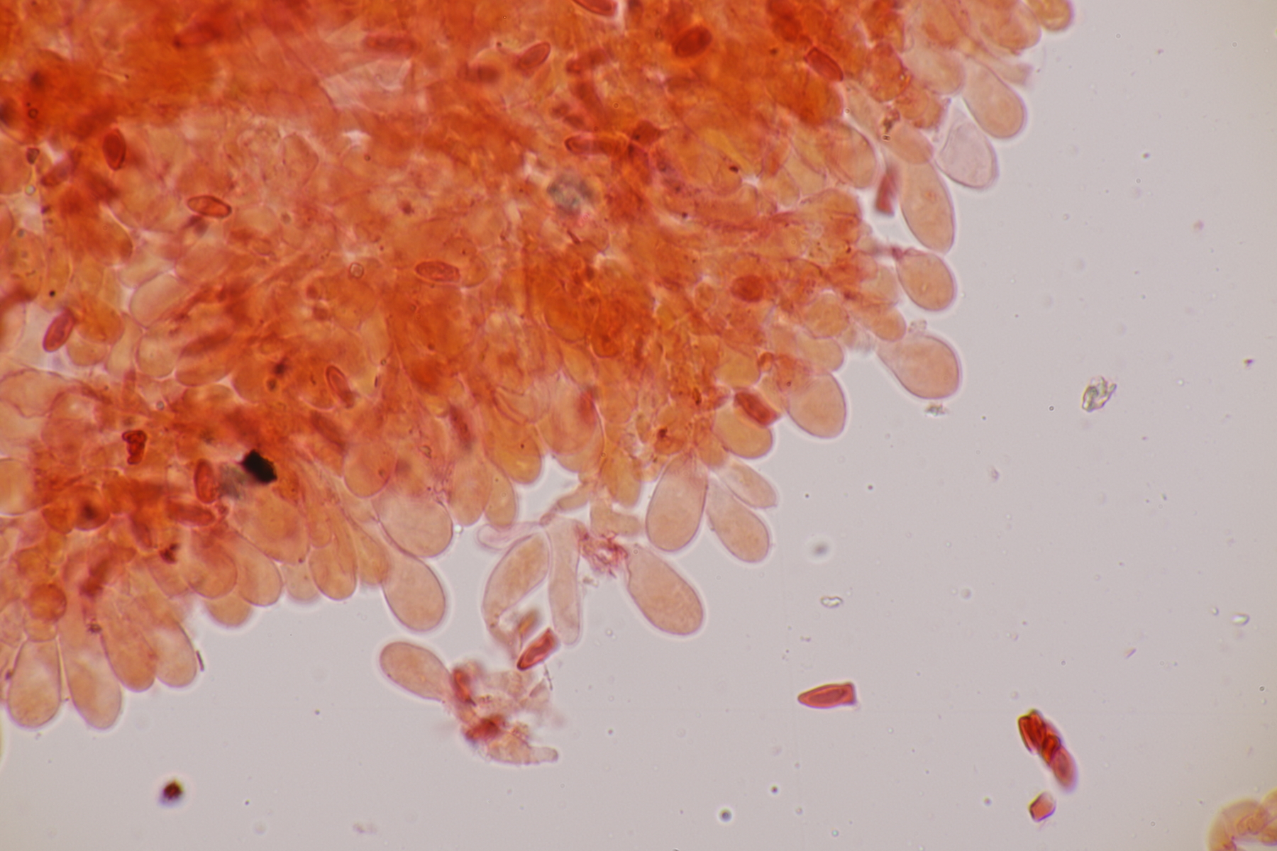 5. Und die nächste Lepiota, diesmal auf einer mageren Freifläche wachsend. Sporen 13.2-15.6 x 6.2-7.9, Q=2.0-2.3, nicht projektilförmig. Da bleiben dann im Gröger L. oreadiformis und L. erminea in der engeren Auswahl. Ich tendiere zu erster Art. Was meint Ihr? Auffallend war, daß die Zellen im Huthautpräparat einen rötlichen Touch bekamen, als ich das Präparat etwas gequetscht habe.