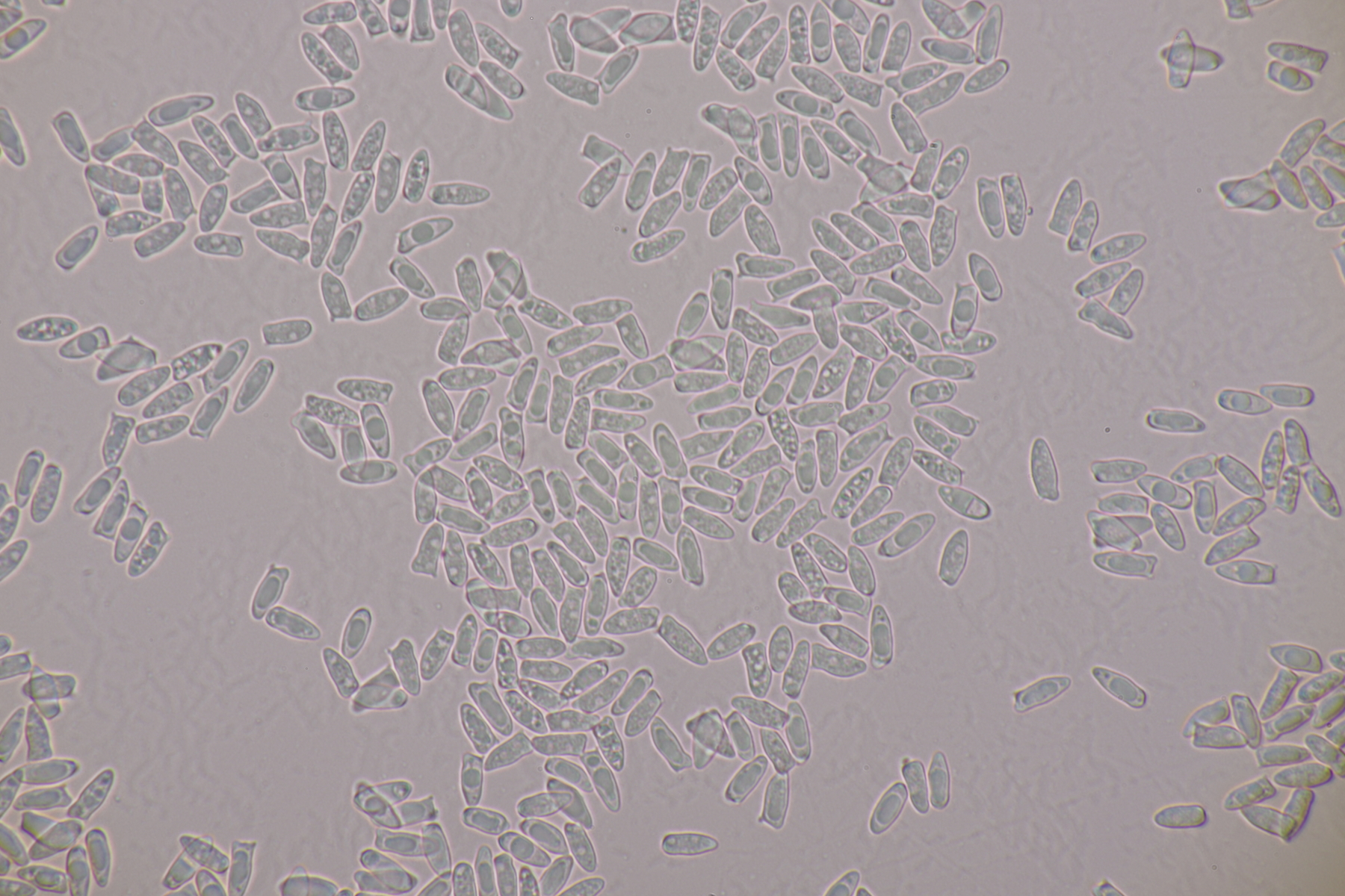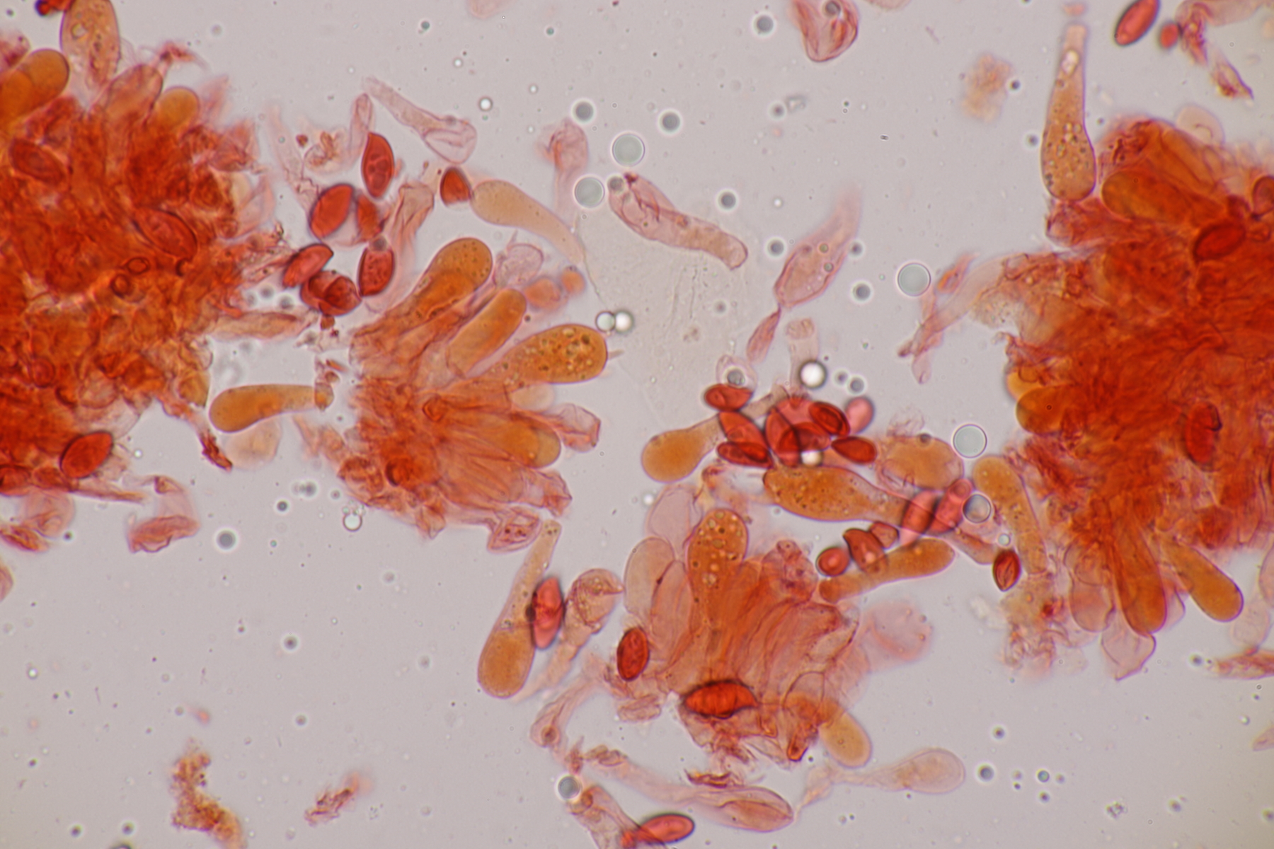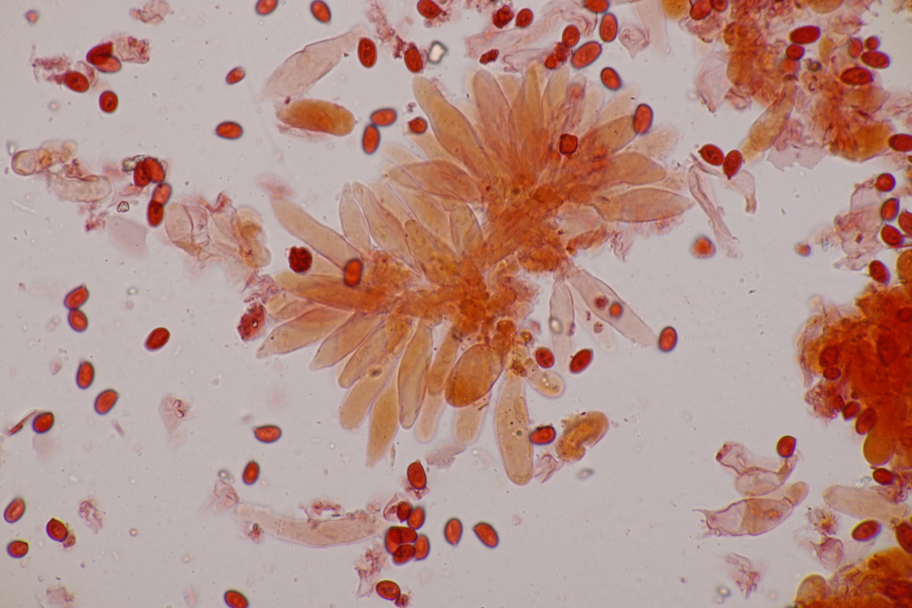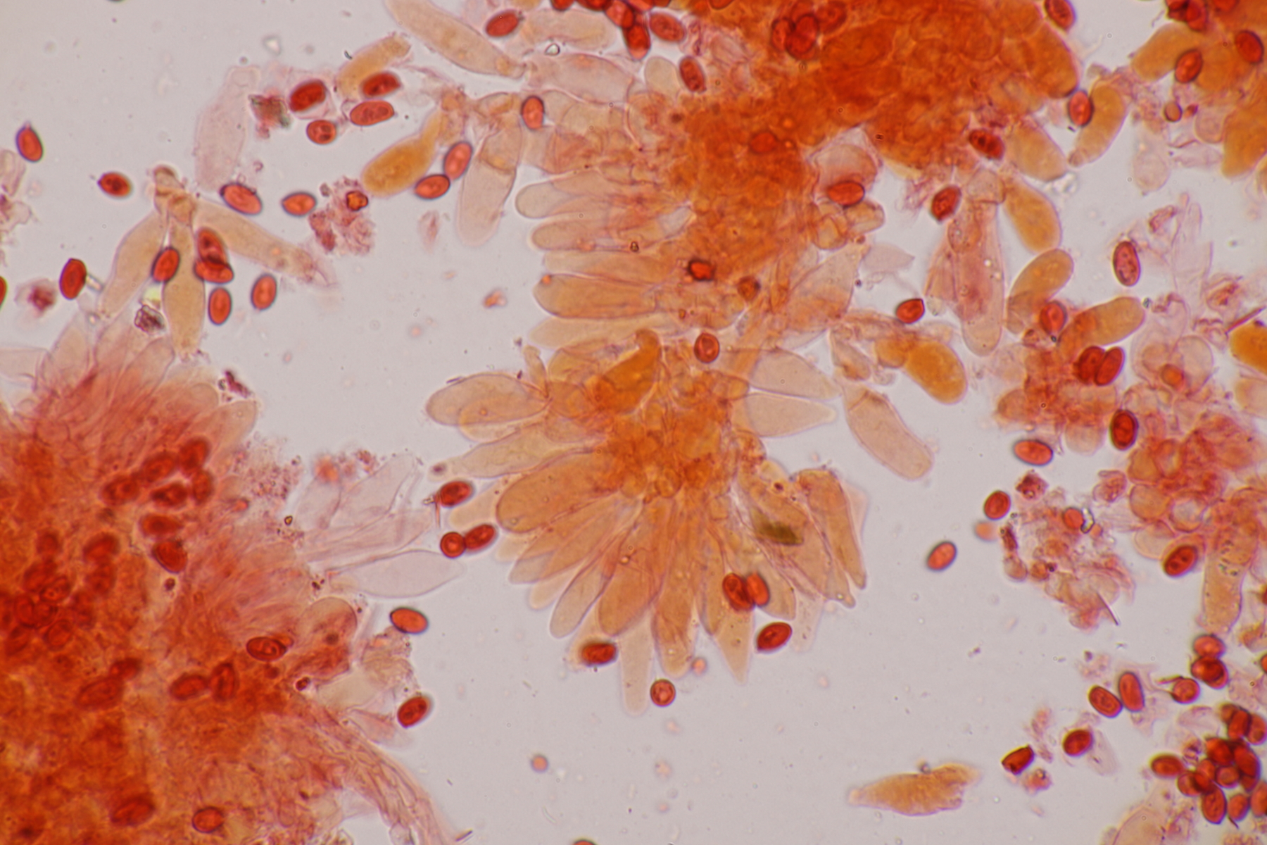 5. Und die nächste Lepiota, diesmal auf einer mageren Freifläche wachsend. Sporen 13.2-15.6 x 6.2-7.9, Q=2.0-2.3, nicht projektilförmig. Da bleiben dann im Gröger L. oreadiformis und L. erminea in der engeren Auswahl. Ich tendiere zu erster Art. Was meint Ihr? Auffallend war, daß die Zellen im Huthautpräparat einen rötlichen Touch bekamen, als ich das Präparat etwas gequetscht habe.