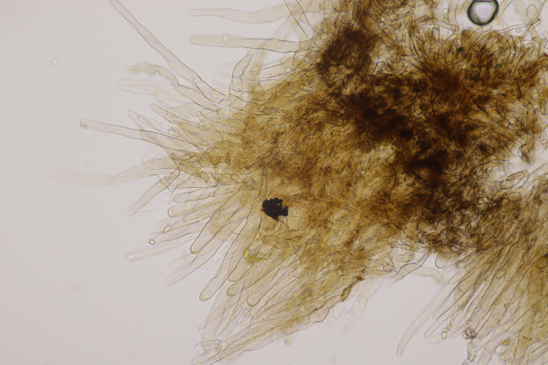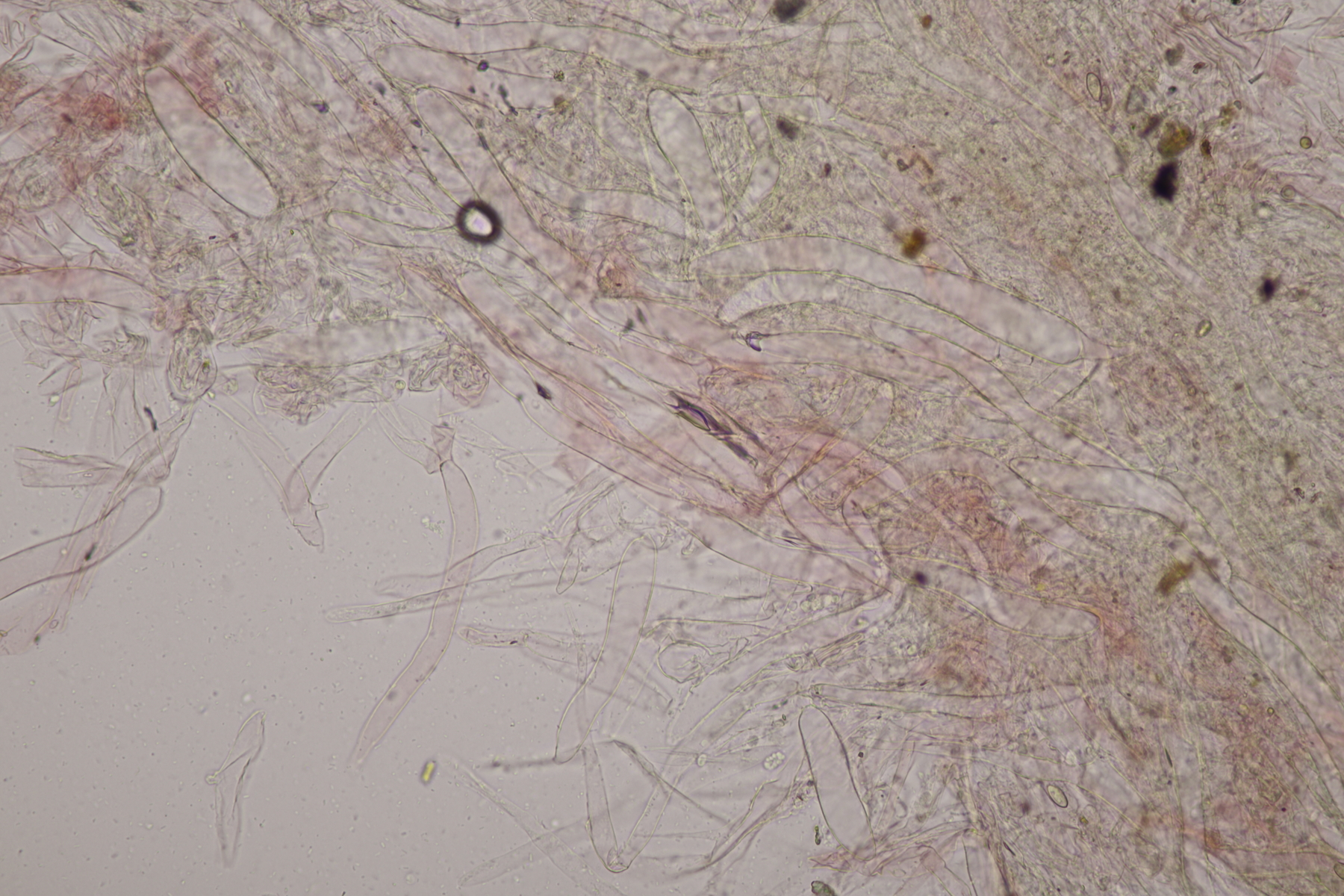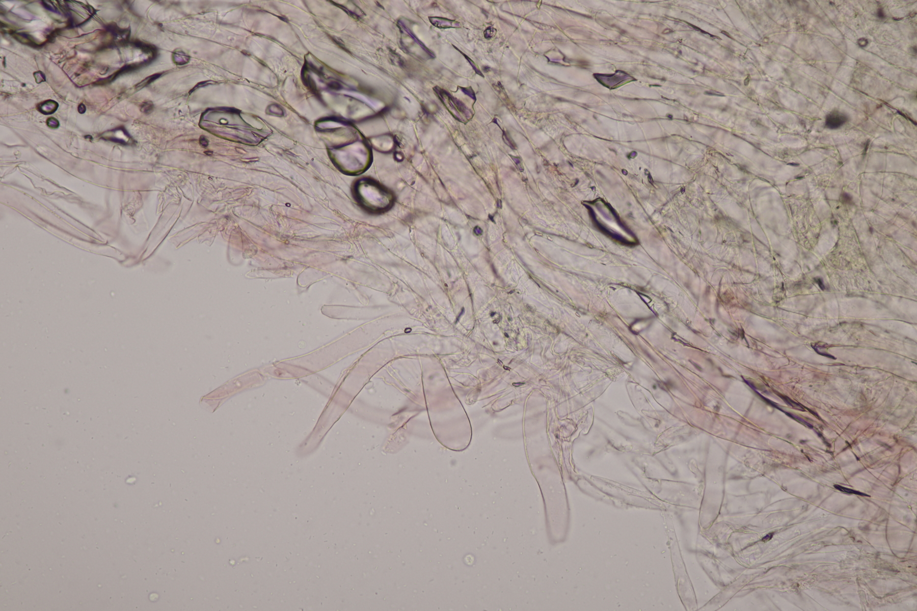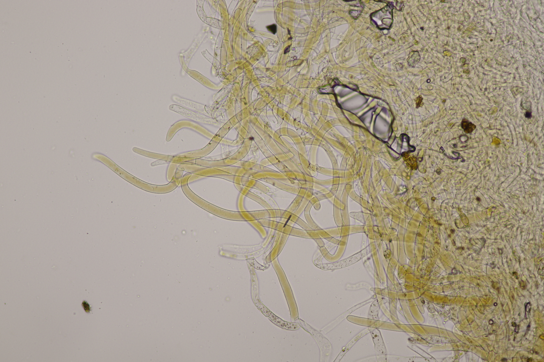 13. Und noch eine Lepiota zum Abschluß. Sporen 7.2-8.6 x 4.2-5.1, Q=1.5-1.9, Huthautzellen gute 250 µm lang. Lepiota pseudolilacea?