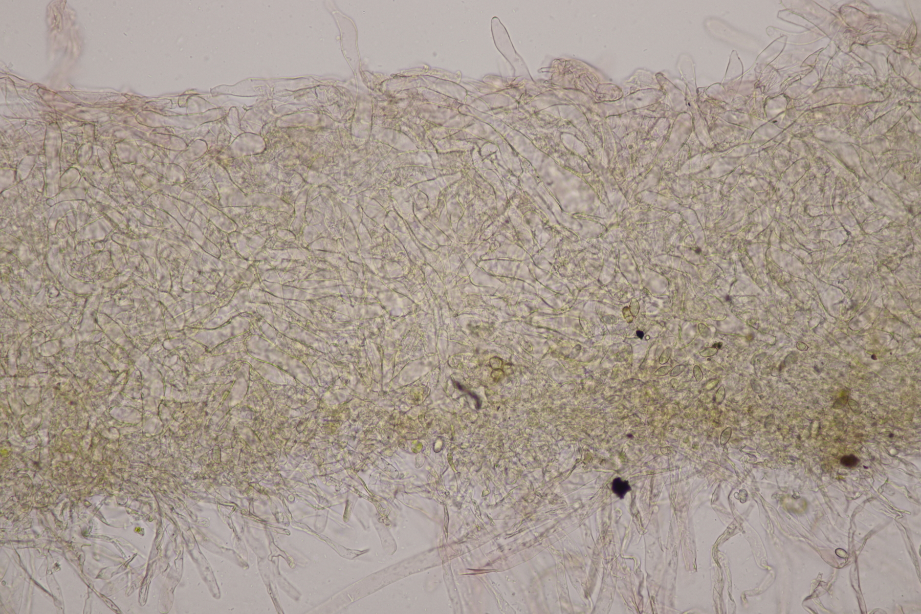 10. Eine Entoloma im Rasen unter Populus ohne besonderen Geruch. Basidien 4-sporig mit Basalschnalle, Lamellentrama mit Schnallen, keine Zystiden, Huthaut mit intrazellulärem Pigment und Schnallen, Sporen 9.0-11.0 x 6.6-8.9, Q=1.1-1.5, 9.8 x 7.5, Q=1.3. So wirklich komme ich da nicht zu einem Ergebnis und bin mir schon Erschlüsseln des richtigen Schlüssels in der Funga Nordica unsicher. Eventuell Entoloma rhodopolium?