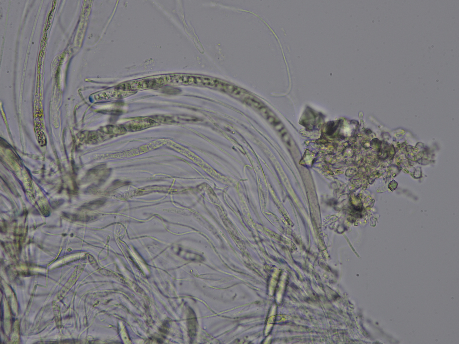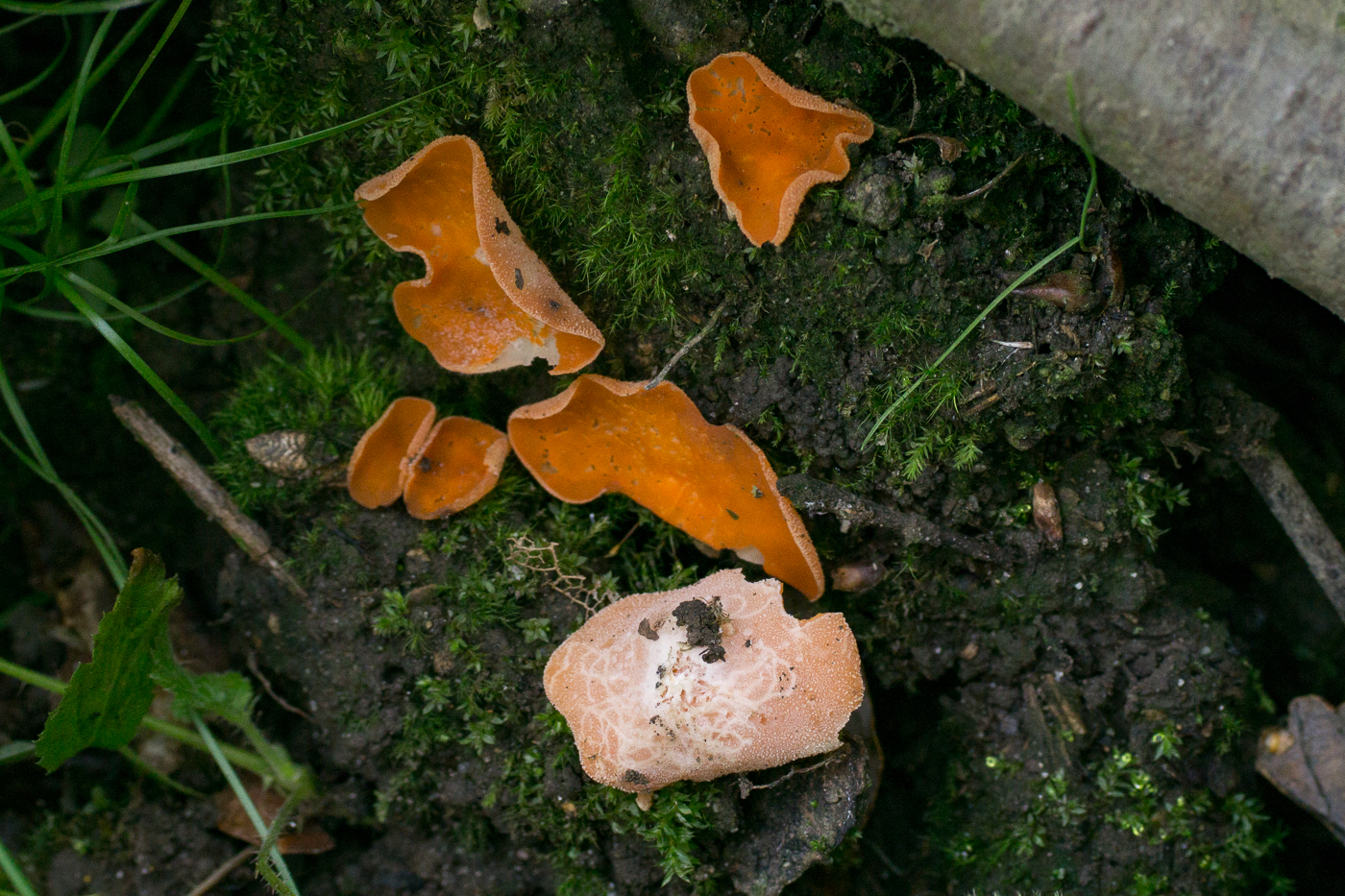 1. Diese hübschen kleinen, gelben Becherlinge wuchsen gesellig auf dem Boden in einem Laubwald an feuchter Stelle zwischen viel Totholz. Habe ich bisher noch nicht gefunden. Beim Blättern in FotE würde mir Aleuria aurantia ins Auge springen, aber ist vermutlich mikropflichtig?