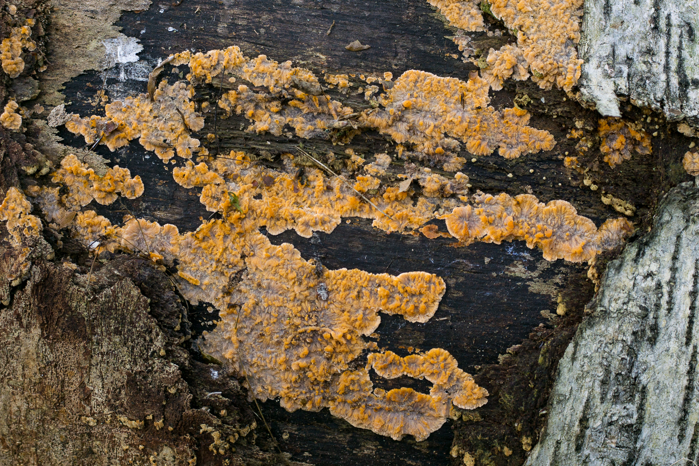 3. Von diesen Pilzen habe ich auch keine Ahnung, aber beim Blättern gefiele mir Phlebia radiata ganz gut. Auf Birken öfters mal zu sehen.