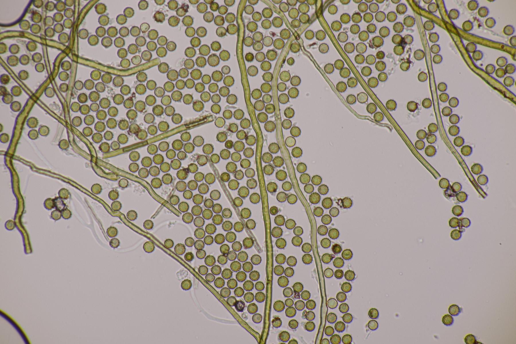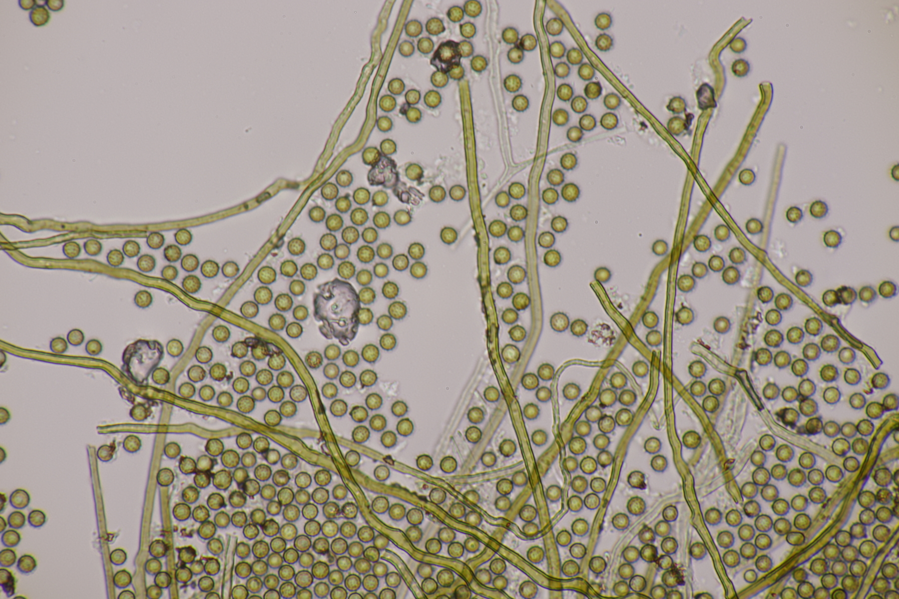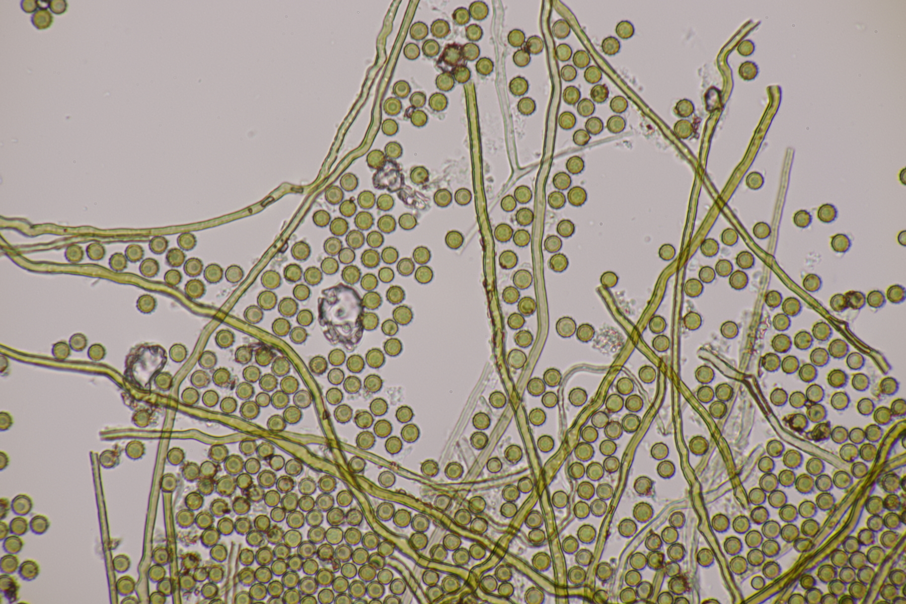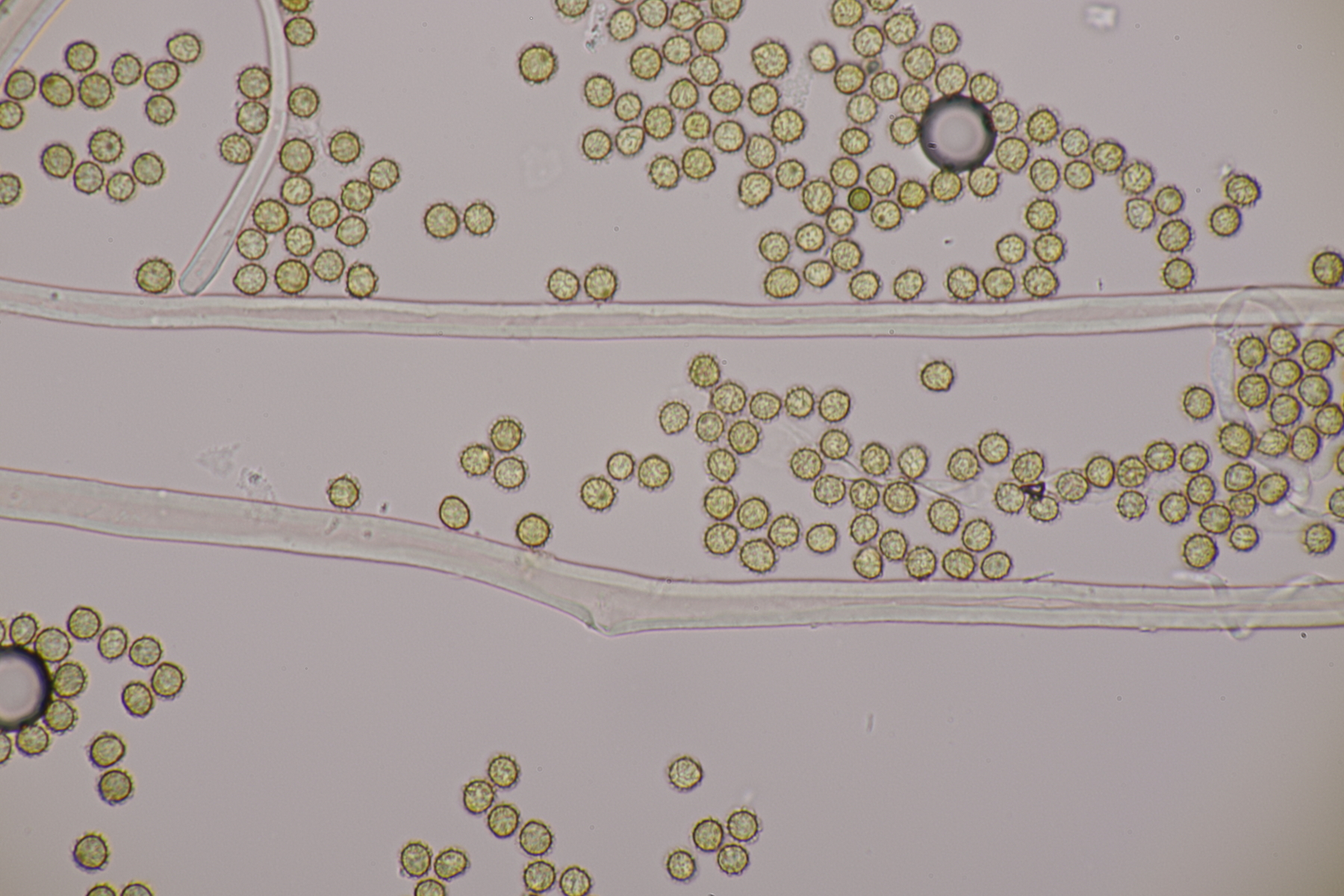 1. Ein Bovist mit Sporen von 3.5-4.7 µm, ohne Pedicel, Capillitium mit zahlreichen Poren. Damit bleiben grundsätzlich nicht mehr viele Arten übrig und mit dem Standort in der Heide kommen nur noch B. aestivalis und B. furfuracea in die Endausscheidung. Ein zu Hause durchgeschnittener Fruchtkörper hat dann eine Subgleba offenbart, so daß ich bei B. aestivalis lande.