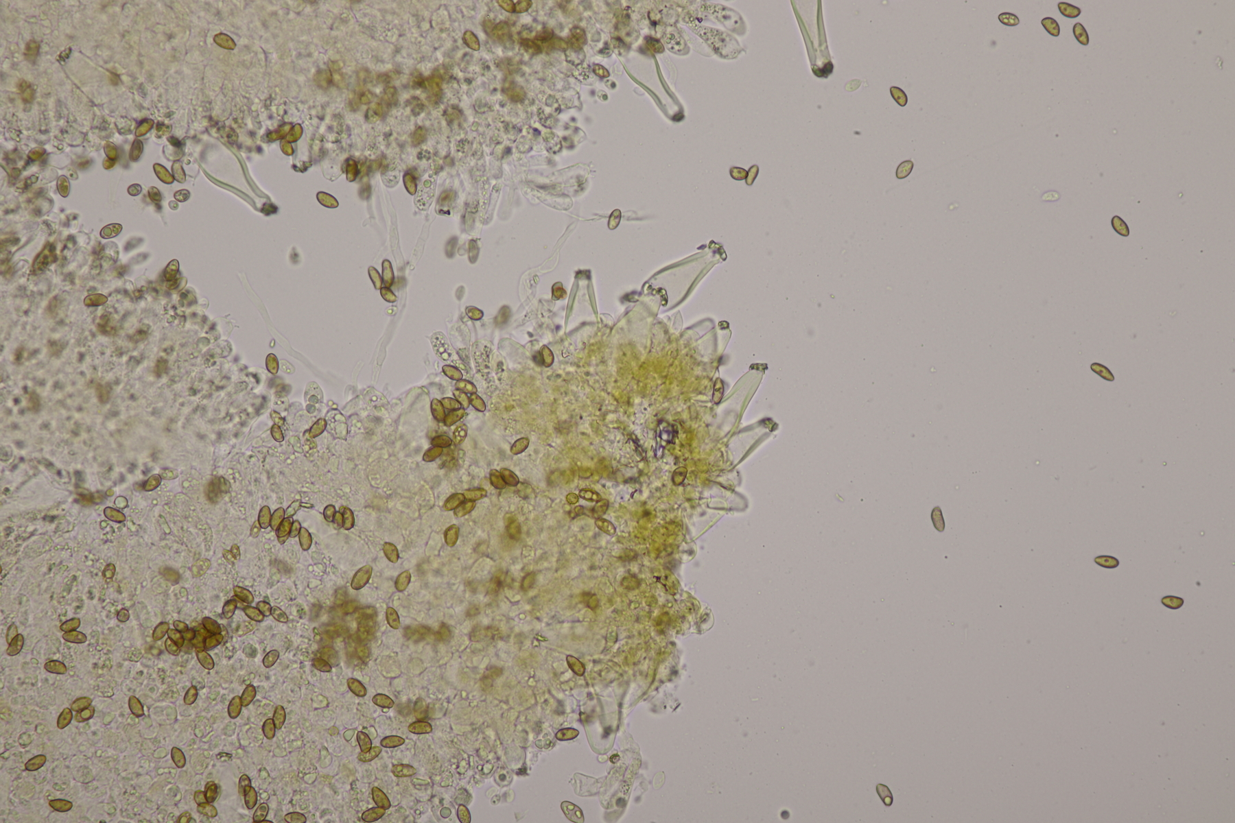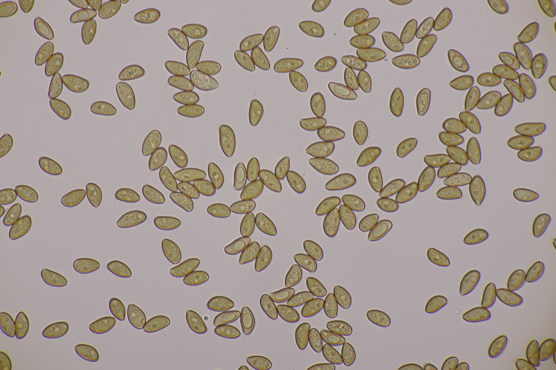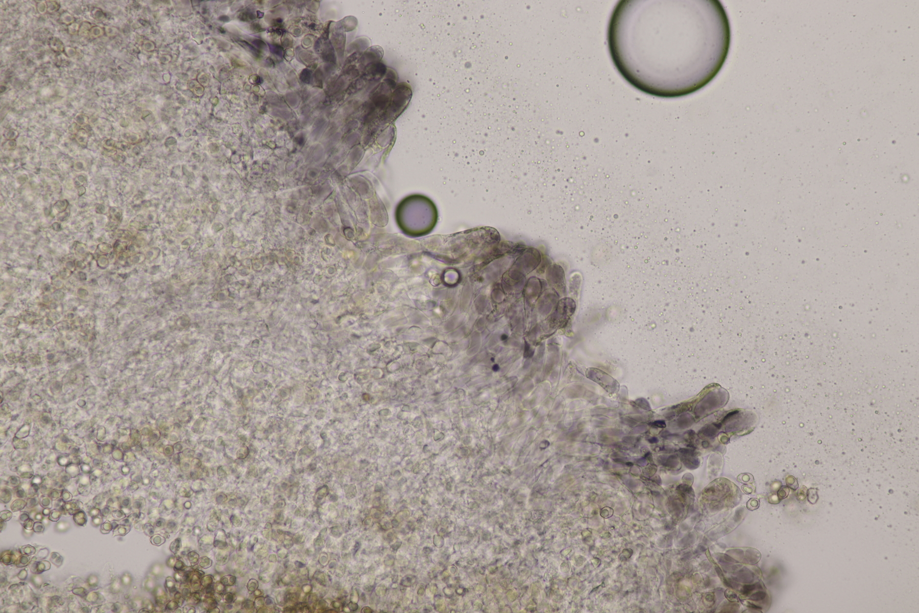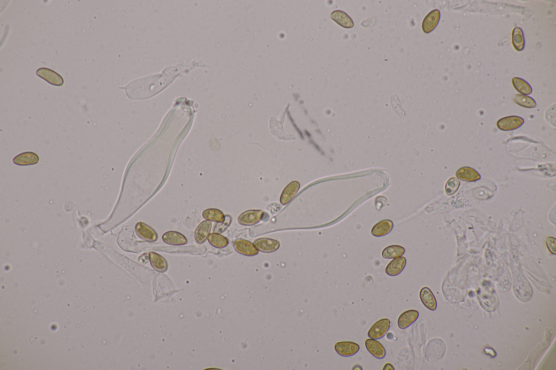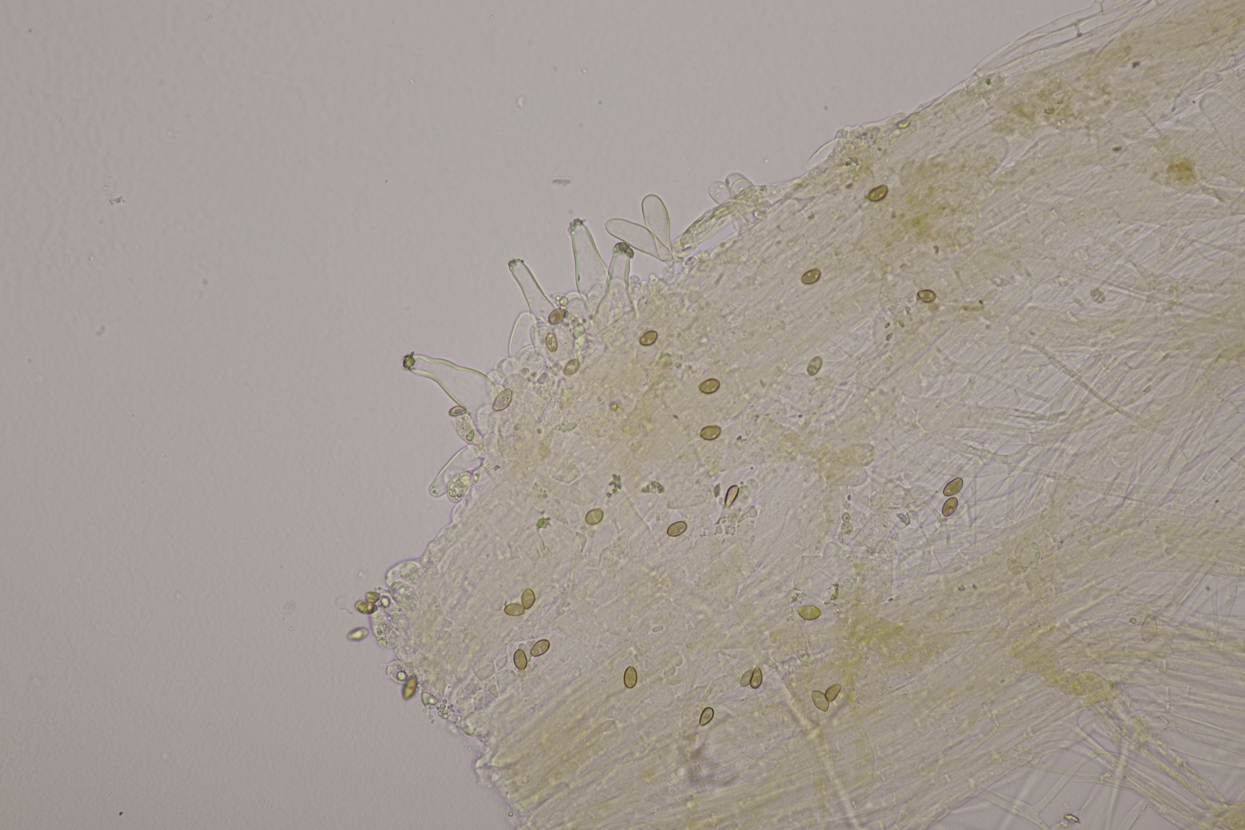 3. Eine Leptonie, die Jan-Arne mir in die Hand gedrückt hat....mit typischer Serrulatum-Schneide, ohne Schnallen, Sporen 8.2-10.0 µm x 6.0-7.1 µm, Q=1.2-1.5, im Mittel 8.8 x 6.6, Q=1.4. Dann bleibt wieder die leidige Frage nach den Farben. Auf den Fotos meint man wieder einen leichten Blauschimmer zu erkennen, aber im Feld war auch bei jungen Fruchtkörpern nicht unbedingt mit Sicherheit ein Blauton zu erkennen und konnte allenfalls erahnt werden. Ein weiterer Fall von Entoloma sp.?