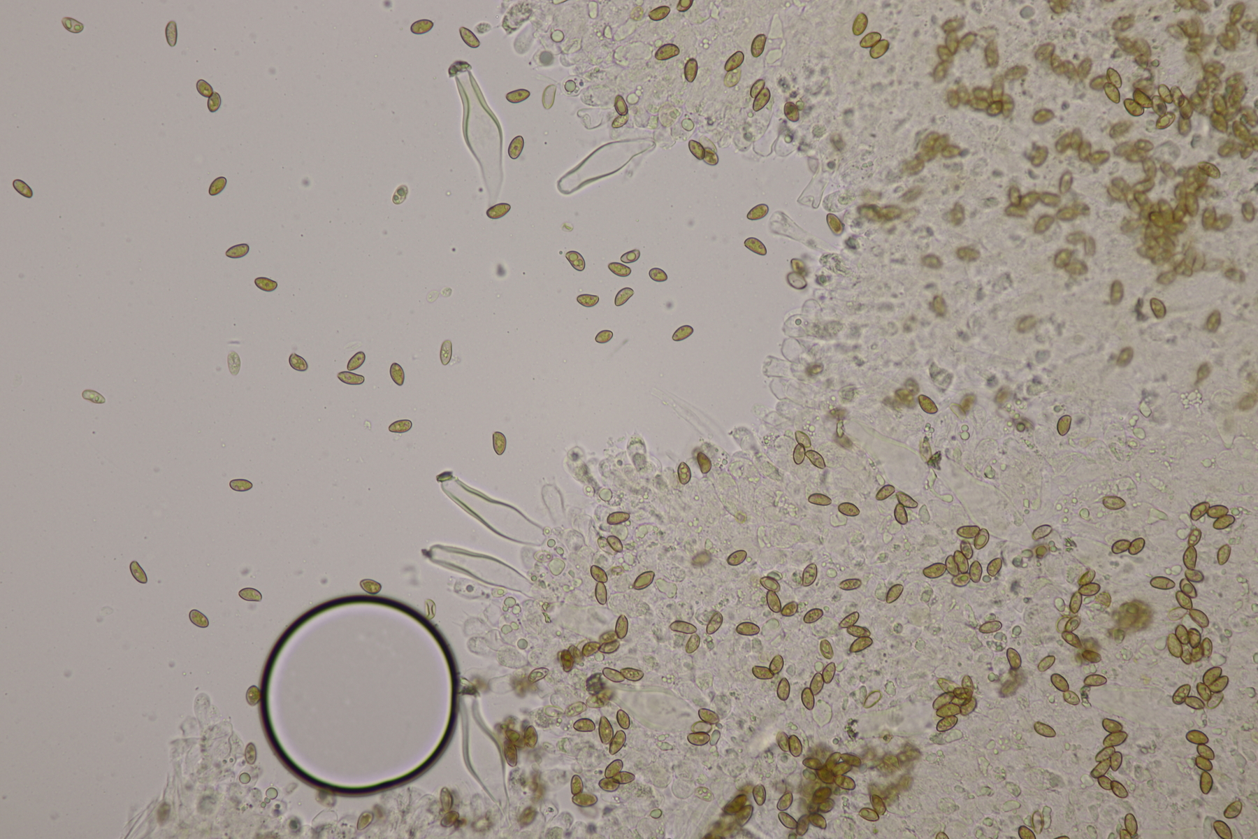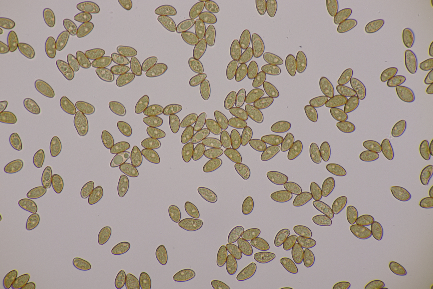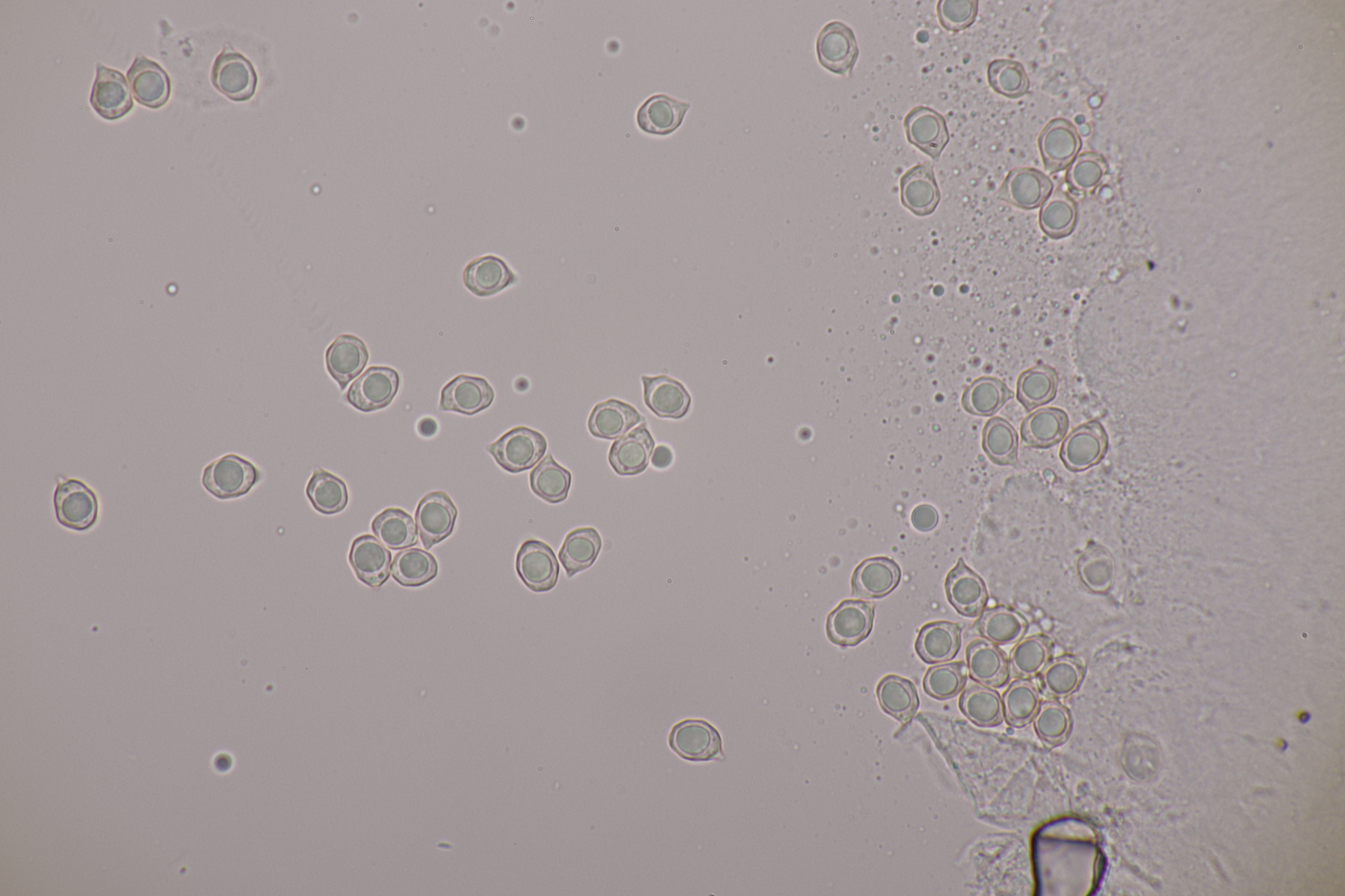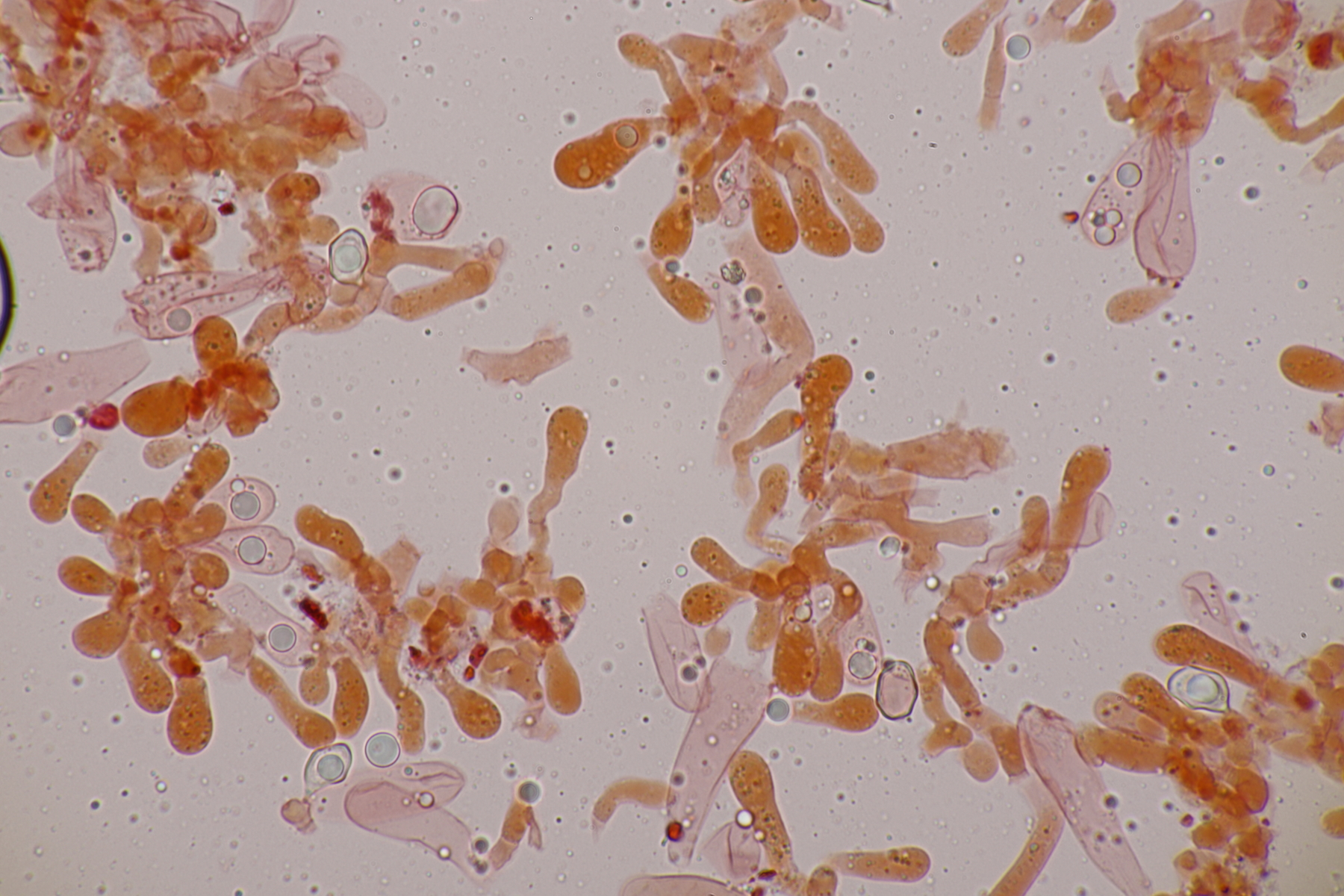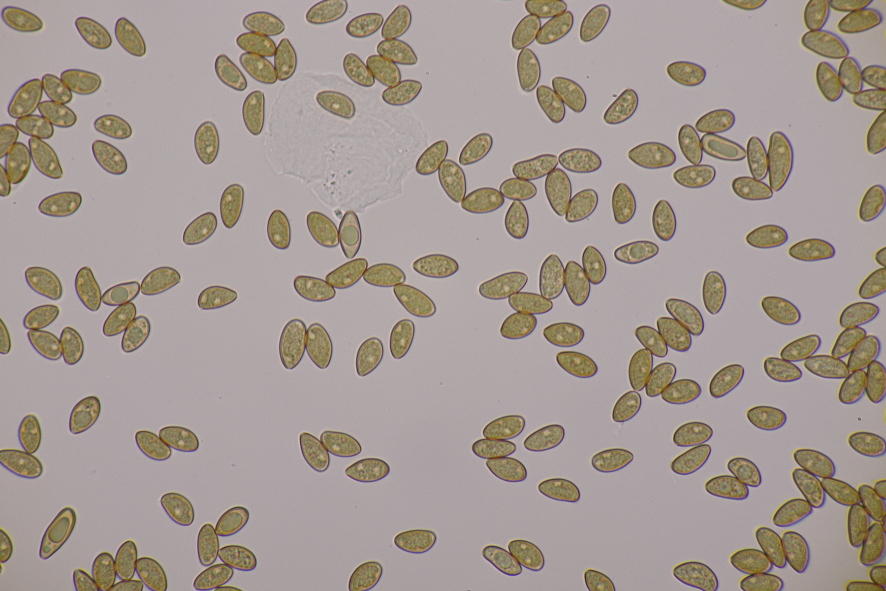 3. Eine Leptonie, die Jan-Arne mir in die Hand gedrückt hat....mit typischer Serrulatum-Schneide, ohne Schnallen, Sporen 8.2-10.0 µm x 6.0-7.1 µm, Q=1.2-1.5, im Mittel 8.8 x 6.6, Q=1.4. Dann bleibt wieder die leidige Frage nach den Farben. Auf den Fotos meint man wieder einen leichten Blauschimmer zu erkennen, aber im Feld war auch bei jungen Fruchtkörpern nicht unbedingt mit Sicherheit ein Blauton zu erkennen und konnte allenfalls erahnt werden. Ein weiterer Fall von Entoloma sp.?