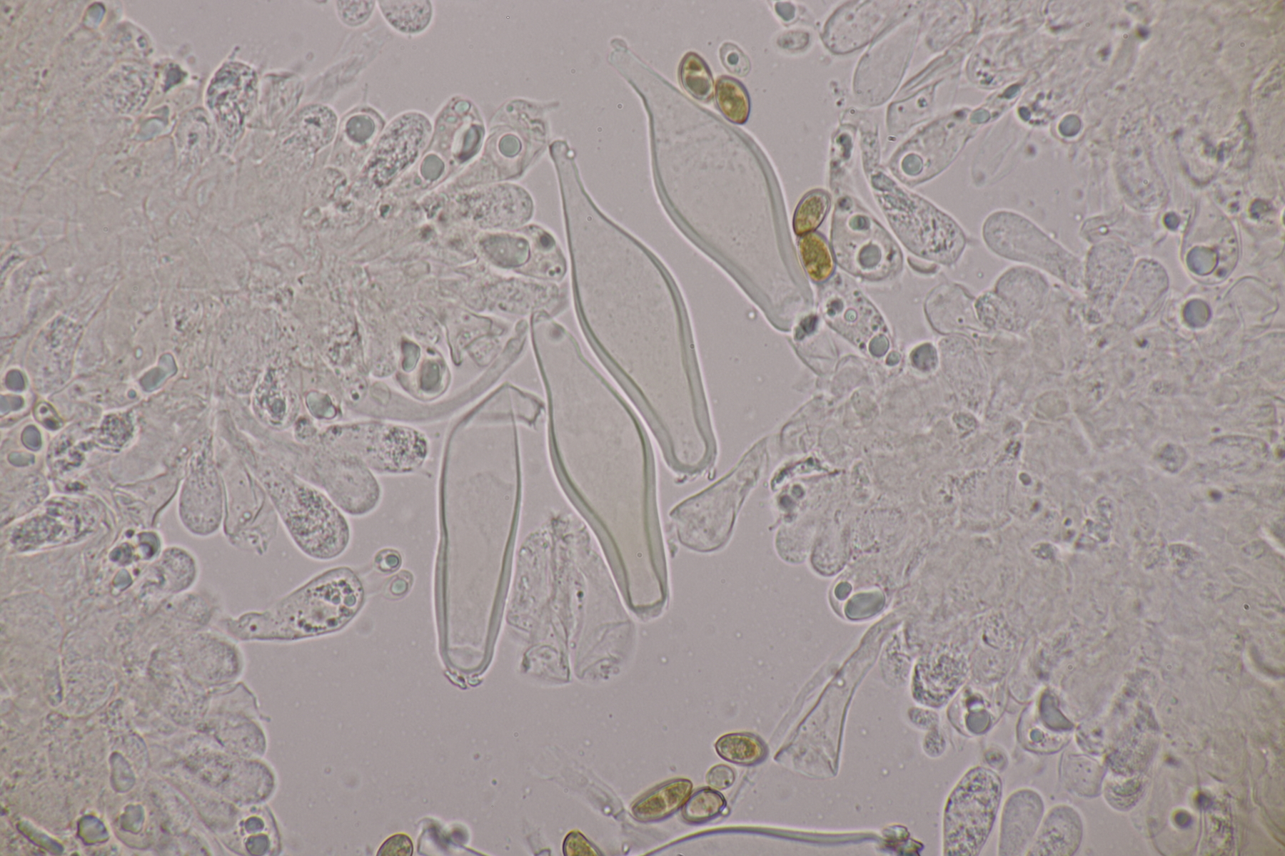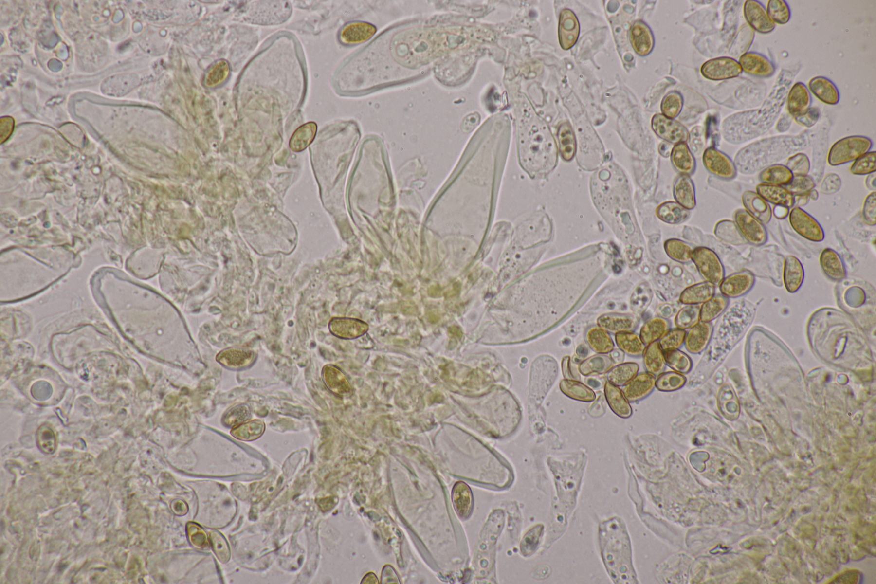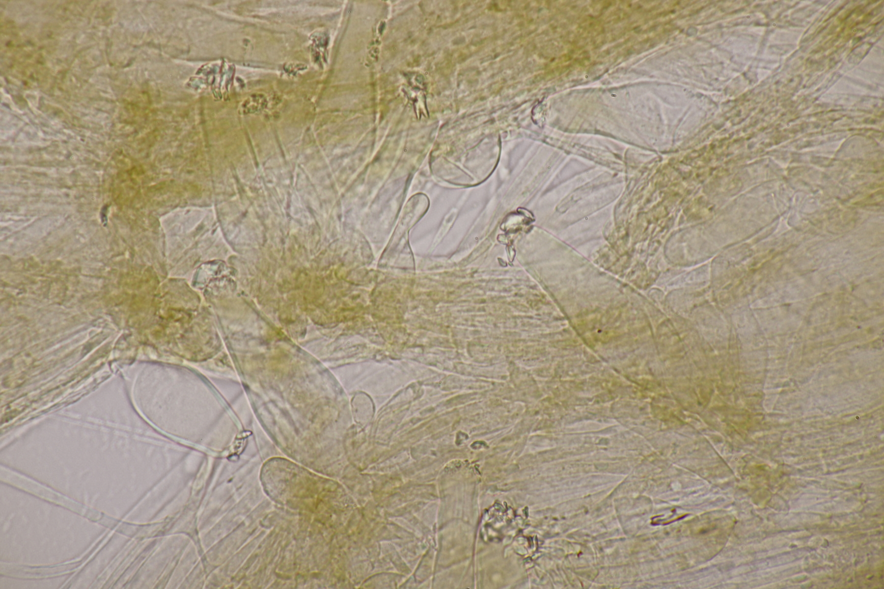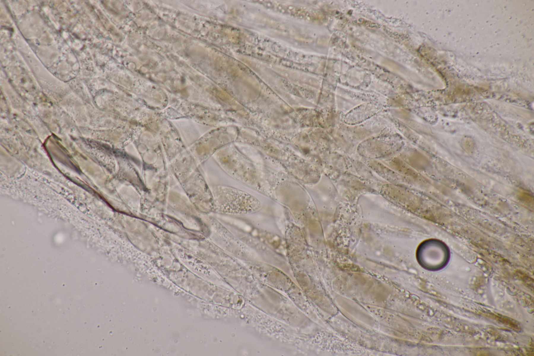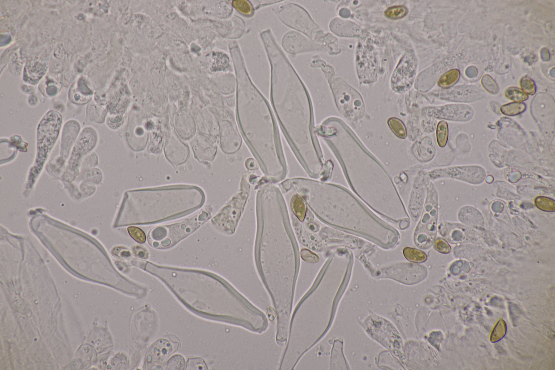 4. Und dann noch eine Inocybe, die in an einer Stelle in großer Zahl wuchs. Der Boden war sandig, sauer und es wuchsen Kiefern als Begleitbäume. Alle Zystiden dickwandig mit Kristallschopf, Basidien 4-sporig, Geruch schwach spermatisch, Sporen 10.0-12.8 x 4.8-6.5, Q=1.7-2.3, bzw. 11.0+-0.8 x 5.5+-0.5, Q=2.0+-0.2, Cheilo- und Pleurozystiden messen 57-62 x 16-19 µm. Caulozystiden sind im oberen Stielbereich vorhanden, wobei ich allerdings nicht zu entscheiden vermag, ob das nun nur am obersten Zehntel oder am obersten Drittel der Fall ist. Bei einem jungen Fruchtkörper scheint es eher ein Drittel zu sein, bei den älteren Fruchtkörper eher nur ein Zehntel. Wenn ich dann mit der Funga Nordica schlüssel, lande ich bei der Sect. Tardae nirgendwo. Bei der Sect. Fibrillosae wäre Inocybe exilis oder Inocybe abjecta zumindest von der Sporengröße her passend. Die sind aber auf inocybe.org (noch) nicht vertreten, so daß mir da ein guter Vergleich fehlt und ich einfach mal Ditte um Rißpilzbeistand bitte.