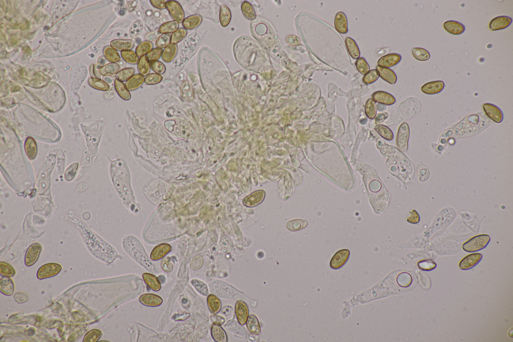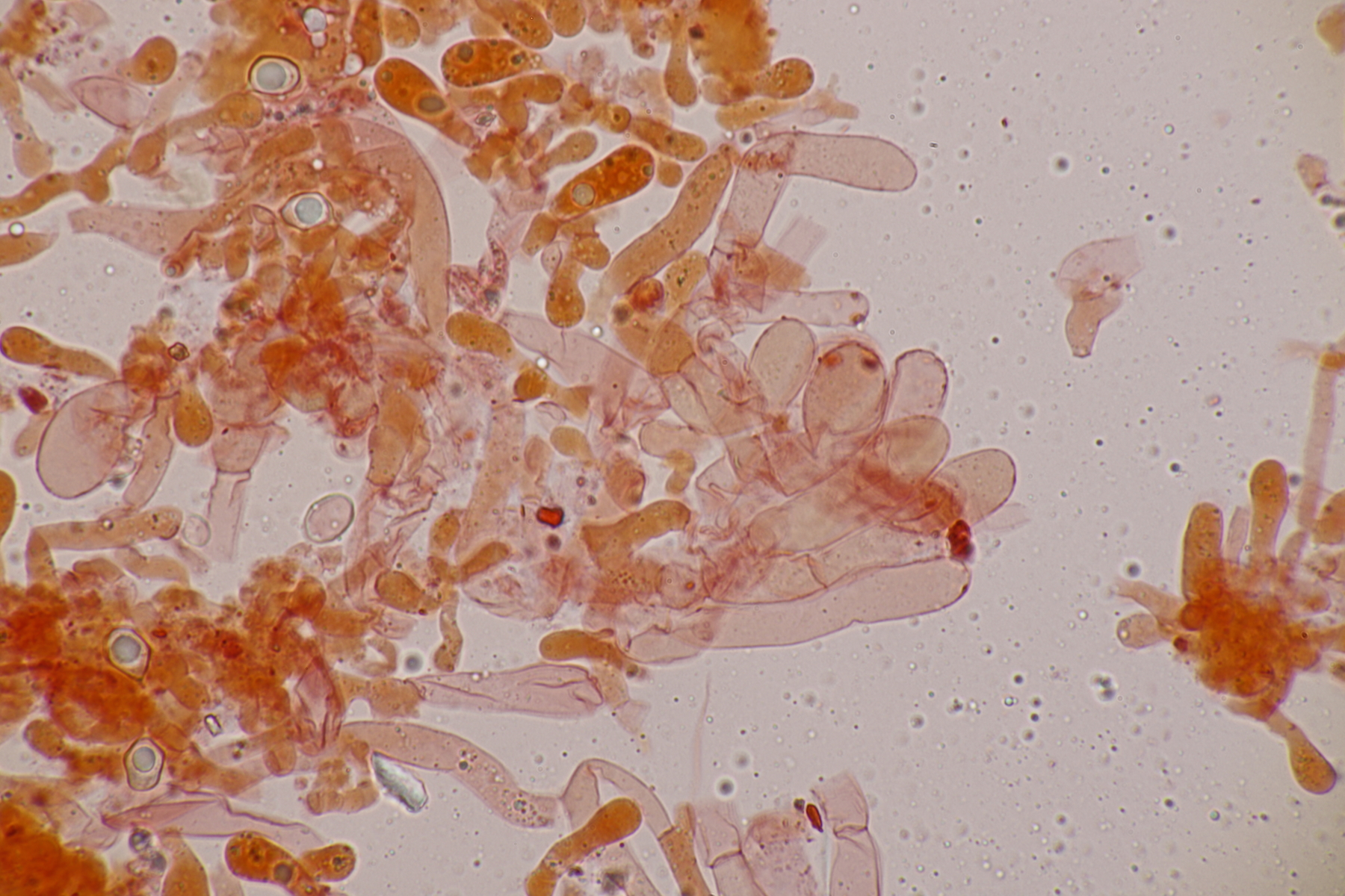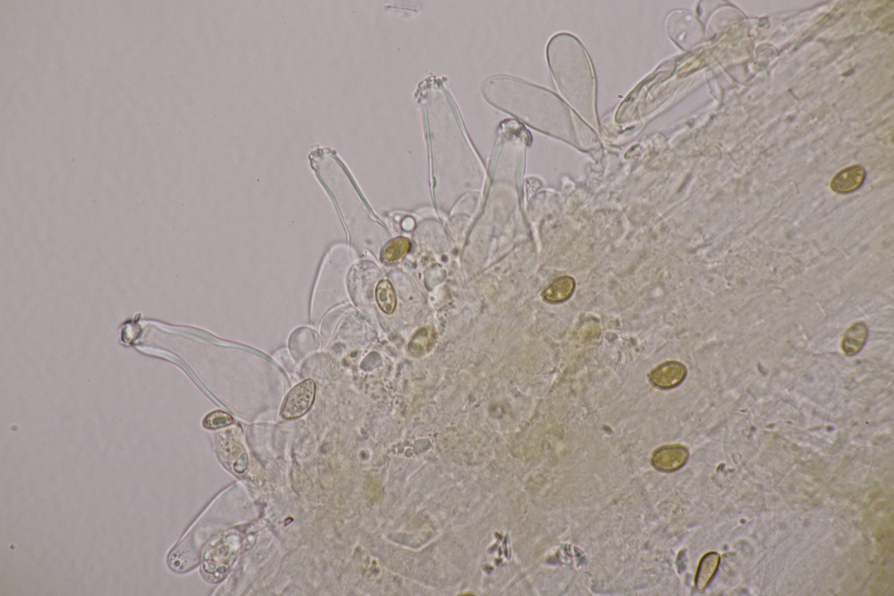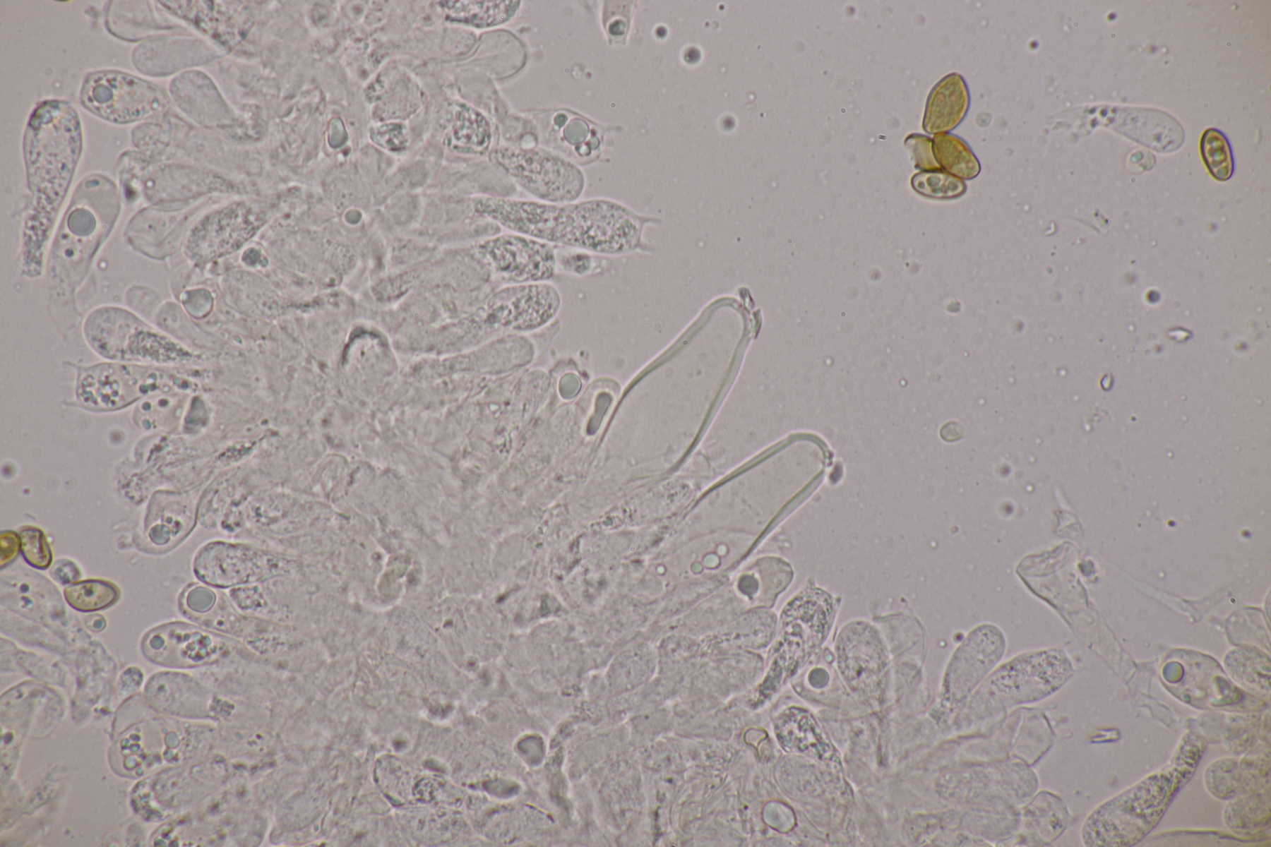 4. Und dann noch eine Inocybe, die in an einer Stelle in großer Zahl wuchs. Der Boden war sandig, sauer und es wuchsen Kiefern als Begleitbäume. Alle Zystiden dickwandig mit Kristallschopf, Basidien 4-sporig, Geruch schwach spermatisch, Sporen 10.0-12.8 x 4.8-6.5, Q=1.7-2.3, bzw. 11.0+-0.8 x 5.5+-0.5, Q=2.0+-0.2, Cheilo- und Pleurozystiden messen 57-62 x 16-19 µm. Caulozystiden sind im oberen Stielbereich vorhanden, wobei ich allerdings nicht zu entscheiden vermag, ob das nun nur am obersten Zehntel oder am obersten Drittel der Fall ist. Bei einem jungen Fruchtkörper scheint es eher ein Drittel zu sein, bei den älteren Fruchtkörper eher nur ein Zehntel. Wenn ich dann mit der Funga Nordica schlüssel, lande ich bei der Sect. Tardae nirgendwo. Bei der Sect. Fibrillosae wäre Inocybe exilis oder Inocybe abjecta zumindest von der Sporengröße her passend. Die sind aber auf inocybe.org (noch) nicht vertreten, so daß mir da ein guter Vergleich fehlt und ich einfach mal Ditte um Rißpilzbeistand bitte.