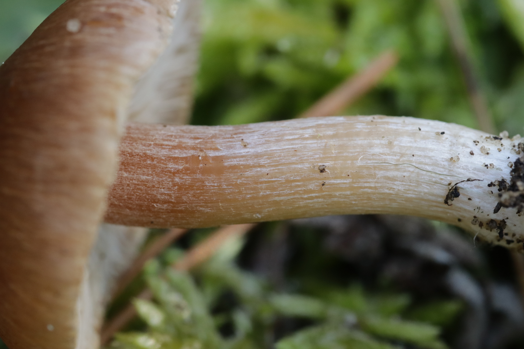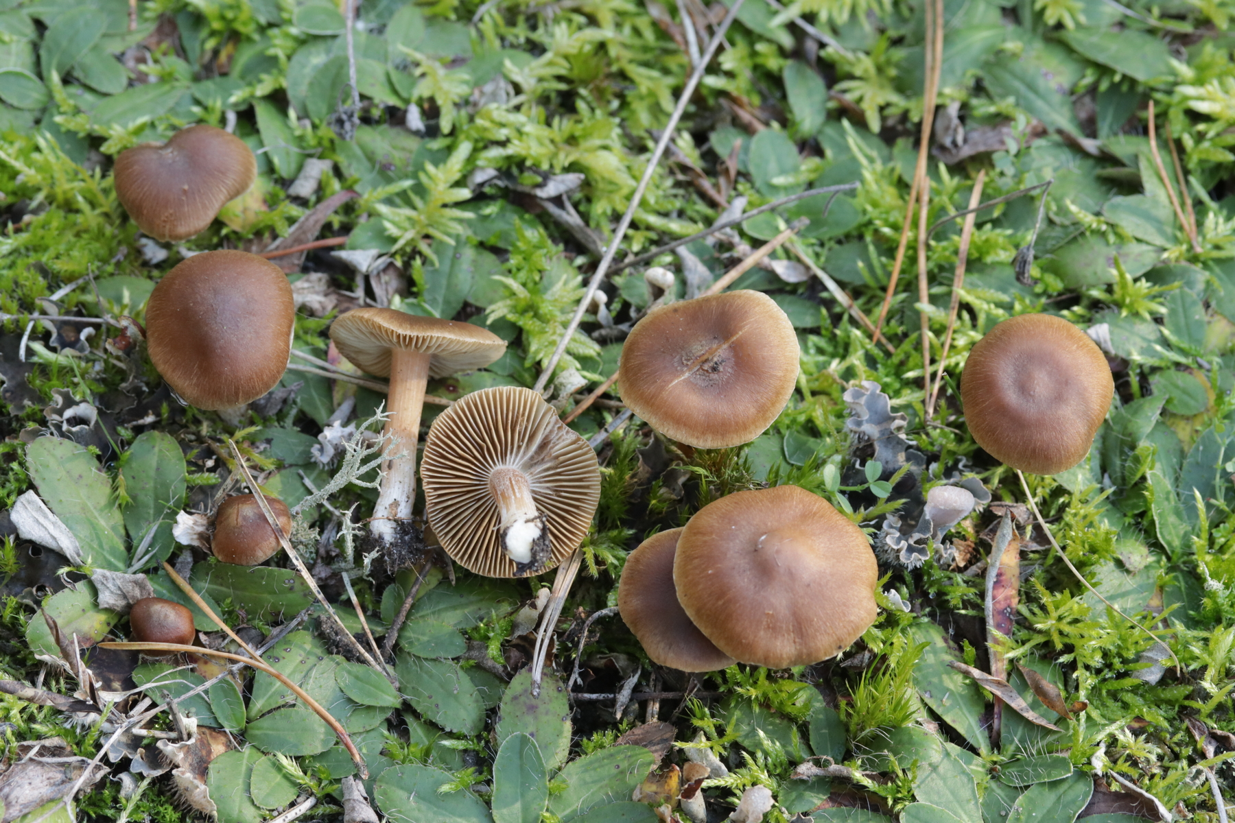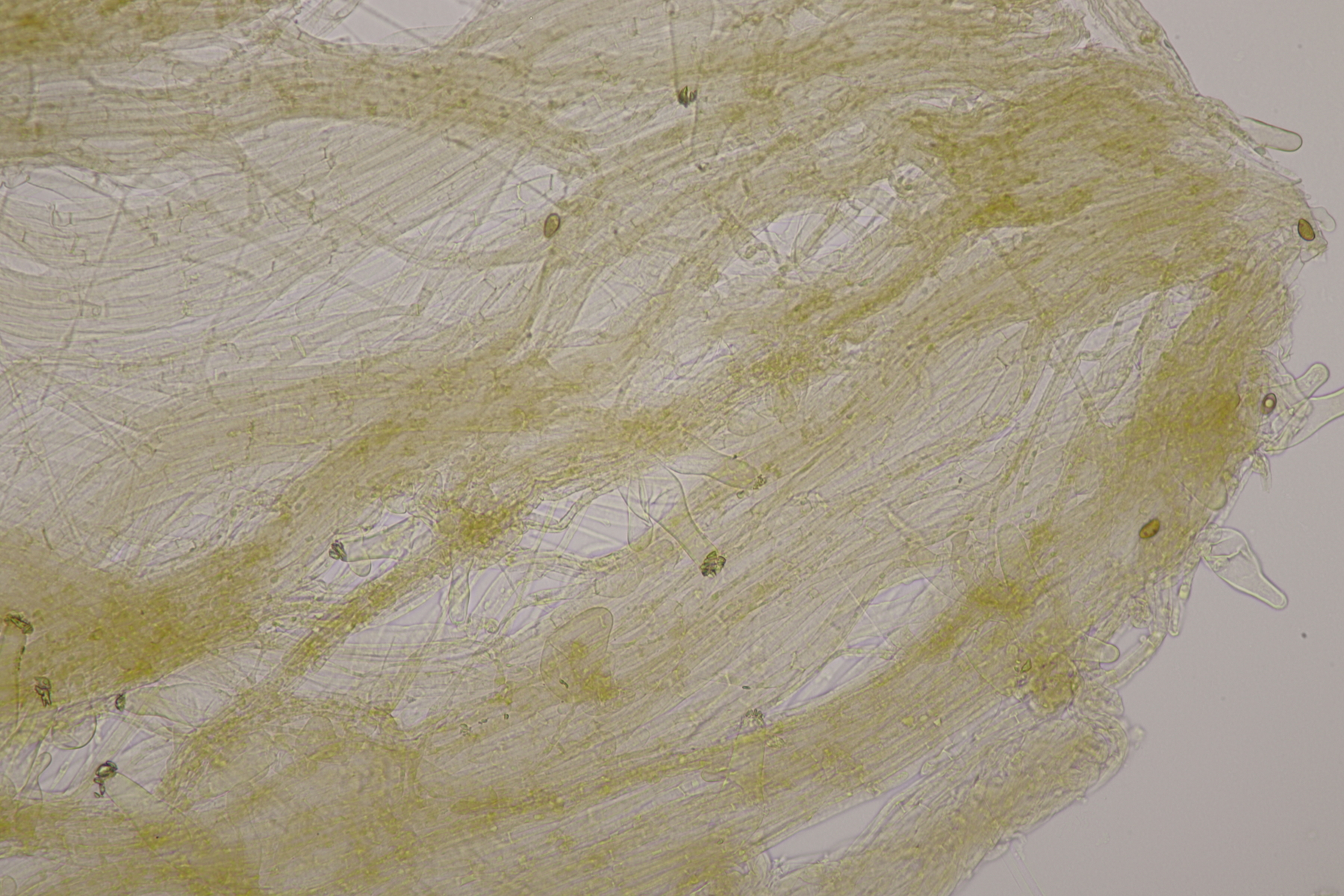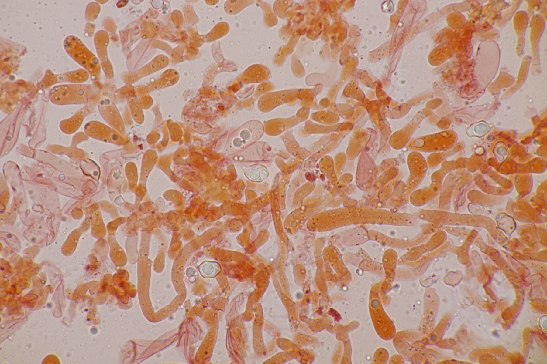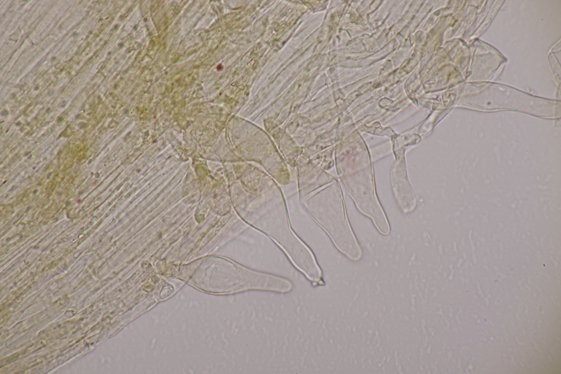 4. Und dann noch eine Inocybe, die in an einer Stelle in großer Zahl wuchs. Der Boden war sandig, sauer und es wuchsen Kiefern als Begleitbäume. Alle Zystiden dickwandig mit Kristallschopf, Basidien 4-sporig, Geruch schwach spermatisch, Sporen 10.0-12.8 x 4.8-6.5, Q=1.7-2.3, bzw. 11.0+-0.8 x 5.5+-0.5, Q=2.0+-0.2, Cheilo- und Pleurozystiden messen 57-62 x 16-19 µm. Caulozystiden sind im oberen Stielbereich vorhanden, wobei ich allerdings nicht zu entscheiden vermag, ob das nun nur am obersten Zehntel oder am obersten Drittel der Fall ist. Bei einem jungen Fruchtkörper scheint es eher ein Drittel zu sein, bei den älteren Fruchtkörper eher nur ein Zehntel. Wenn ich dann mit der Funga Nordica schlüssel, lande ich bei der Sect. Tardae nirgendwo. Bei der Sect. Fibrillosae wäre Inocybe exilis oder Inocybe abjecta zumindest von der Sporengröße her passend. Die sind aber auf inocybe.org (noch) nicht vertreten, so daß mir da ein guter Vergleich fehlt und ich einfach mal Ditte um Rißpilzbeistand bitte.