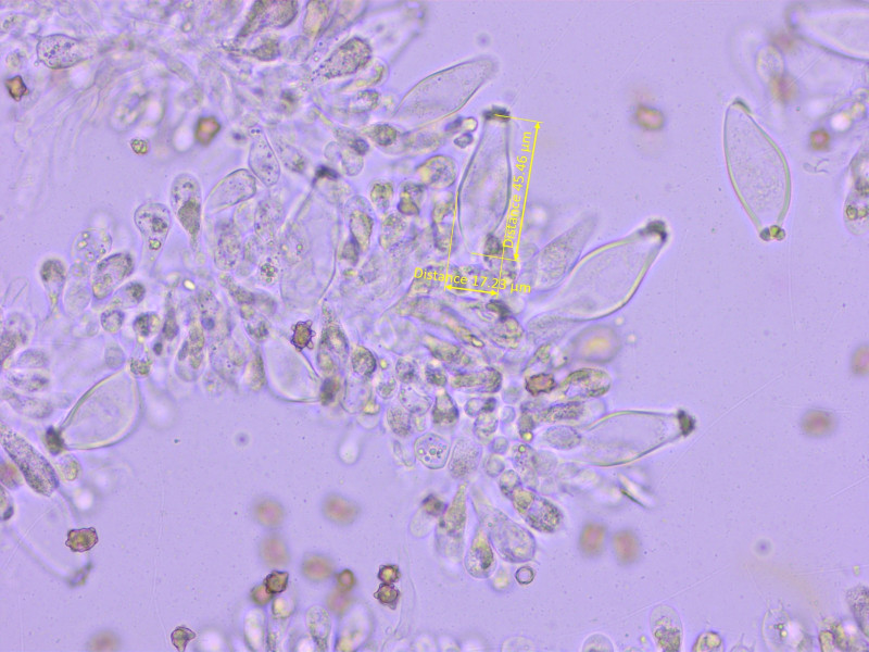 Cheilozystiden moderat dickwandig, immer kristallisiert, mit vielen Parazystiden, in KOH grüngelb, 47-56-61 x 14.5-16.5-19.5 µm (n=10)