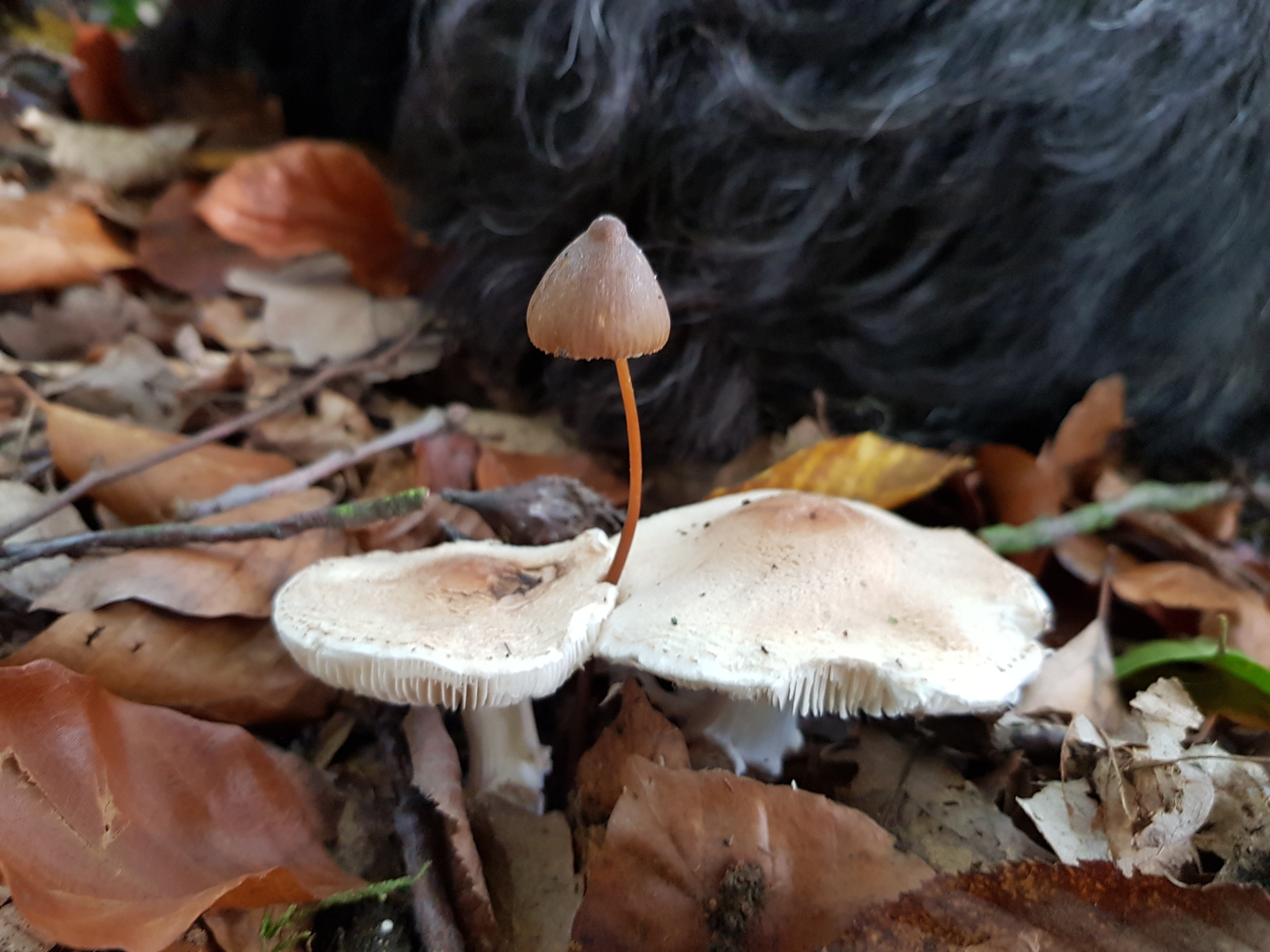 Den zweiten schaffe ich nicht zu bestimmen: Ist das auch ein Helmling? Ich finde keinen Pilz mit einem so glatten braungrauen Stiel mit passendem Hut. Vom Stiel her könnte es der Rettich-Helmling sein; der Hut ist aber nicht gerieft.