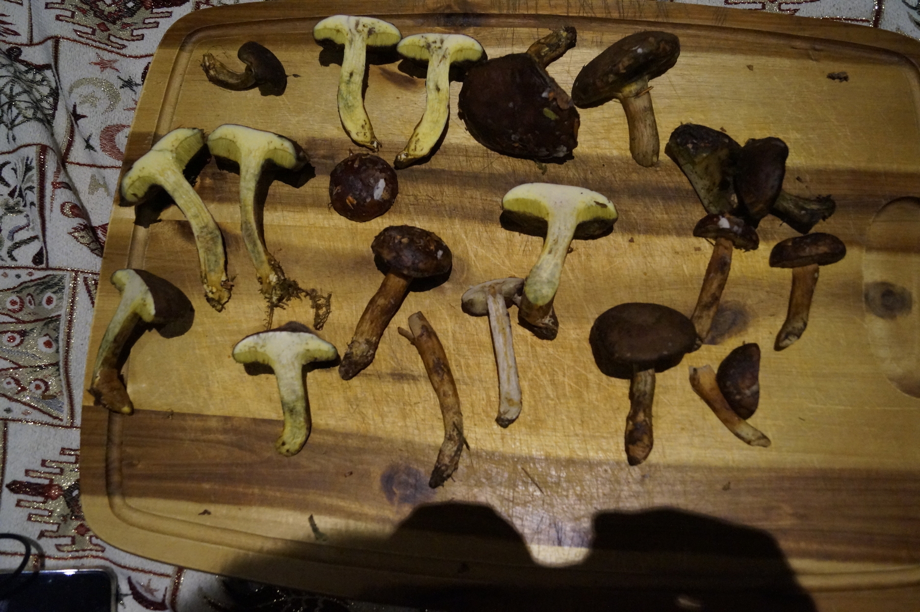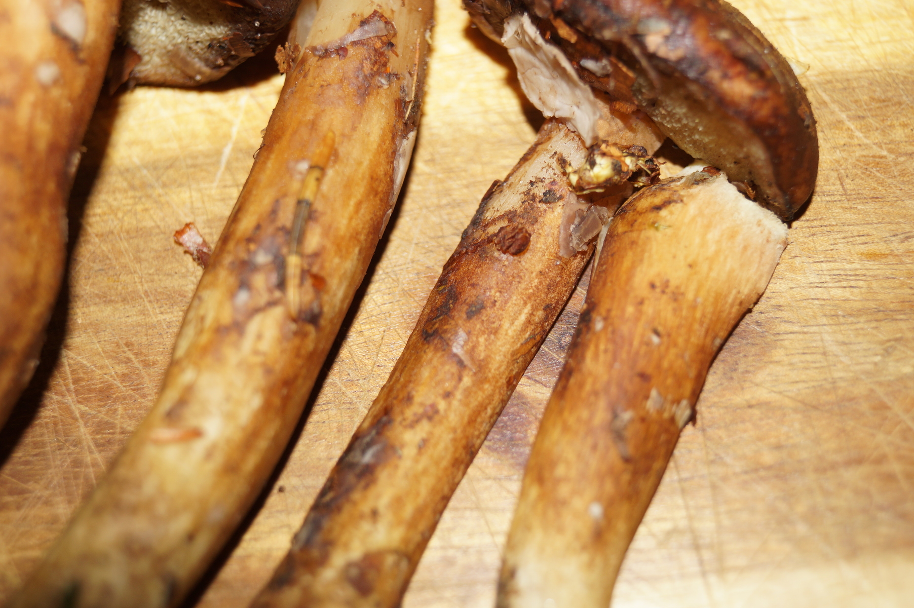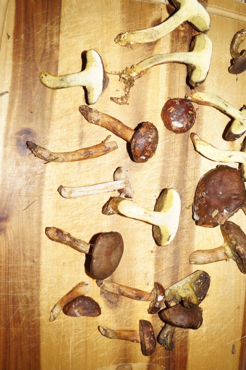 war heute noch einmal los um unbekannte Wälder zu erkunden. Mischwald mit vor allem Buchen und Fichten, aber auch Eichen und Douglasien. Bin dabei auf Röhrenpilze gestoßen, die ihr hoffentlich besser bestimmen könnt als ich. Dunkelbraune Kappe - etwas samtig. Die jüngeren Pilze haben weiße Röhren, die älteren gelbliche bis in oker gehende. Sie bläuen nicht! Kein einziger. Der Stiel ist eher schlank - in jedem Fall nicht dickbäuchig. Der Geruch ist angenehm. Der Geschmack (Leckprobe) nicht bitter. Ein Netz am Stiel konnte ich nicht sicher ausmachen. Auch keinen weißen Rand am Hut. Oder eine Rotfärbung unter der braunen Kappe. Die Pilze sind alle nicht in der besten Verfassung, zum Teil angefressen, zum Teil feucht und zum Teil gestresst vom Transport im Fahrradkorb.