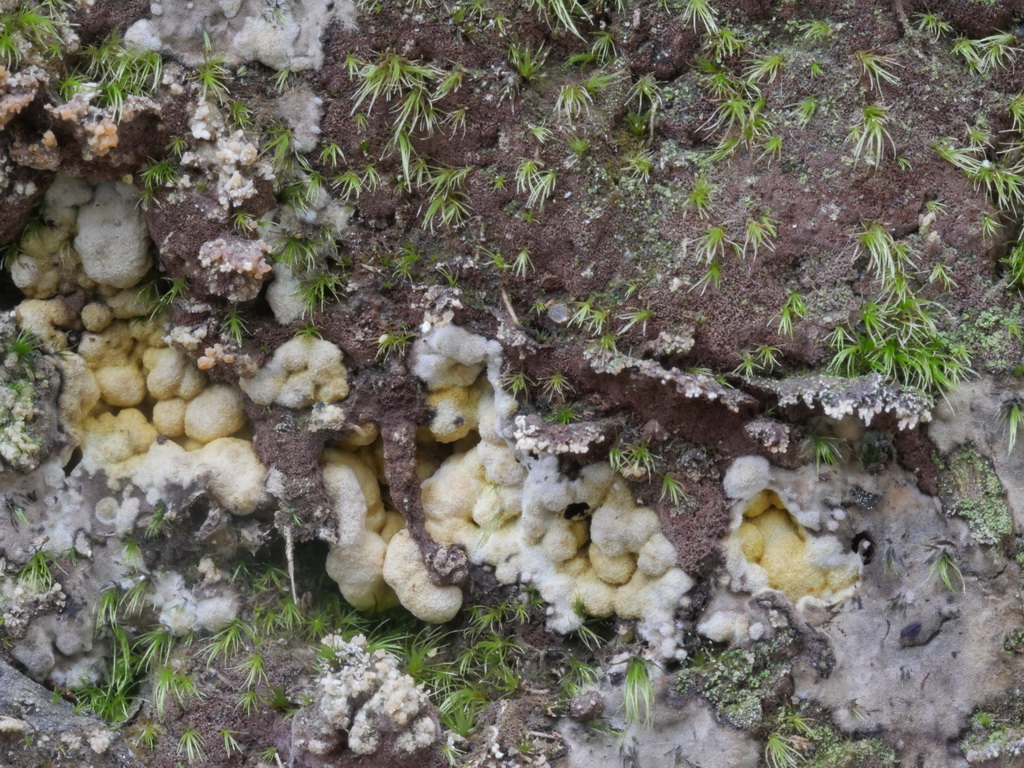 polsterförmig, weichfleischig, in den braunen Flecken fand ich jede Menge Sporen, aber keine Hyphen oder Basidien