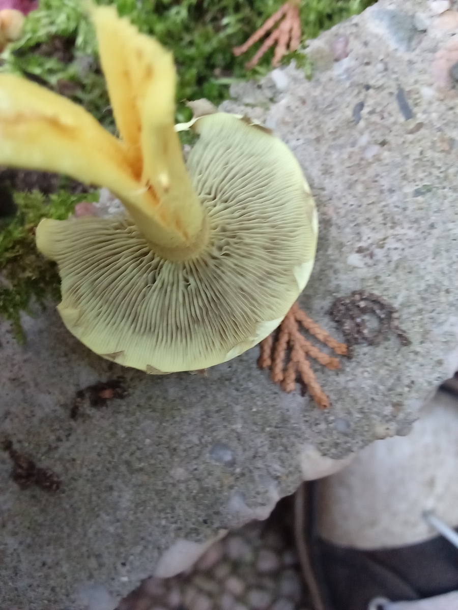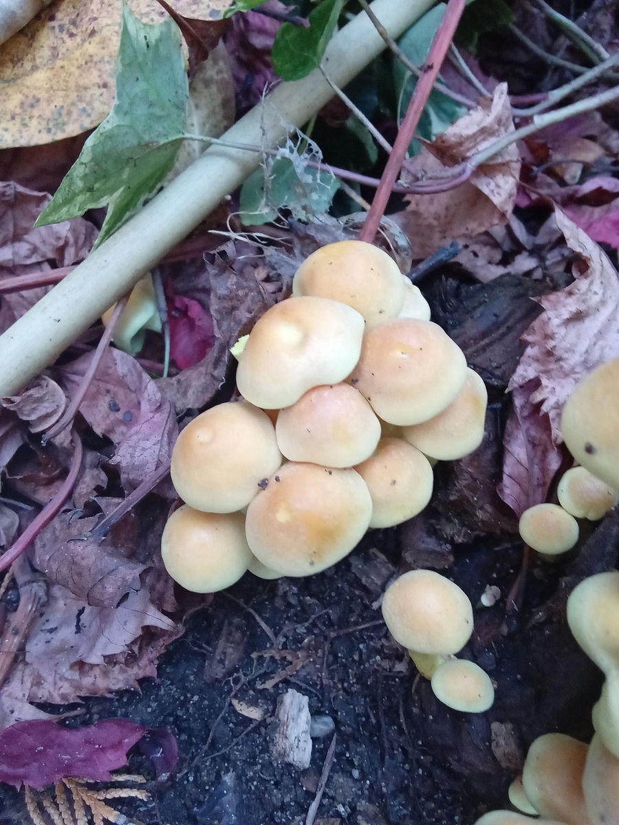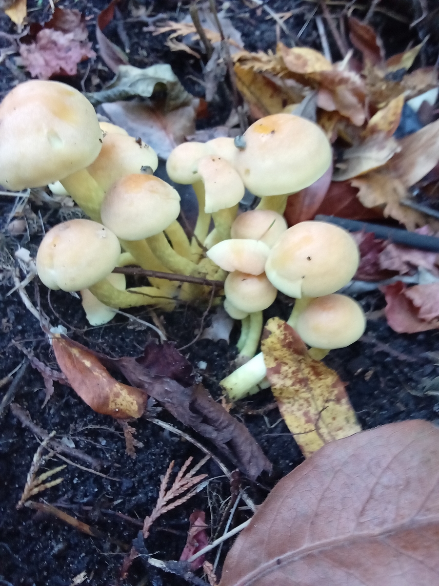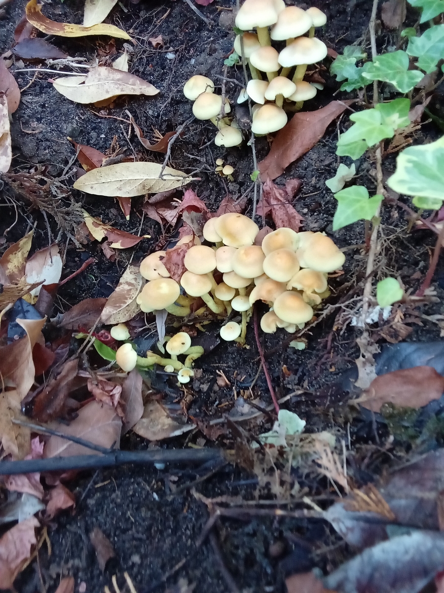 Die gezeigten Pilze sind GrĂŒnblĂ€ttrige Schwefelköpfe (Hypholoma fasciculare).Lg; pablo.