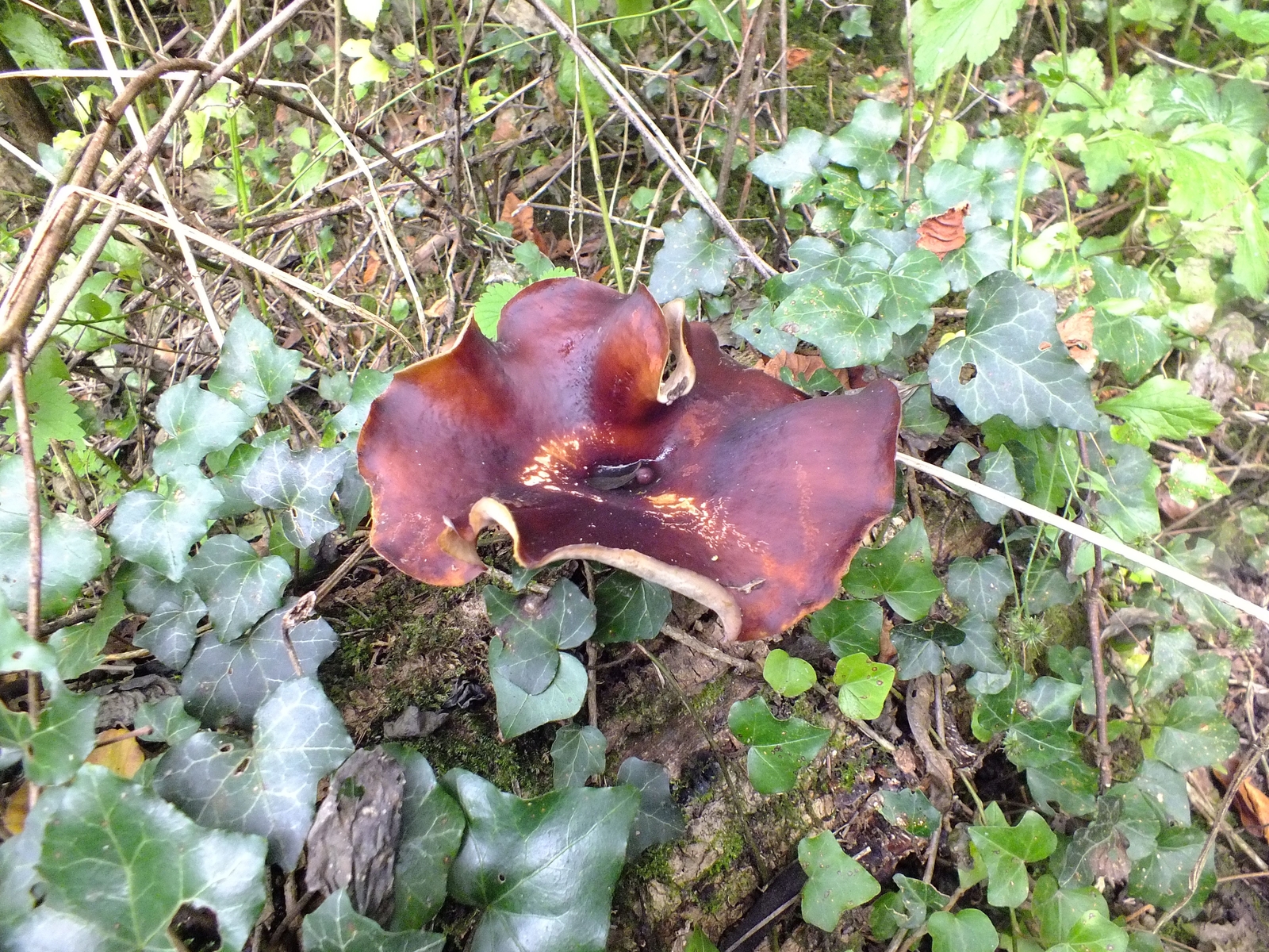 neulich stieß ich am Wegesrand unter dem Gebüsch auf einen interessanten, trichterförmigen Pilz, der aus einem liegenden Baumstamm ragte.