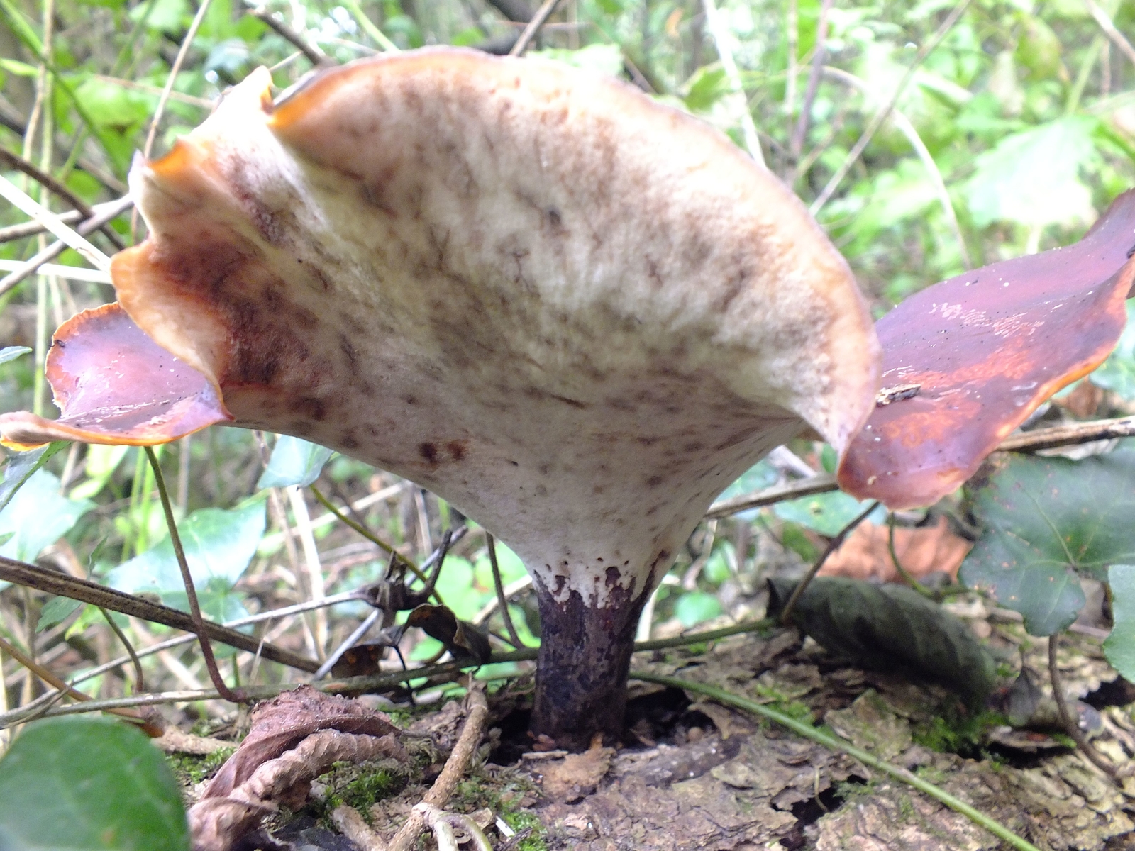 Die Hutunterseite und der obere Stiebereich sind weiß (Hymenium) und zeigen bräunliche Flecken, die Stielbasis ist schwarz.