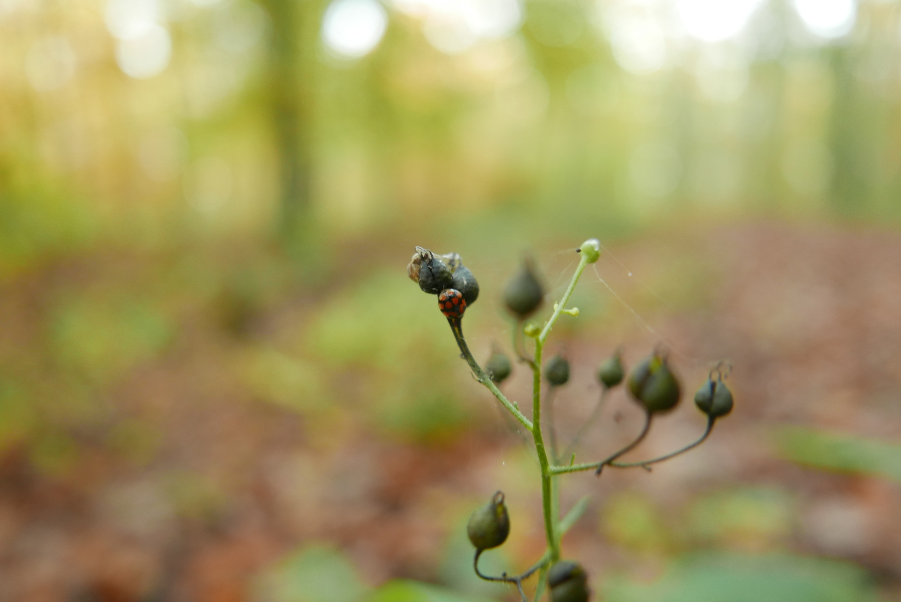 Hier hat sich ein Marienkäfer einen Ruheplatz unter den Braunwurz-Früchten gesucht