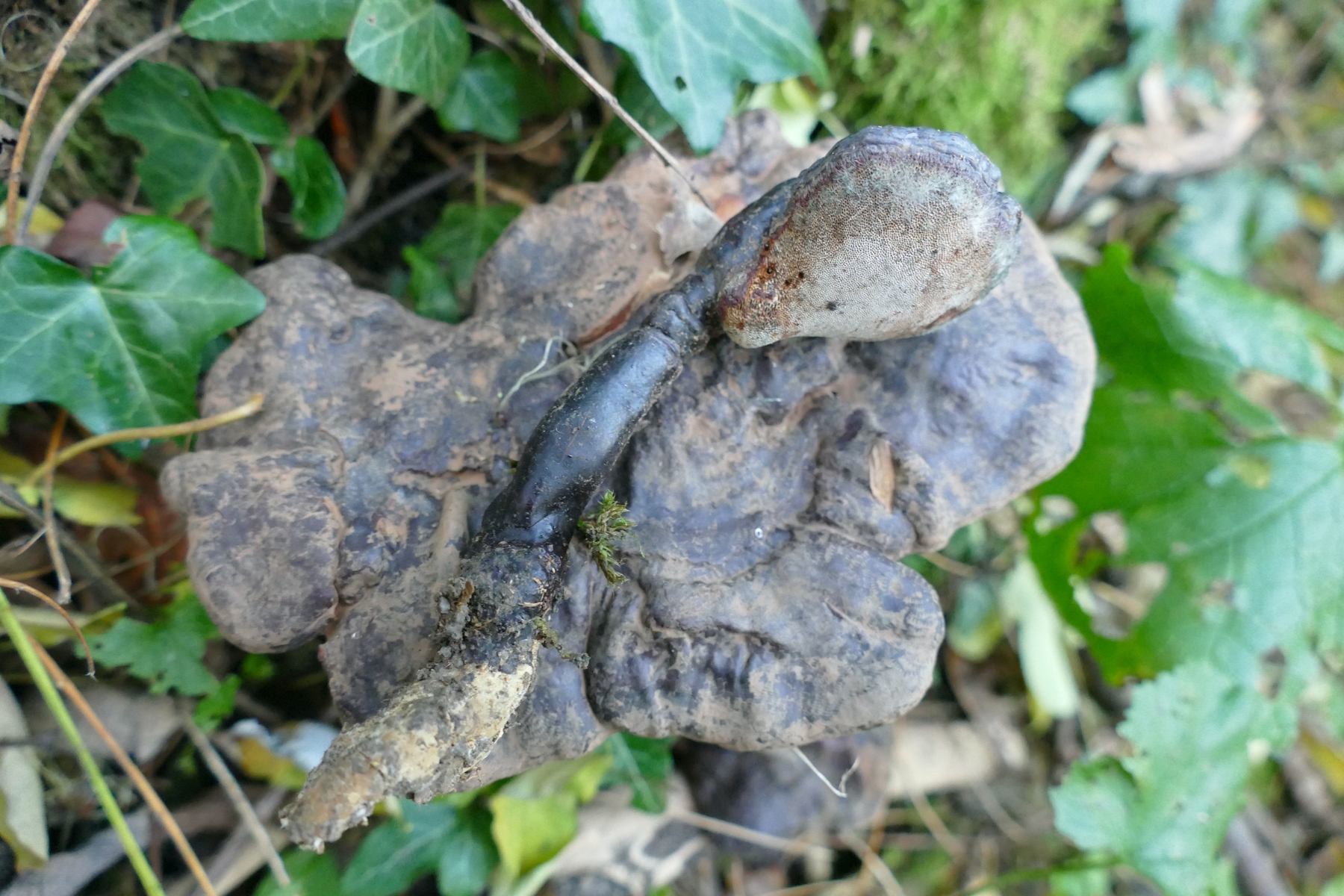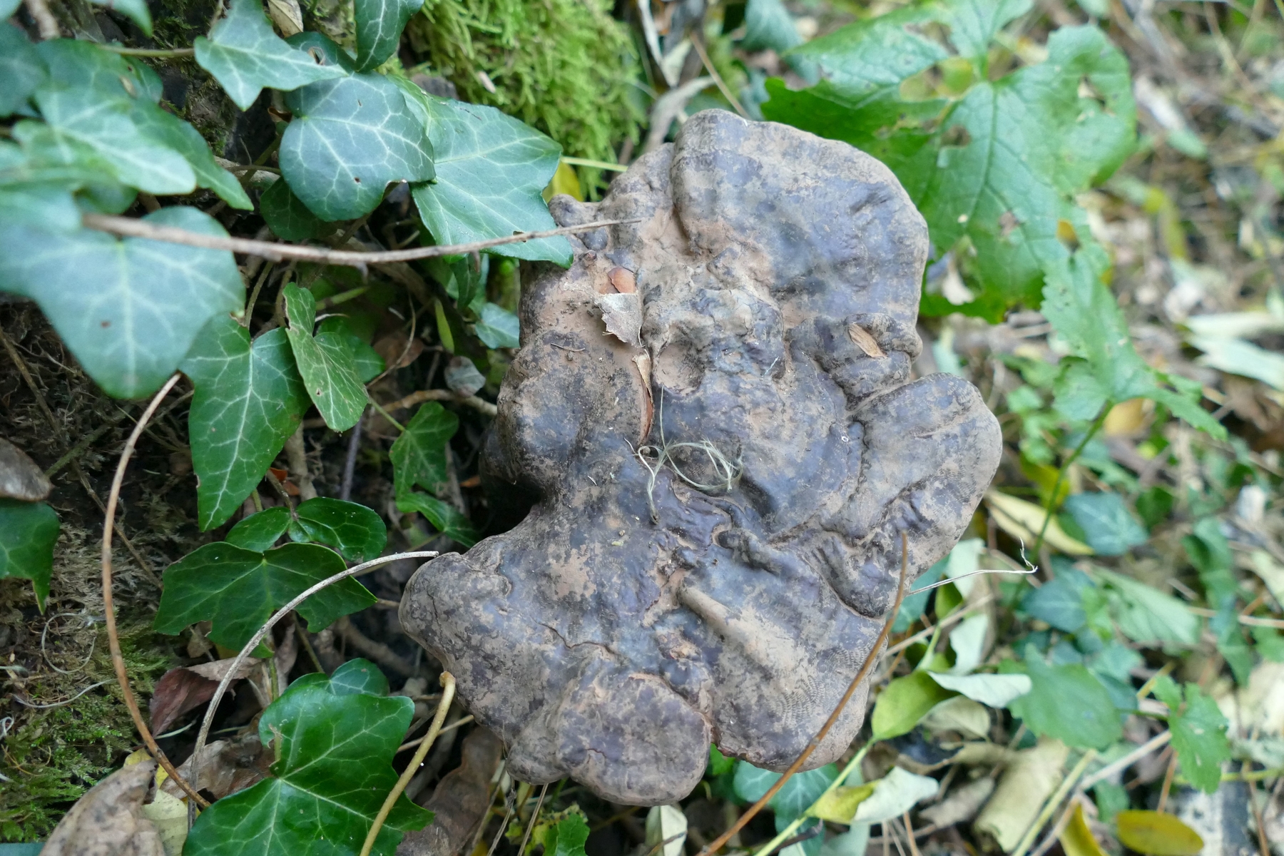 Vom Habitus her, würde ich auf eine Ganoderma tippen, eventuell ein dunkles Exemplar von G.lucidum, dem glänzenden Lackporling?