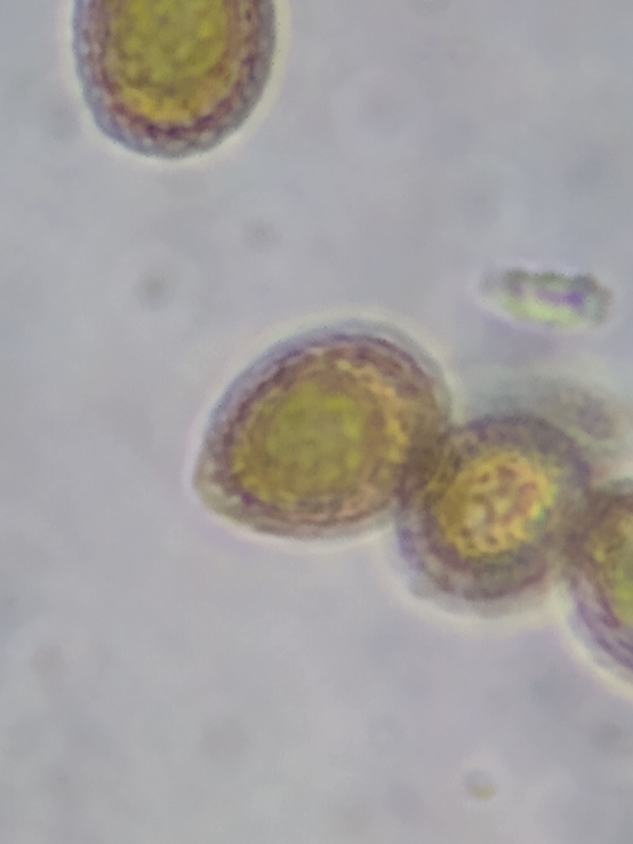 Passt das mit den Sporen? Im Mikroskop wirken sie hell, aber die Ansammlungen in den Poren sind weiß.