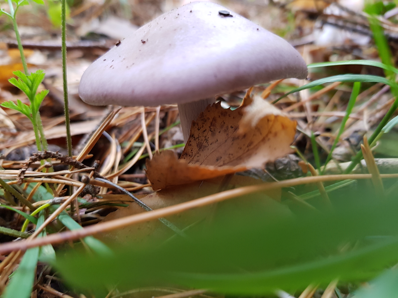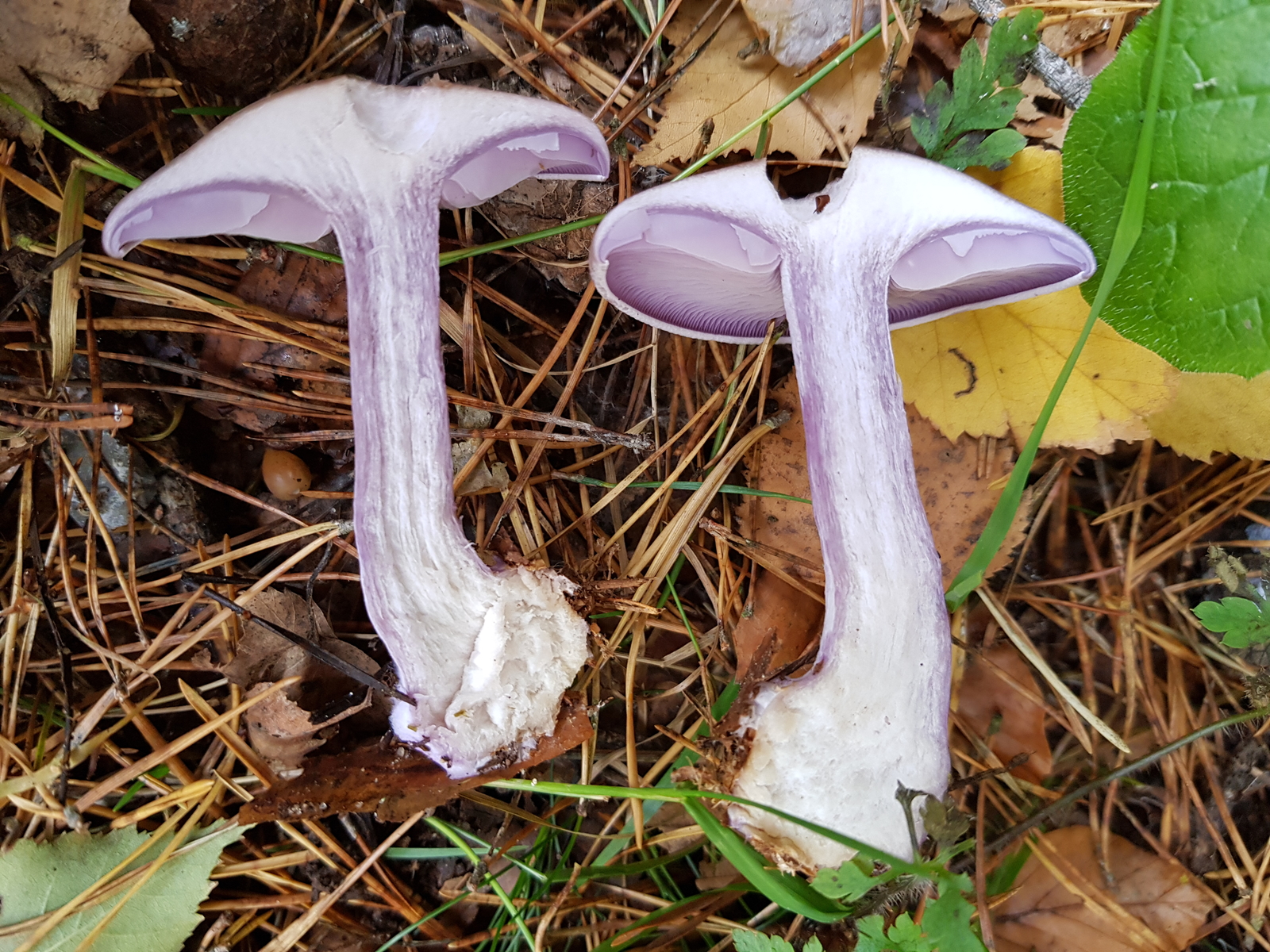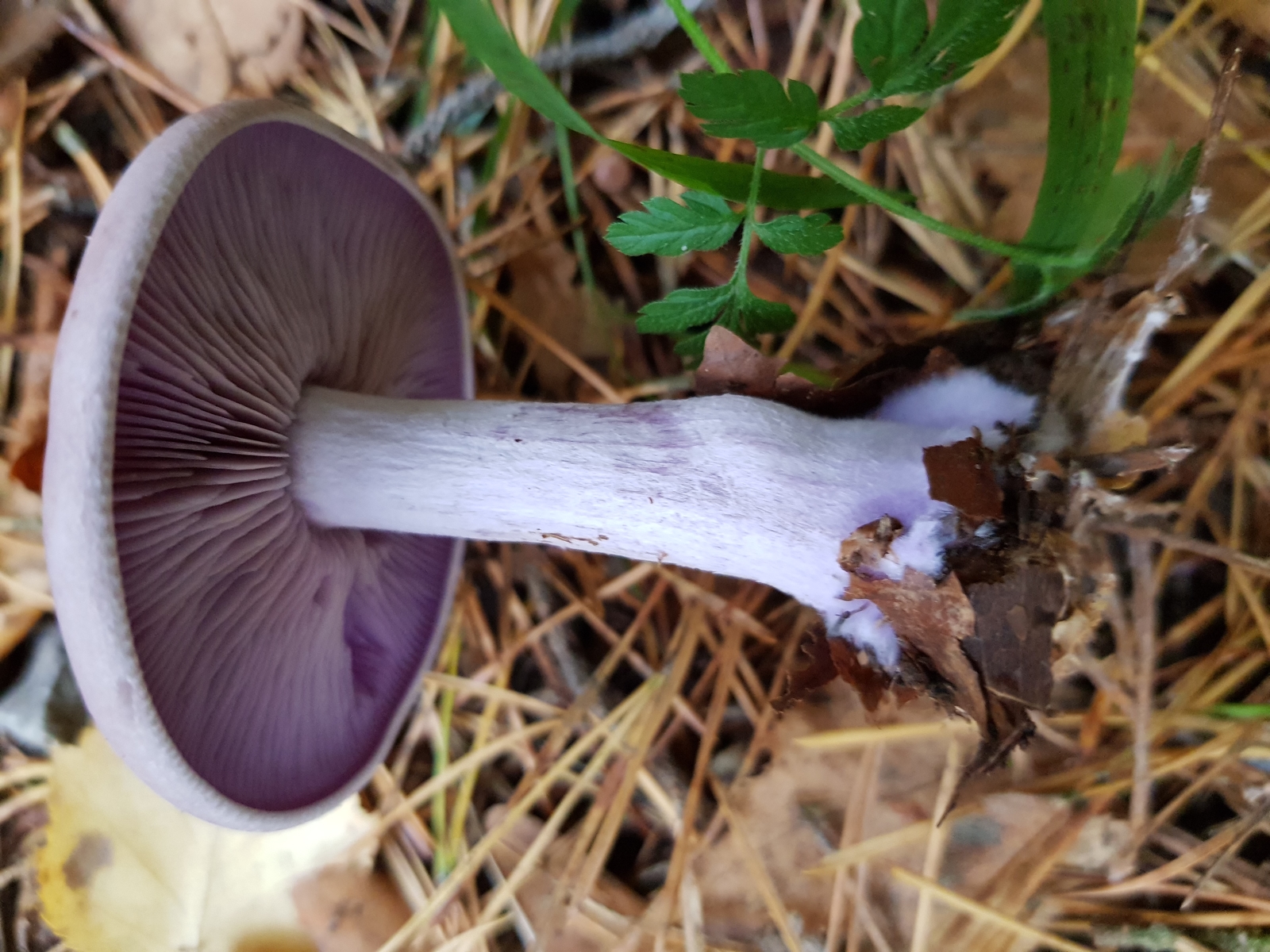 Hut und Lamellen als auch am Stiel deutlich violett; 5 cm, halbkugelig geformt, Rand ist eingerollt.