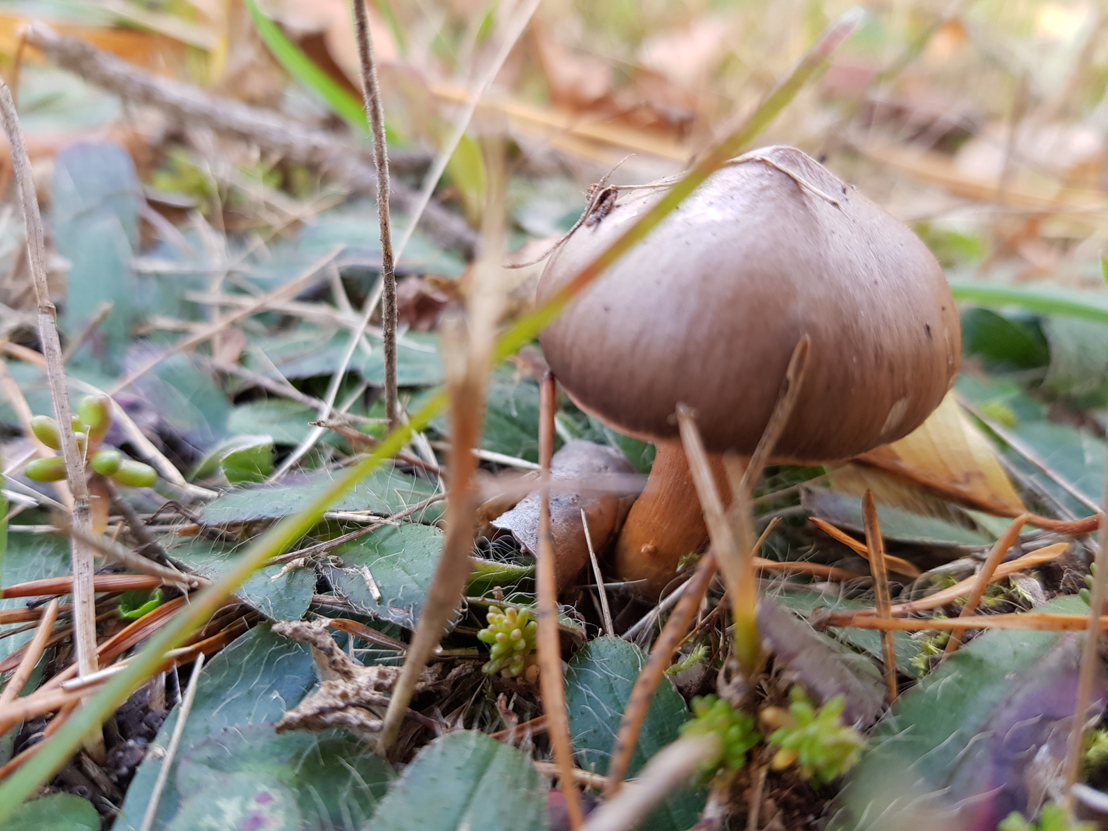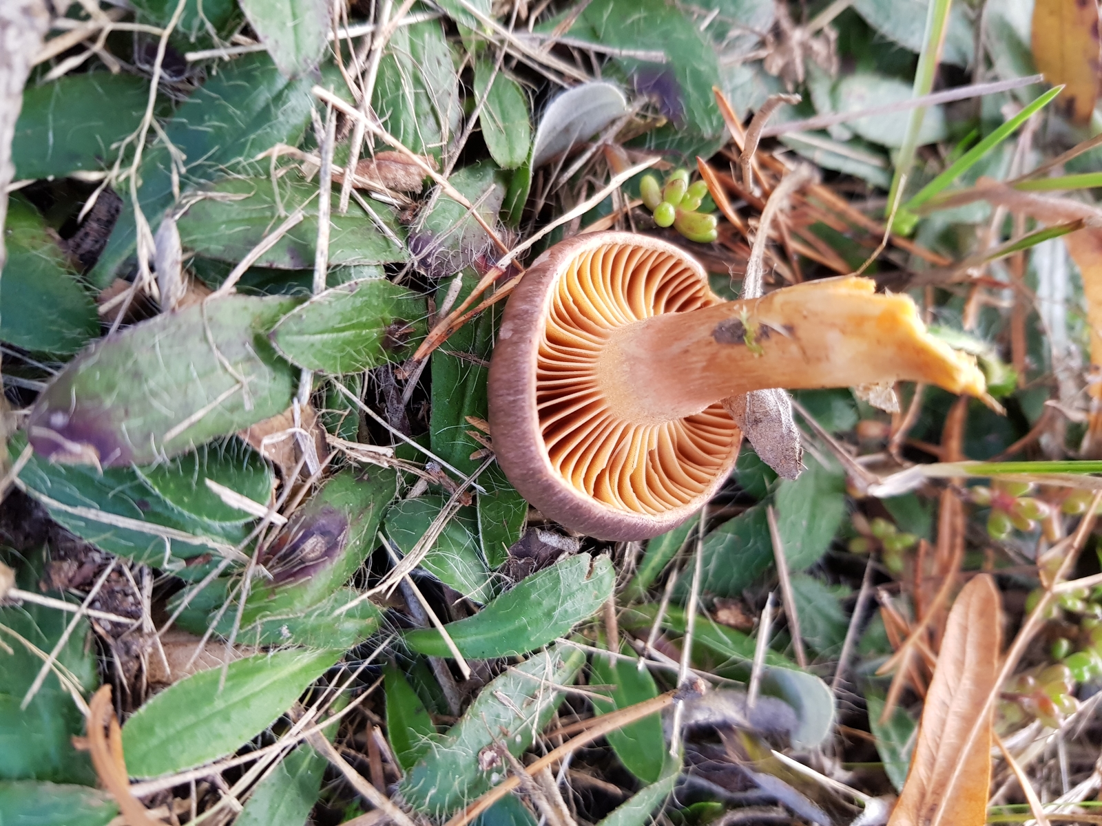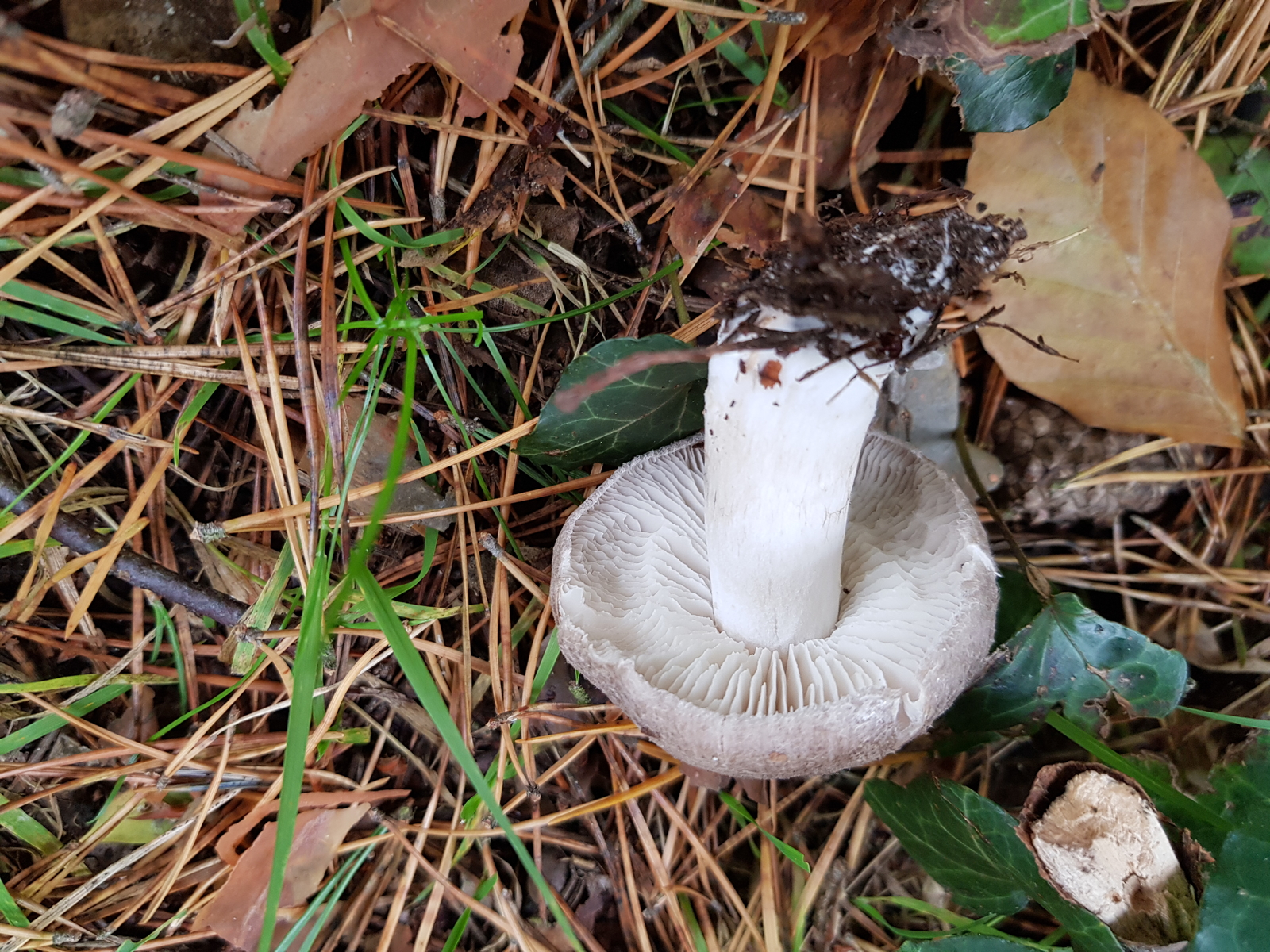 Hut und Lamellen als auch am Stiel deutlich violett; 5 cm, halbkugelig geformt, Rand ist eingerollt.
