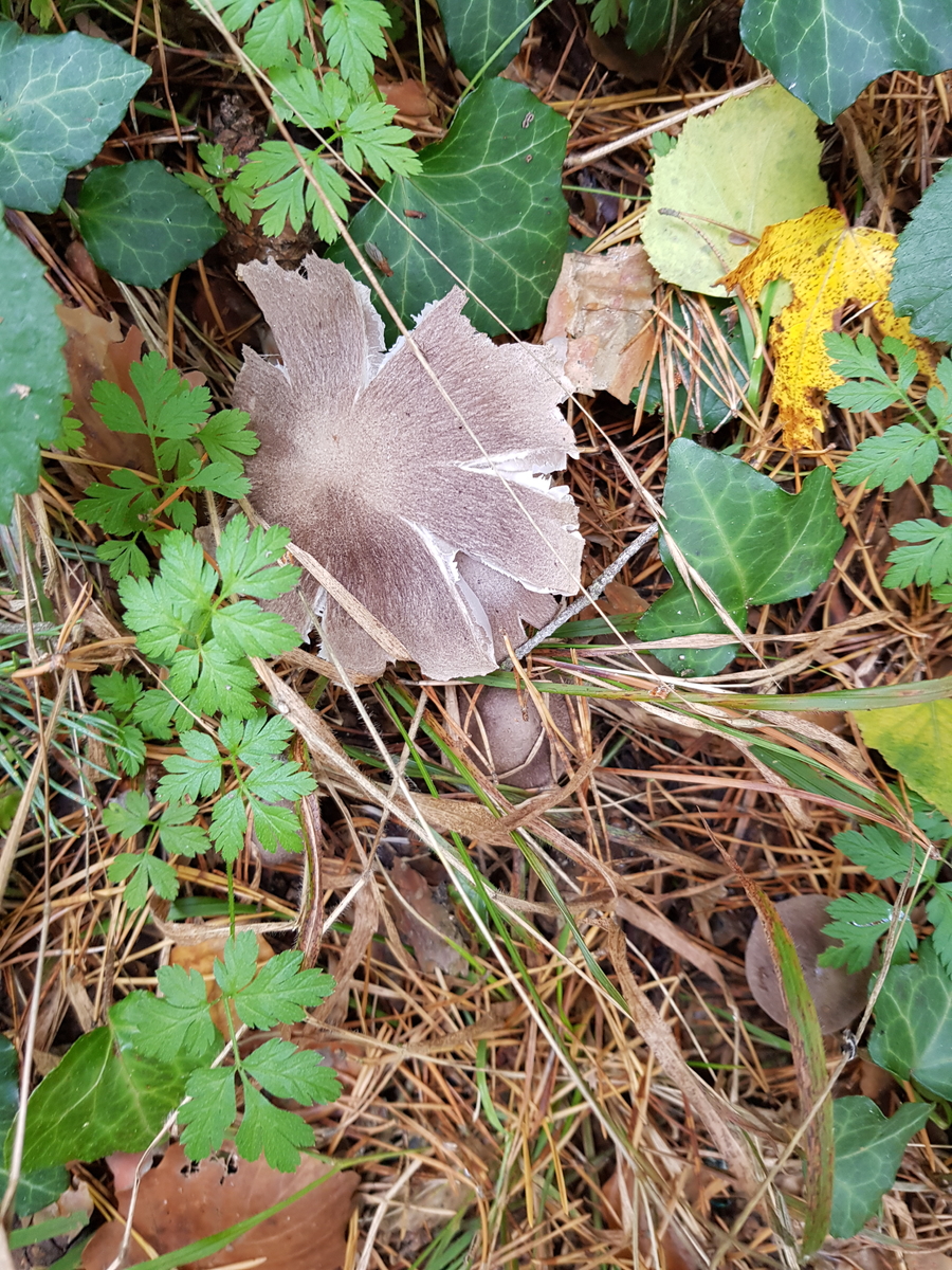 Hut ca. 5 cm und grau; radial verlaufende Fasern; äußerste Hutrand ist nach unten gebogen; in der Mitte ein deutlicher Buckel