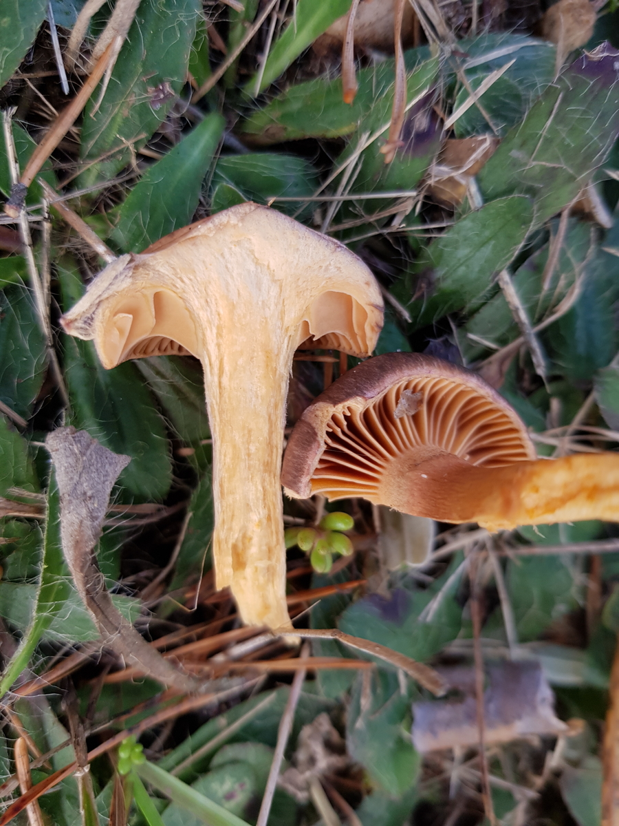 orangerötlich gefärbte Lamellen, herablaufend, dick, entfernt stehend
