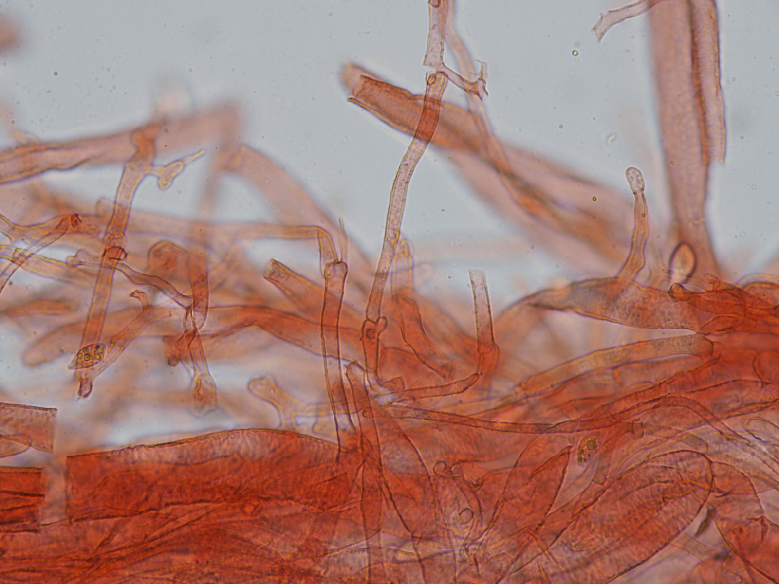 Schnallen gabs reichlich, Basidien konnte ich nicht in fotogenem Zustand auftreiben, und auch nicht beurteilen ob 2 oder 4 Sporig, sollte aber wohl auch egal sein.