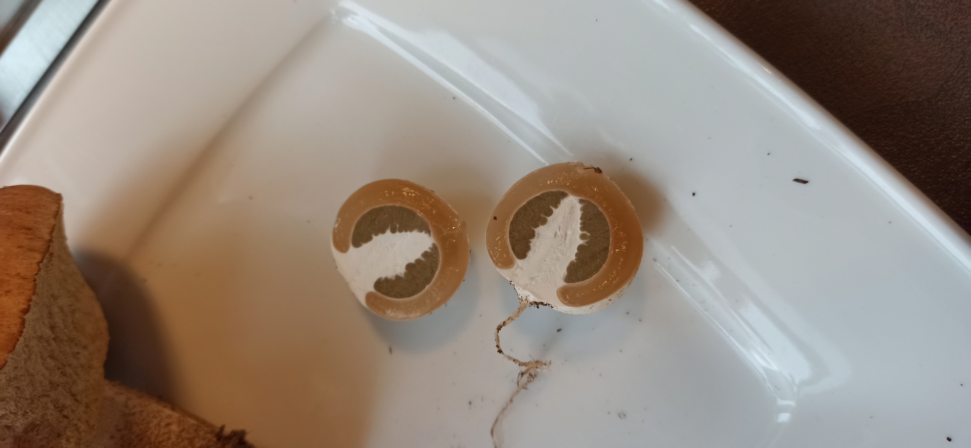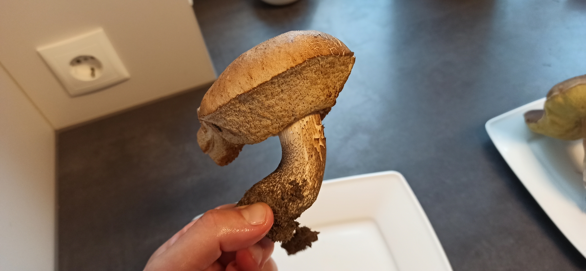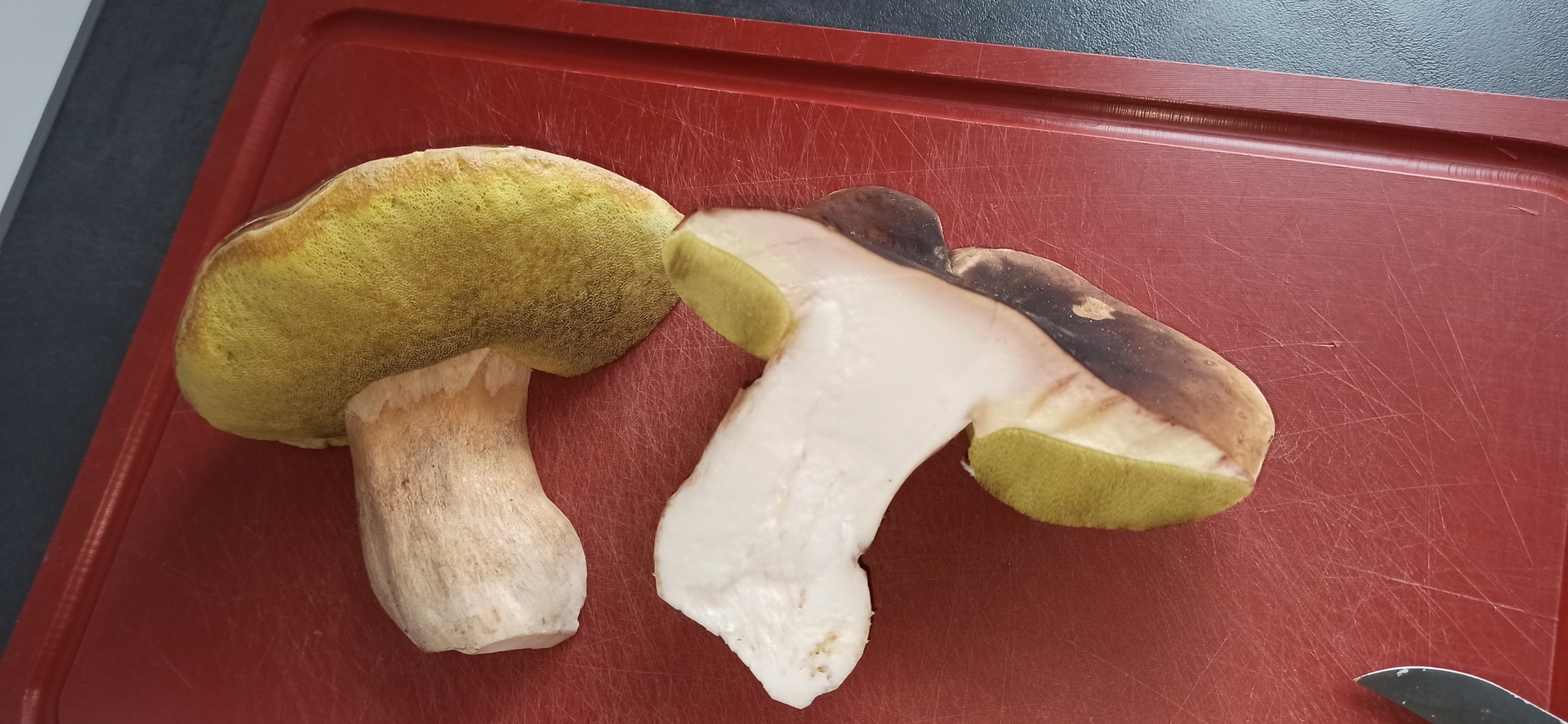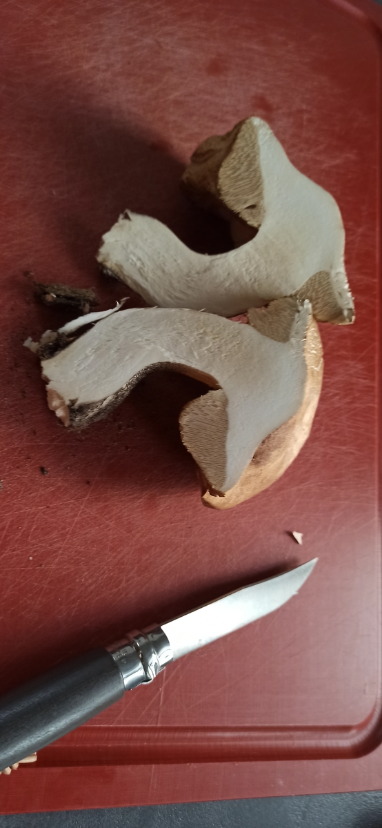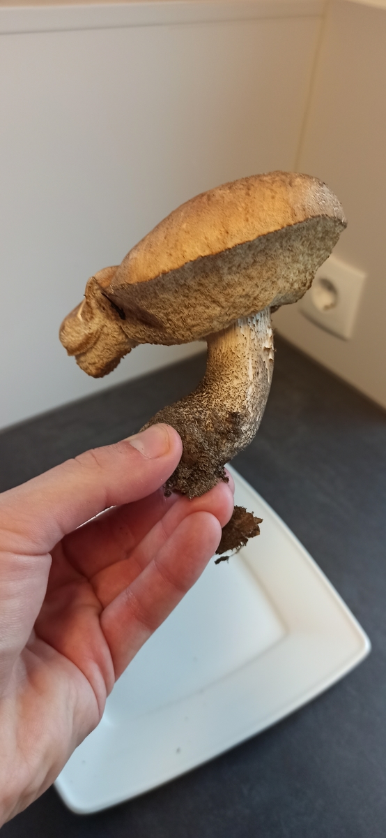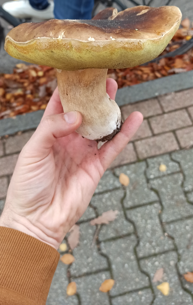 Abschließend habe ich einen alten Steini gefunden. Am Straßenrand, in der Nähe eines Sportplatzes. Aufgrund der gelben Röhren habe ich erst an eine riesige Marone gedacht, aber mMn. ist es ein alter Steini. Stielnetz lässt sich noch erahnen, das Fleisch blaut nicht. Geschmacksprobe war nicht bitter. Auch er sah durchgeschnitten viel besser aus, als erwartet. Er wird aber aufgrund des Fundortes wohl nicht gegessen.