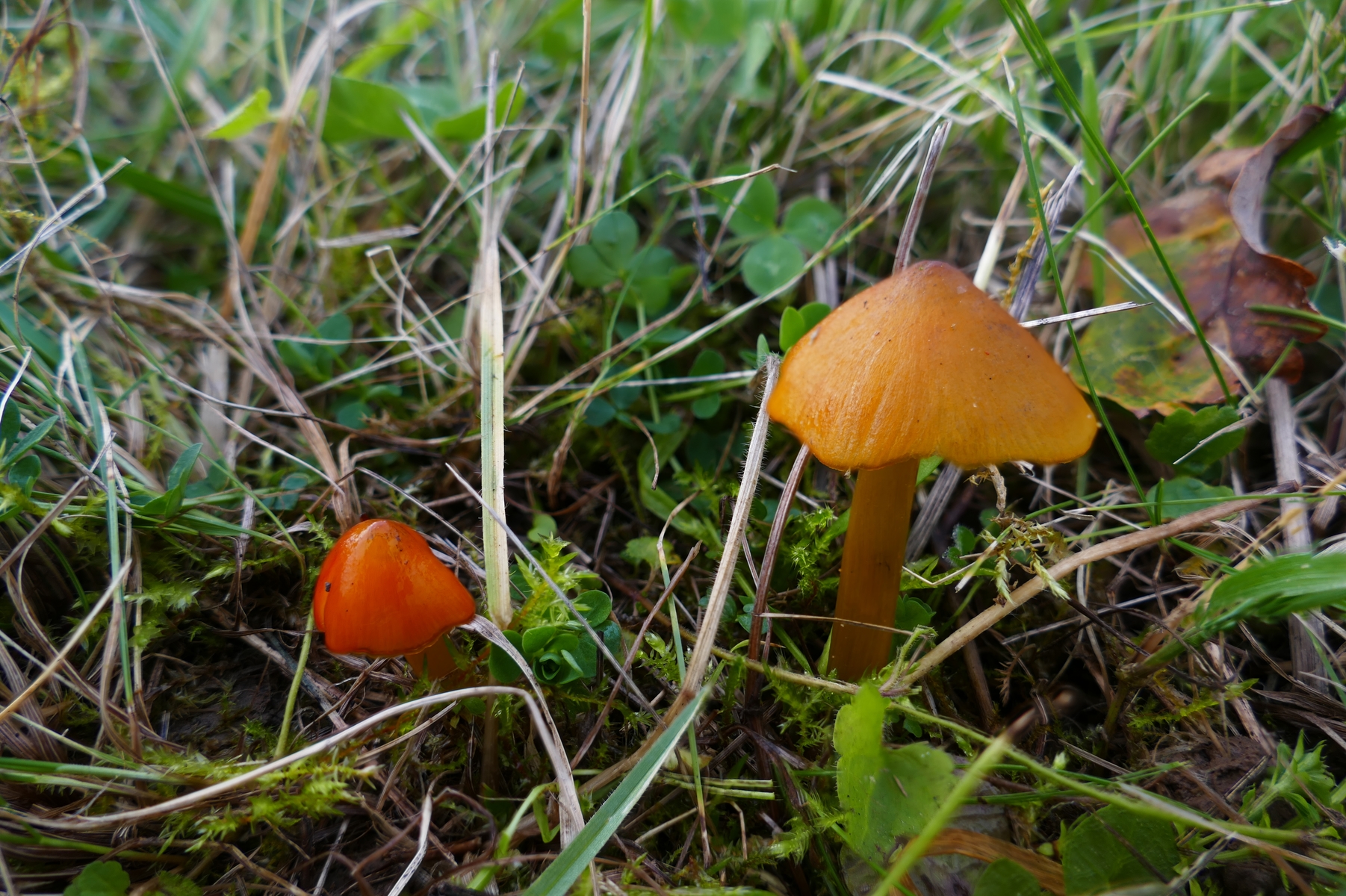 In großen Mengen und an einer Stelle mit deutlicher Bildungsstörung 10 Cuphophyllus pratensis - der orangefarbene Wiesenellerling (hier mal nur die Teile mit den Bildungsstörungen, ansonsten gar nicht groß fotografiert):