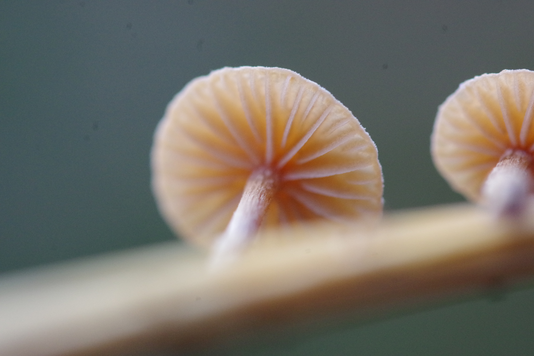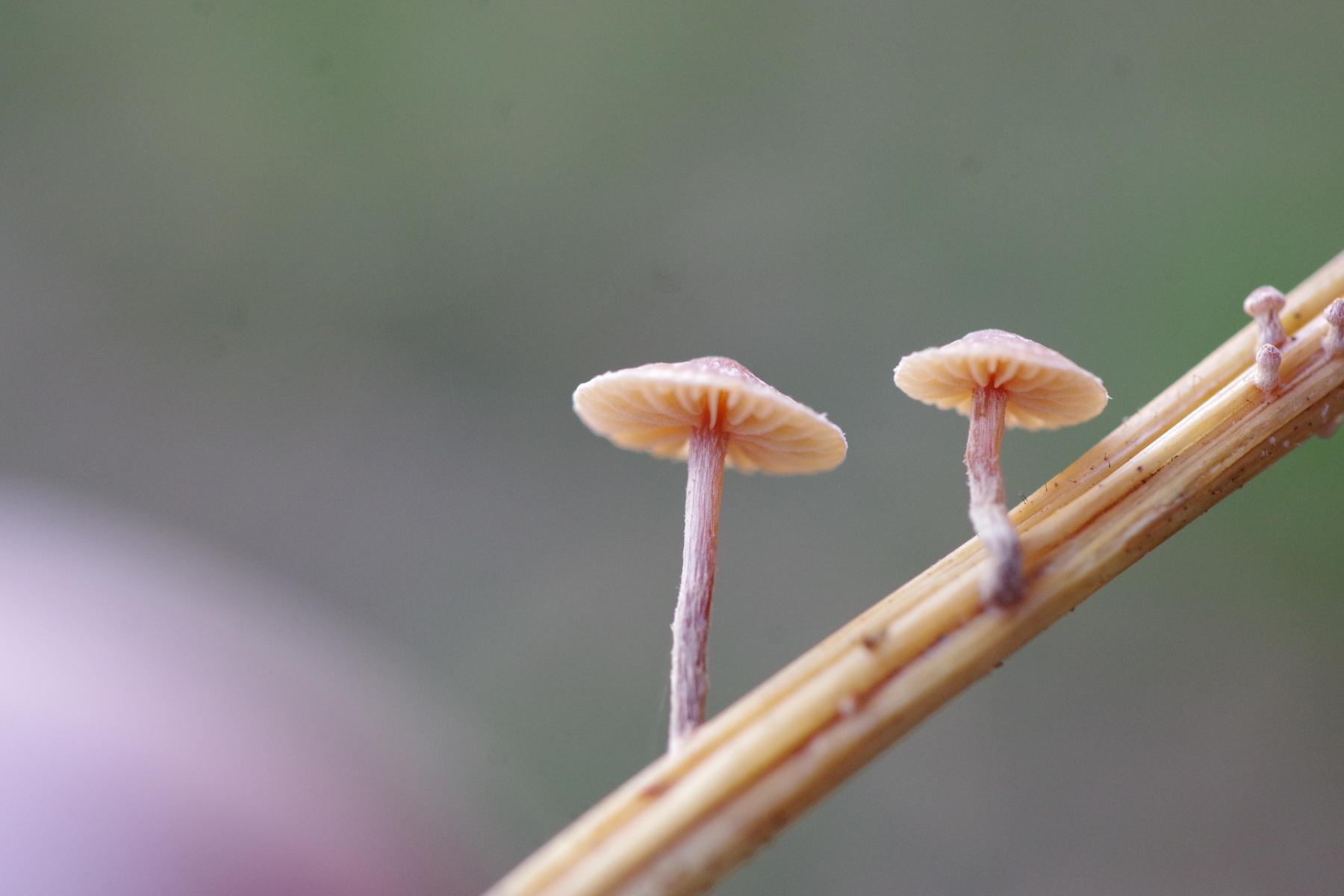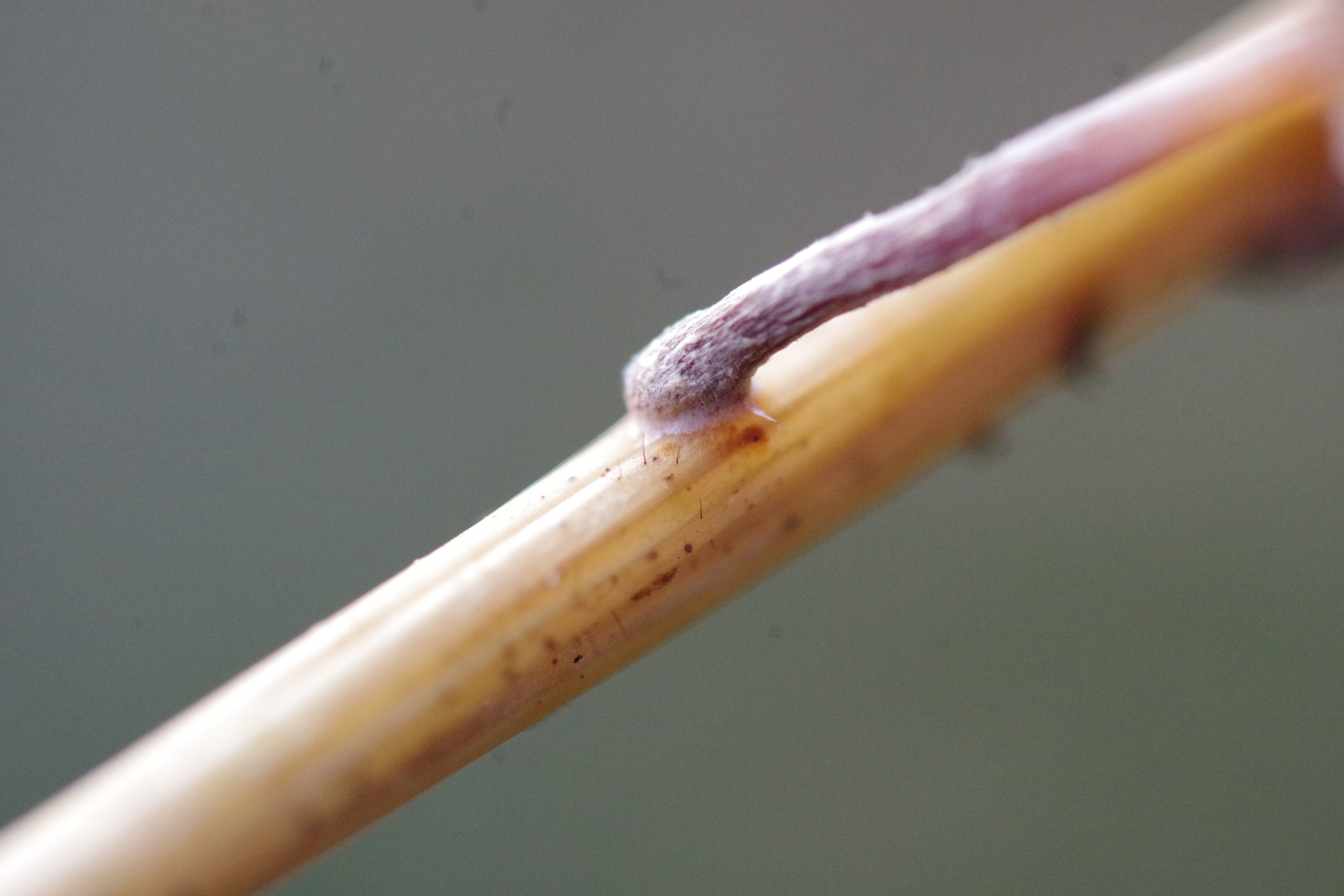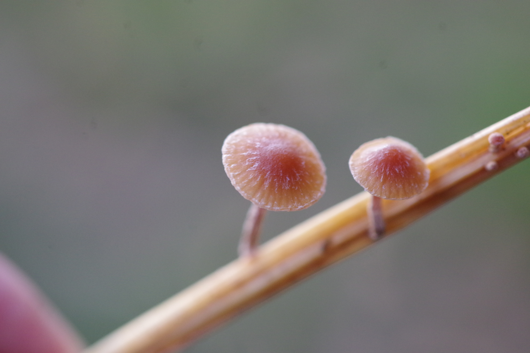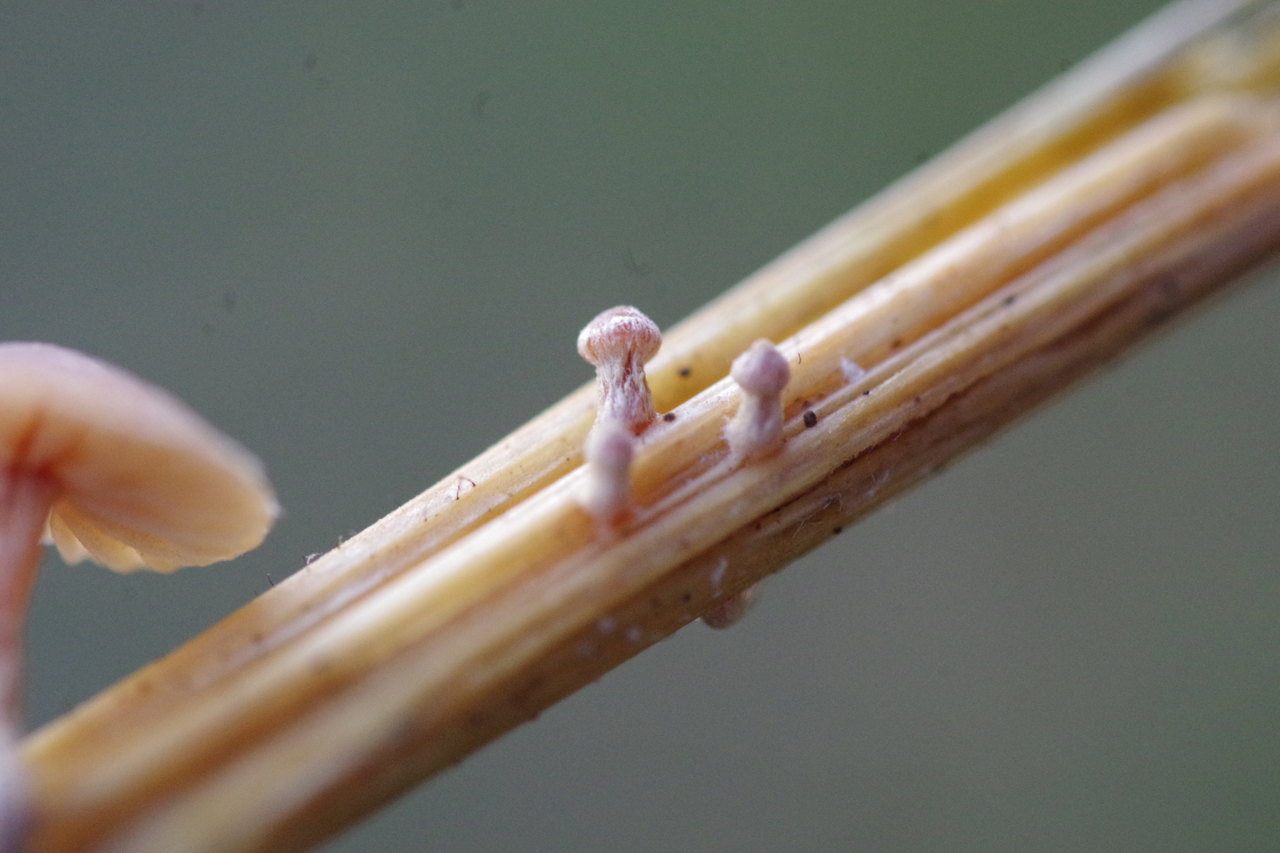 auf der Wiese habe ich an einem Grashalm (Sandreitgras, bei der Mahd unters Messer gekommen) kleine Lamellenpilze gefunden. Der erste Gedanke war Mycena, aber Galerina dürfte in einigen Aspekten besser passen. Sporenabwurf hat bei so Zwergen noch nie funktioniert, also hab ich es gar nicht erst versucht. Hut bis 7 mm, braun, weißlich beflockt, mit hellerem Rand. Lamellen ansitzend, mit Zwischenlamellen. Stiel faserig, braun, unten mit Violettton. Ohne Mycelscheibe ansitzend.