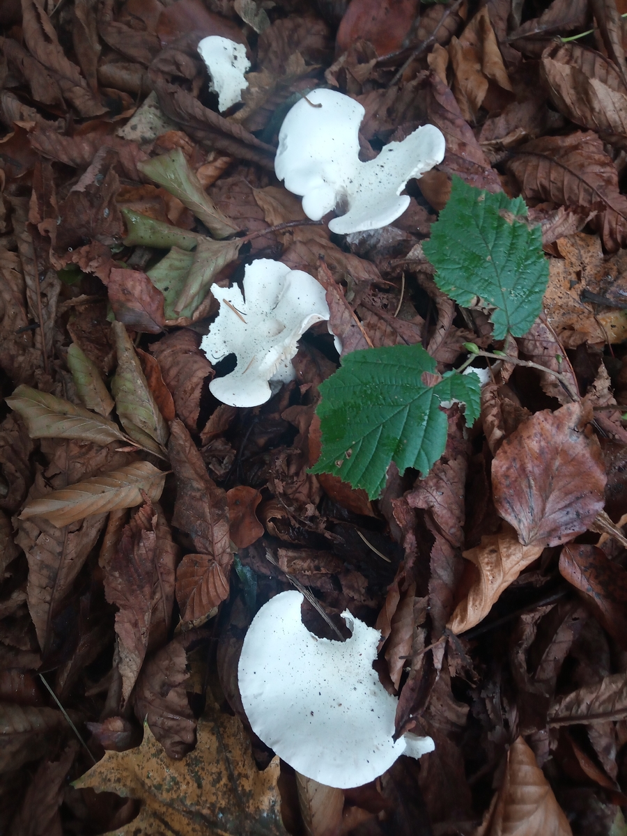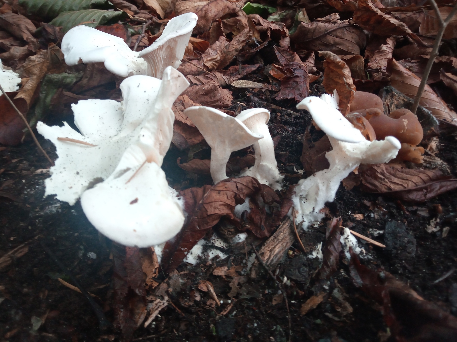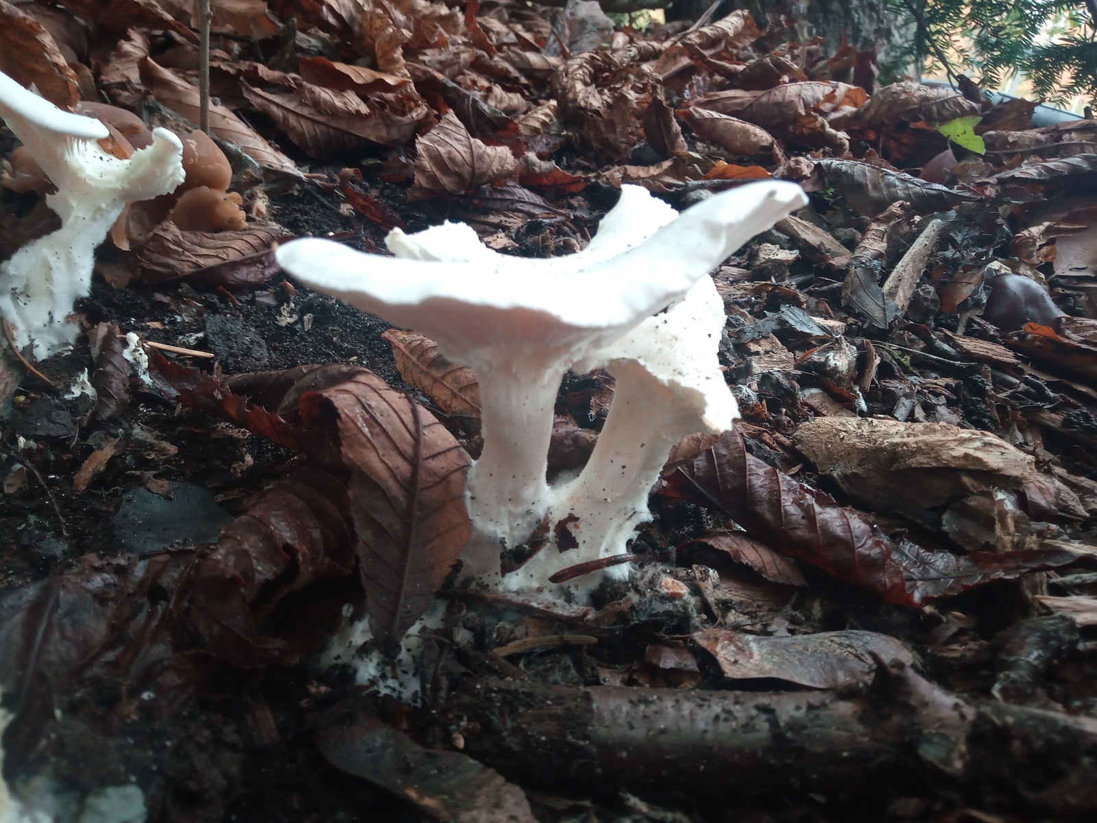 Ich hab heute ein paar weiße Pilze gefunden. Sie sind unter Eiben gewachsen mit überwiegend Kastanien und etwas Ahornlaub. In Büscheln wachsend.