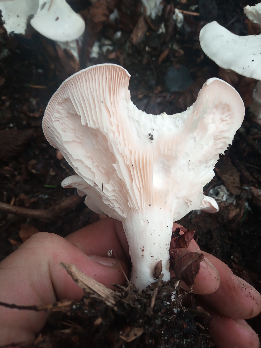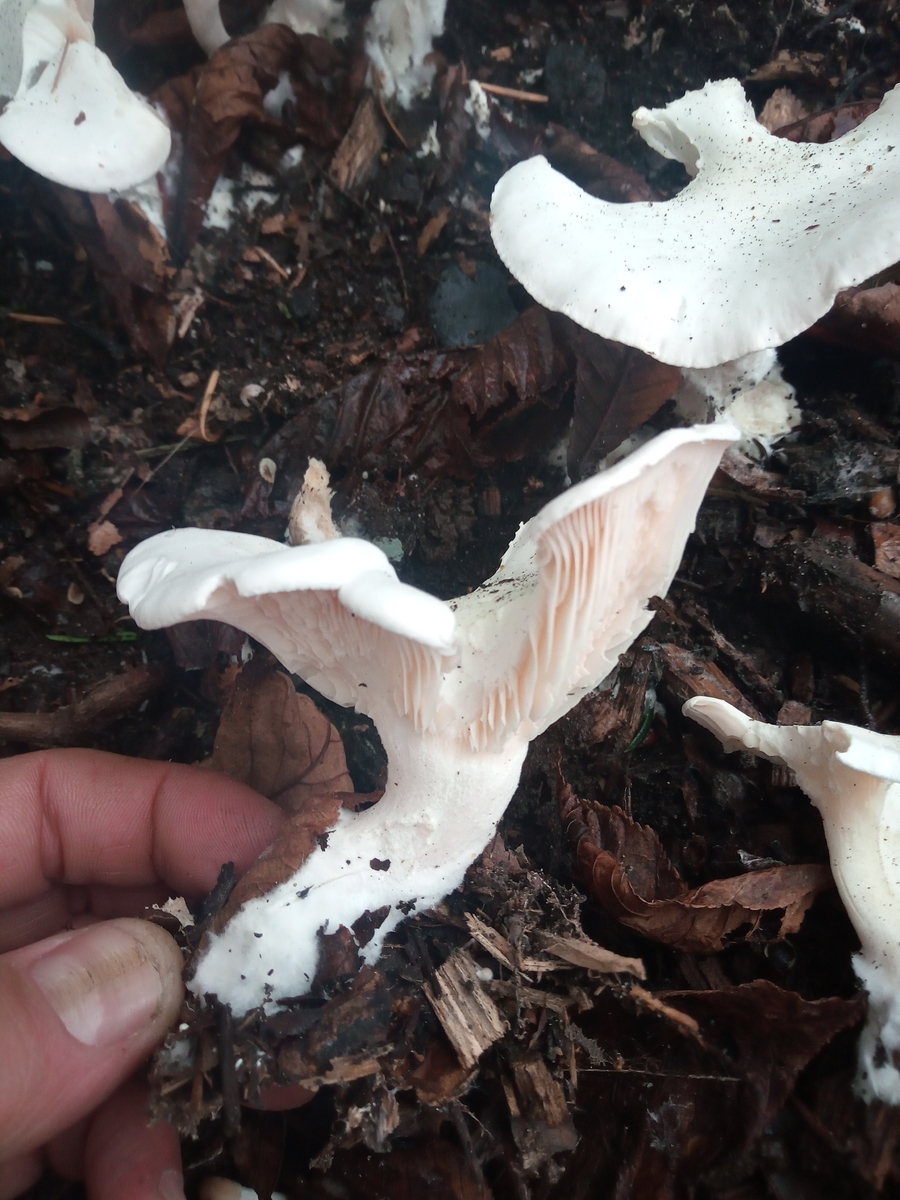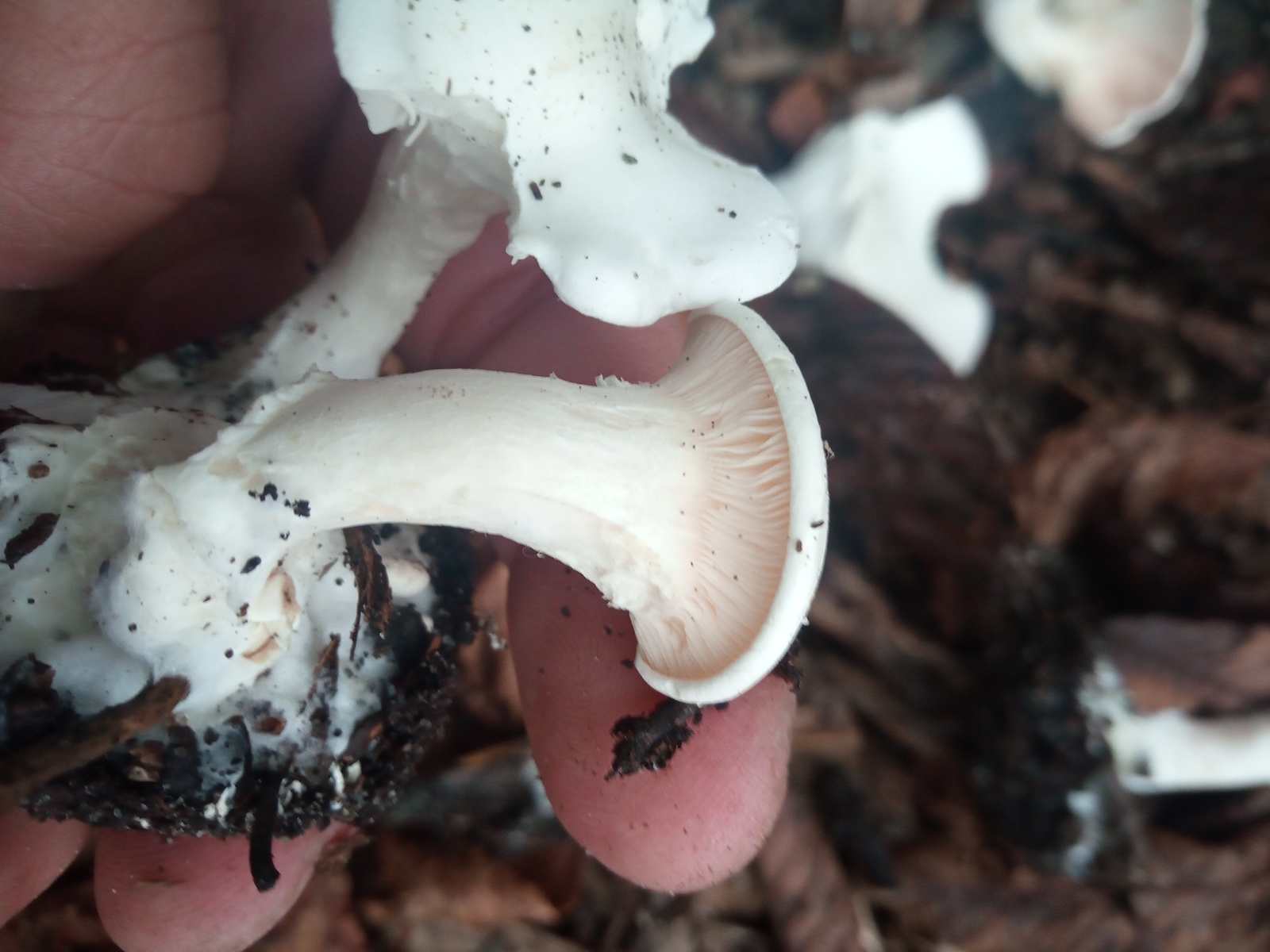 Ich hab heute ein paar weiße Pilze gefunden. Sie sind unter Eiben gewachsen mit überwiegend Kastanien und etwas Ahornlaub. In Büscheln wachsend.