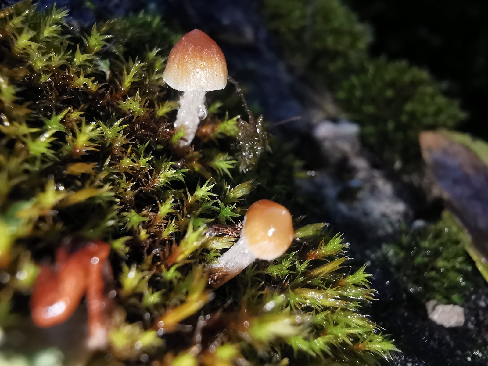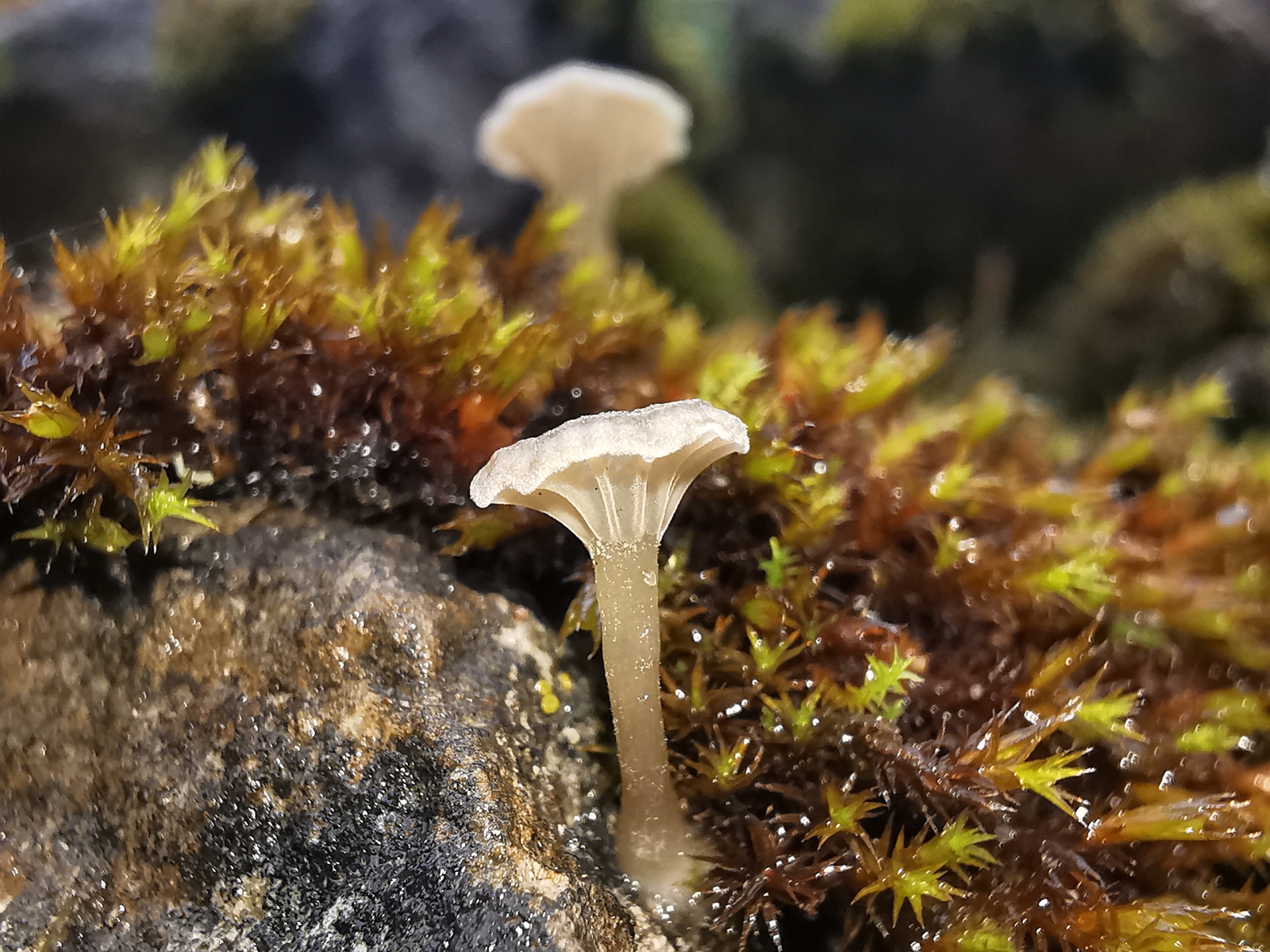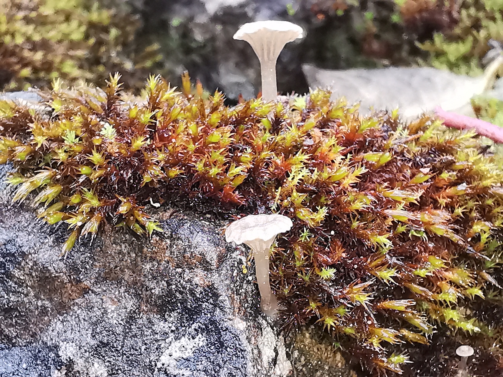 • Auf unserer Treppe die mit viel Kalksteinen bestückt ist wachsen im Herbst immer einige Nabelinge aus den Moosbüscheln. Neben den (ich vermute Arrhenia rickenii) wachsen auch noch andere kleine orange Pilze die ich so aber garnicht einordnen kann. Außerdem hab ich noch einen interessanten Pilz entdeckt. Bei dem ich momentan am ehesten beim blassen Adermossling lande.