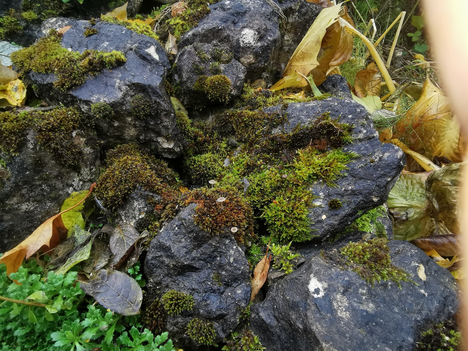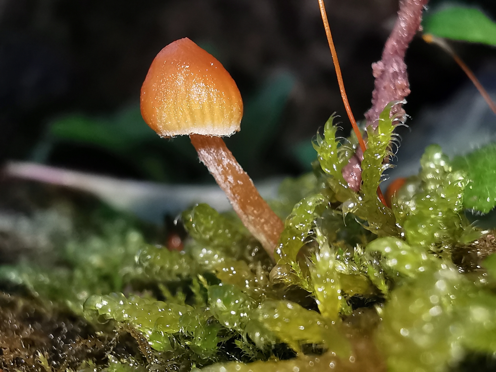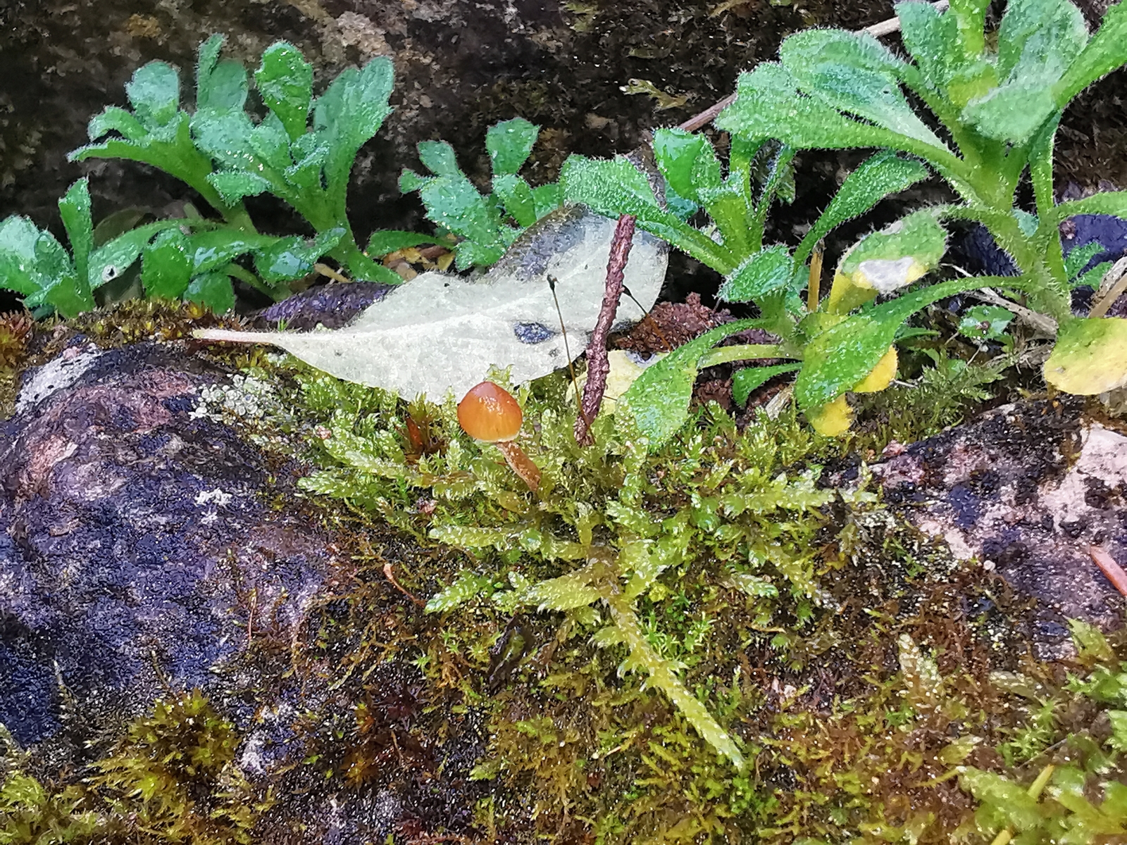 • Auf unserer Treppe die mit viel Kalksteinen bestückt ist wachsen im Herbst immer einige Nabelinge aus den Moosbüscheln. Neben den (ich vermute Arrhenia rickenii) wachsen auch noch andere kleine orange Pilze die ich so aber garnicht einordnen kann. Außerdem hab ich noch einen interessanten Pilz entdeckt. Bei dem ich momentan am ehesten beim blassen Adermossling lande.