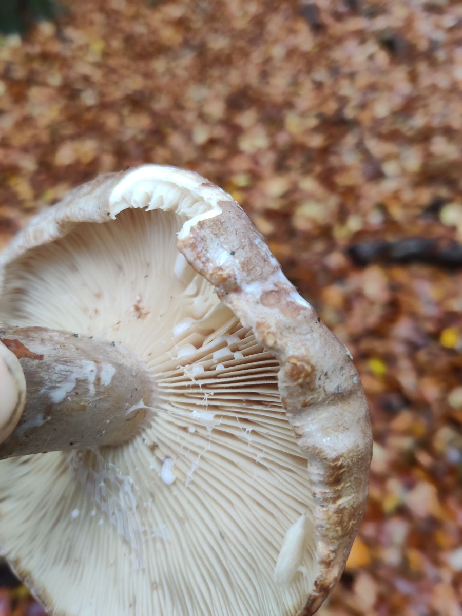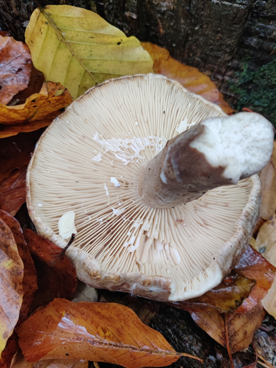 Hallo. Ich Frage mich, welchen Milchling ich hier gefunden habe. Hut und Stiel braun, weiße bis cremefarbene Lamellen, weiße Milch tritt aus, die ins bittere abgeleitet. Gefunden am Fuße dieses Stumpfes, ich vermute eine Eiche, ohne es genau zu wissen. Umstehend Buchen und Eichen.