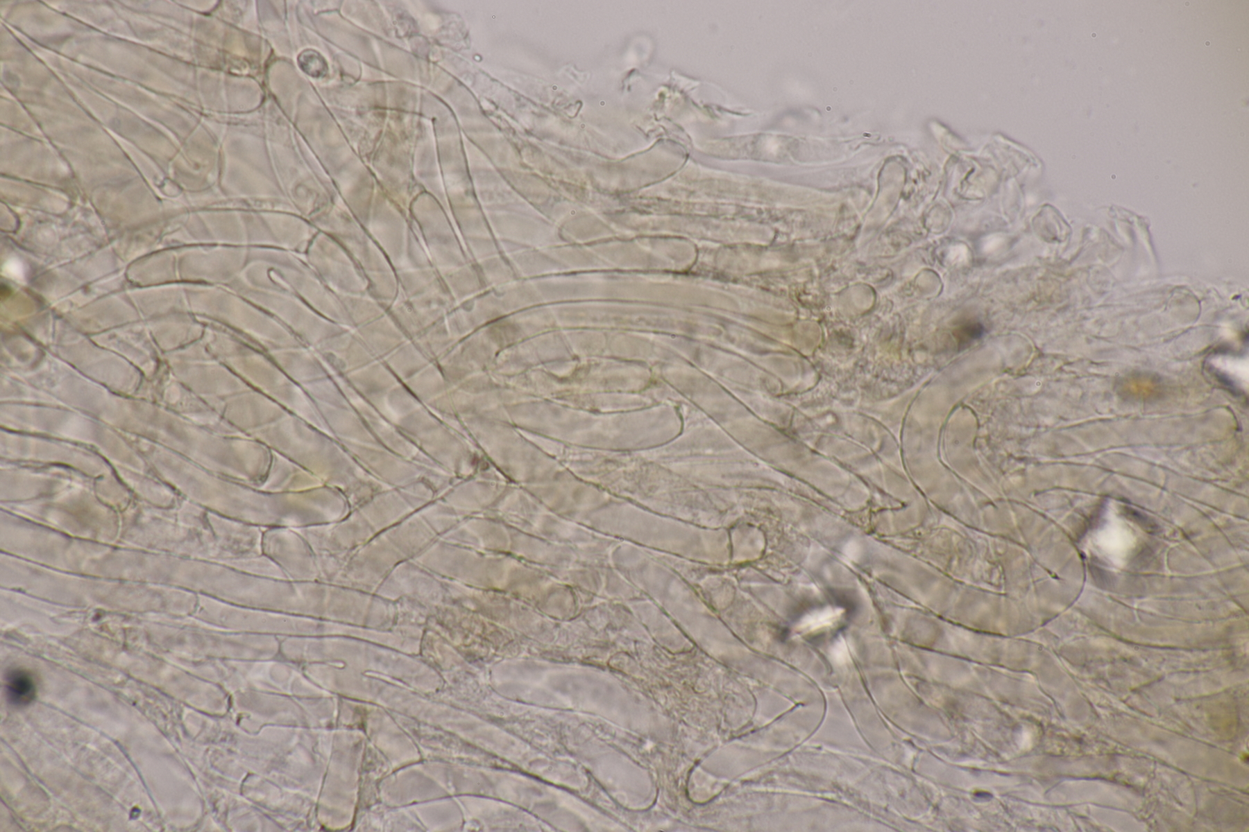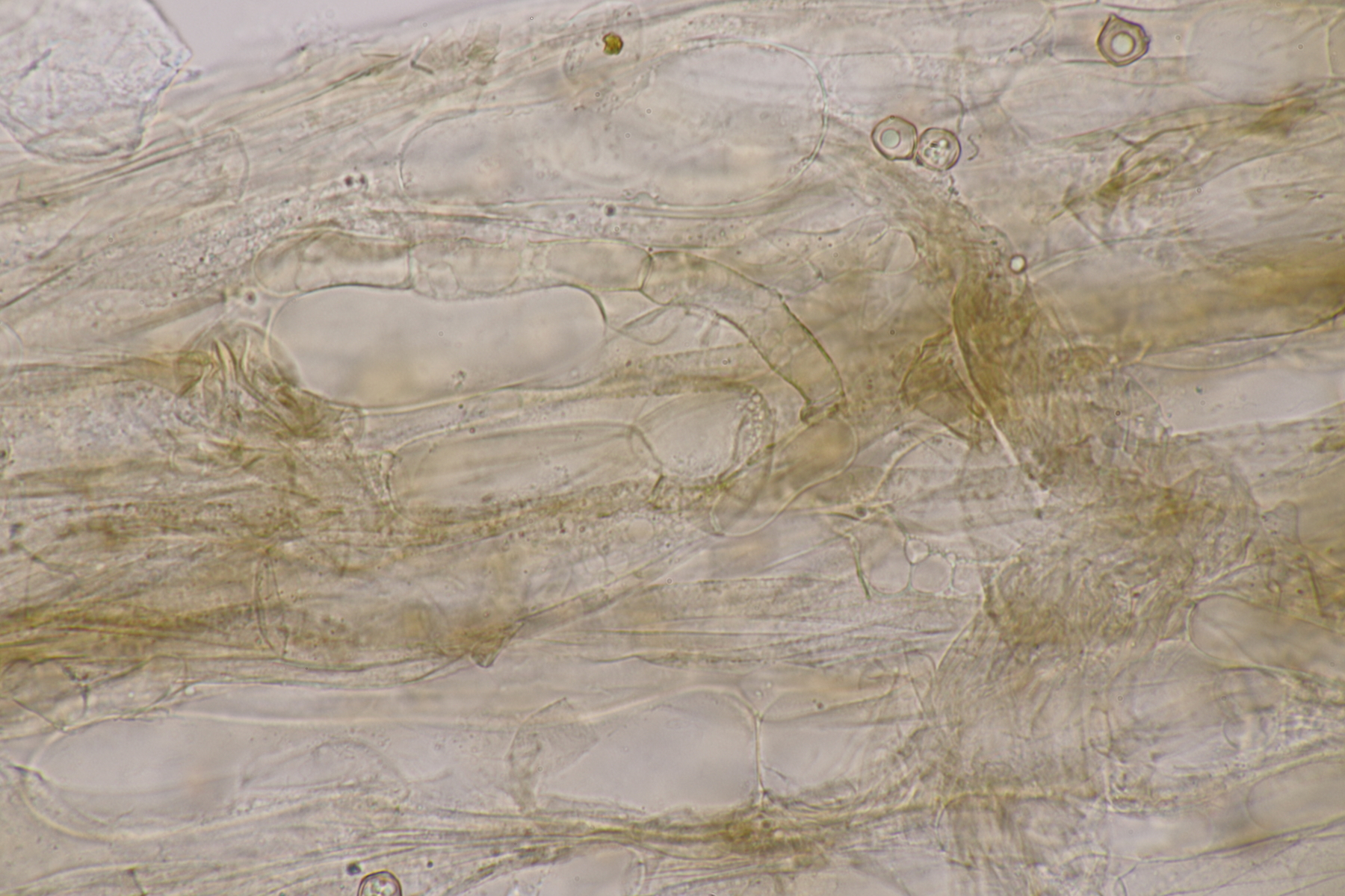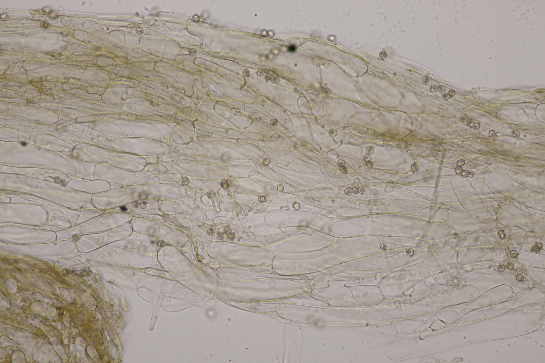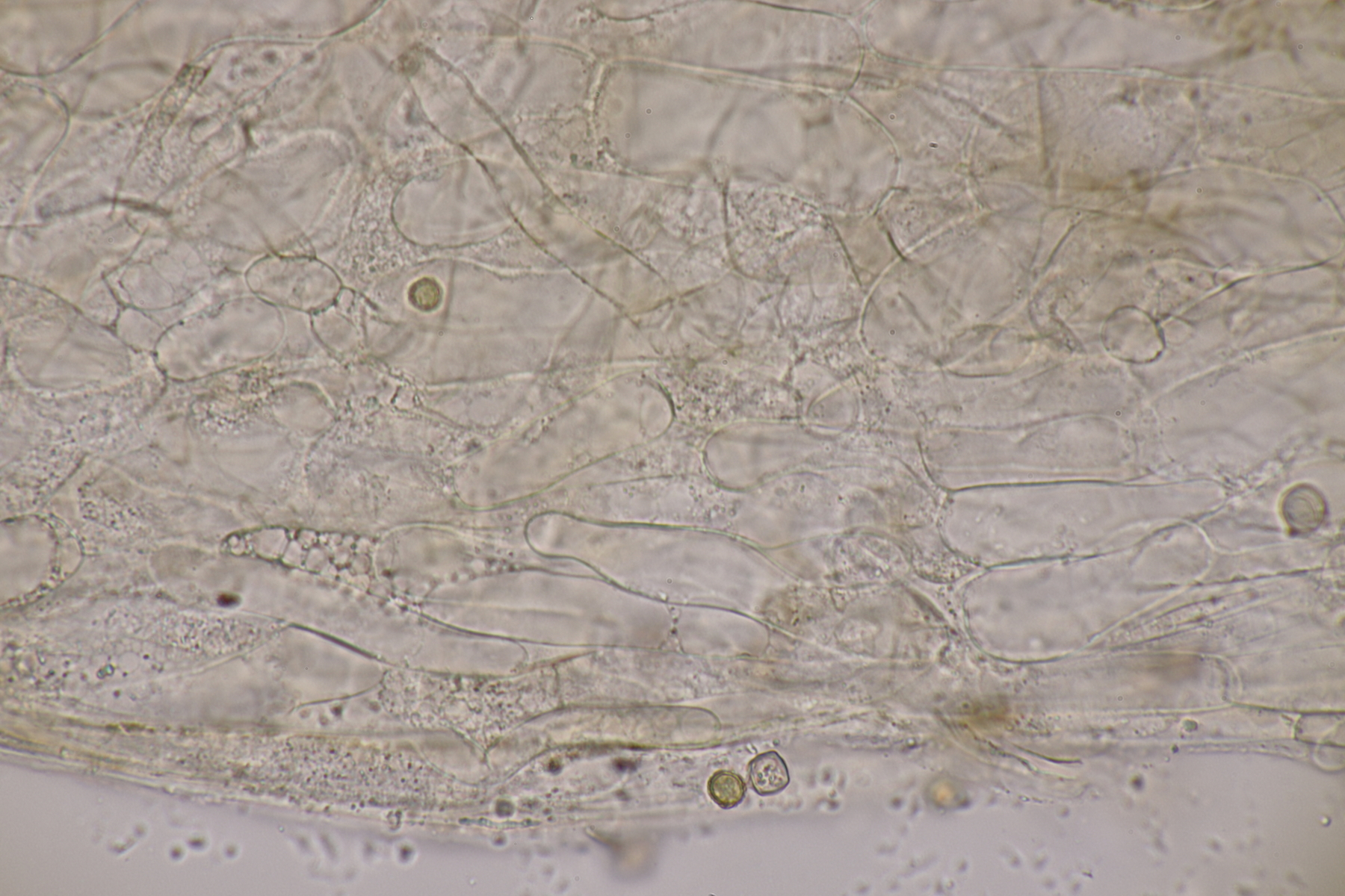 5. Ein Rötling mit deutlichem Mehlgeruch und durchscheinend gerieftem Hut. Sporen messen 7.8+-0.5 x 6.9+-0.5, Q=1.1+-0.1 bzw. 6.6-8.5 x 6.1-7.6, Q=0.9-1.2. Basidien 4-sporig mit Basalschnalle. Elemente der Huthaut bis um 170 µm lang, so daß ich hier bei Entoloma sericeum auskomme.
