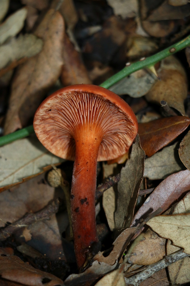 Hello again. I found a few examples of this beautiful Lactarius with a burnt orange pileus and a reddish stipe which gradually deepens to blackish-red at the base. Spores subglobose with reticular ornamentation around 8 um diameter. Sap not abundant turbid (not milk-white) slightly bitter but not strongly so. I was thinking that this is the Lactarius atlanticus but after reading this site: