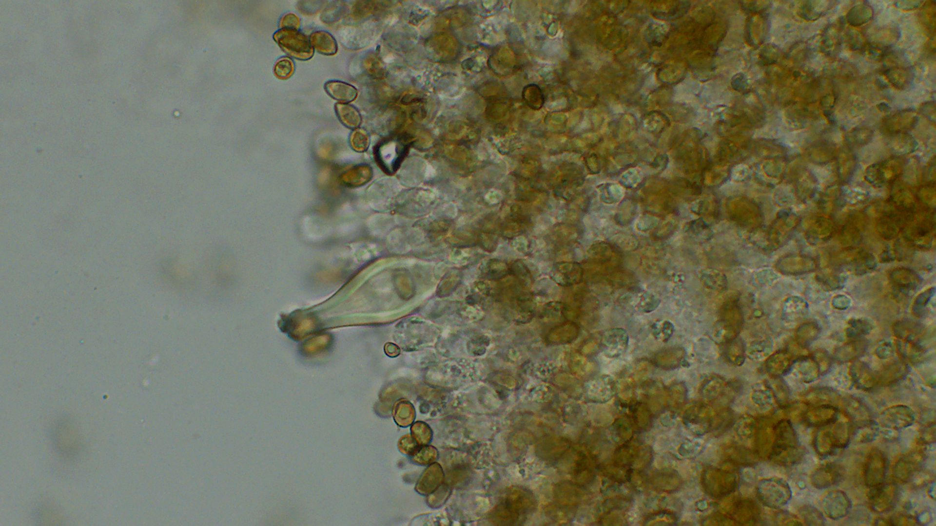 • Grüß dich, Matthias, also für mich sehen die Stiele eigentlich nicht ganz bereift aus, auch wenn ich das Foto mit den liegenden Fruchtkörpern näher ranzoome. Bist du sicher, dass die auch unten metuloide Caulozystiden hat? Das untere Caulozystidenfoto zeigt m.E. runtergefallene Zystiden. Des weiteren scheint es mir so zu sein, dass da zweisporige Basidien mit drin sind und dass daher die Sporengröße nicht einheitlich ist. Kann das sein?