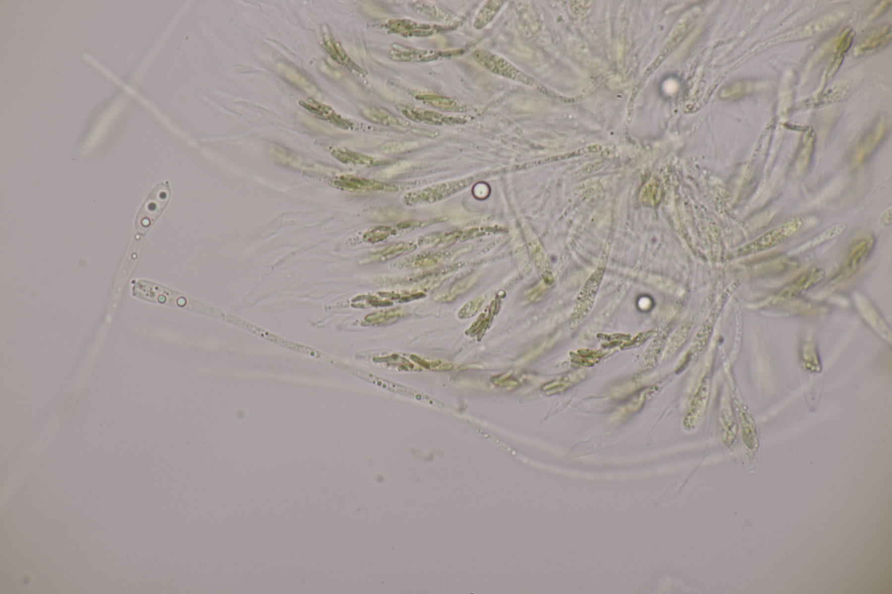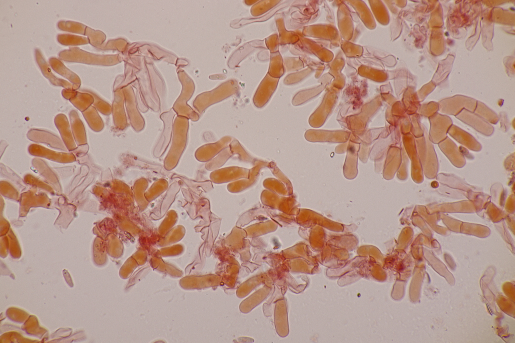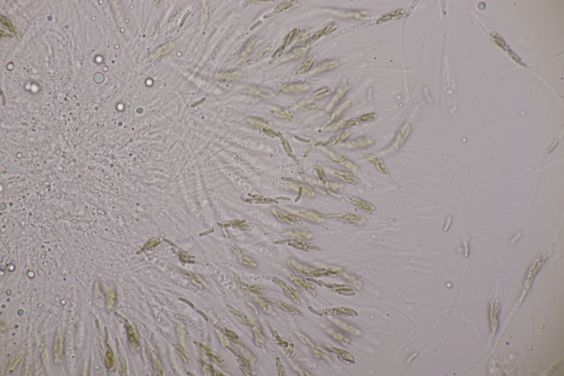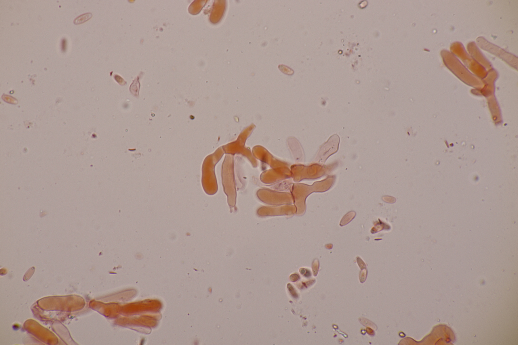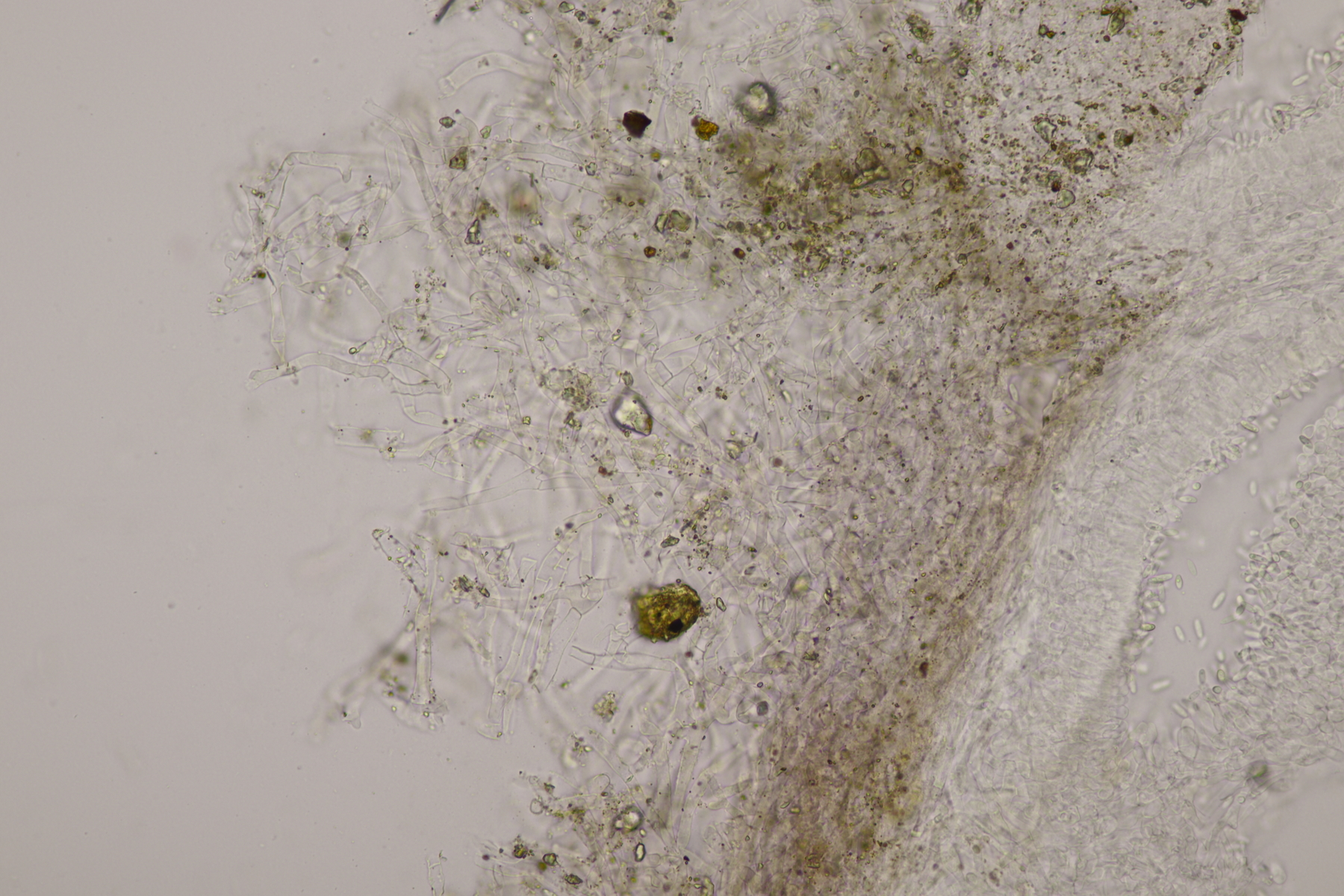 7. Auf der Sandfläche standen vereinzelt junge Kiefern unter denen sich auch Rhizopogons finden ließen. Die Peridie färbt sich mit KOH rötlich, mit Eisensulfat grünlich. Die Gleba färbt mit beiden Reagenzien nicht. Sporen messen 7.5-9.1 x 2.6-3.4, Q=2.4-3.2, im Mittel 8.2 x 2.9, Q=2.8. Bei der Beurteilung der Peridie tue ich mich schwer, würde das aber am ehesten für den Roseolus-Typ halten. Rhizomorphen bedecken nicht den ganzen Fruchtkörper. Junge Basidiolen sind dickwandig. Mit der Monographie von Paz Martin und der Funga nordica landet ich dann bei R. roseolus. Mit Montecchi und Sarasini kommen R. vulgaris, R. roseolus und R. marchii in die engere Auswahl, wobei R. marchii und R. vulgaris von der Sporengröße und -form besser passen. Insgesamt fehlt mir in der Gattung aber die Erfahrung. Kann da jemand weiterhelfen? Tricholomopsis