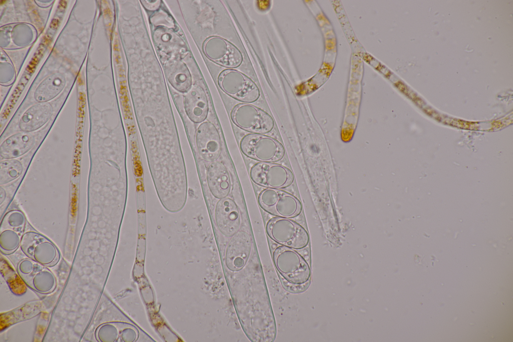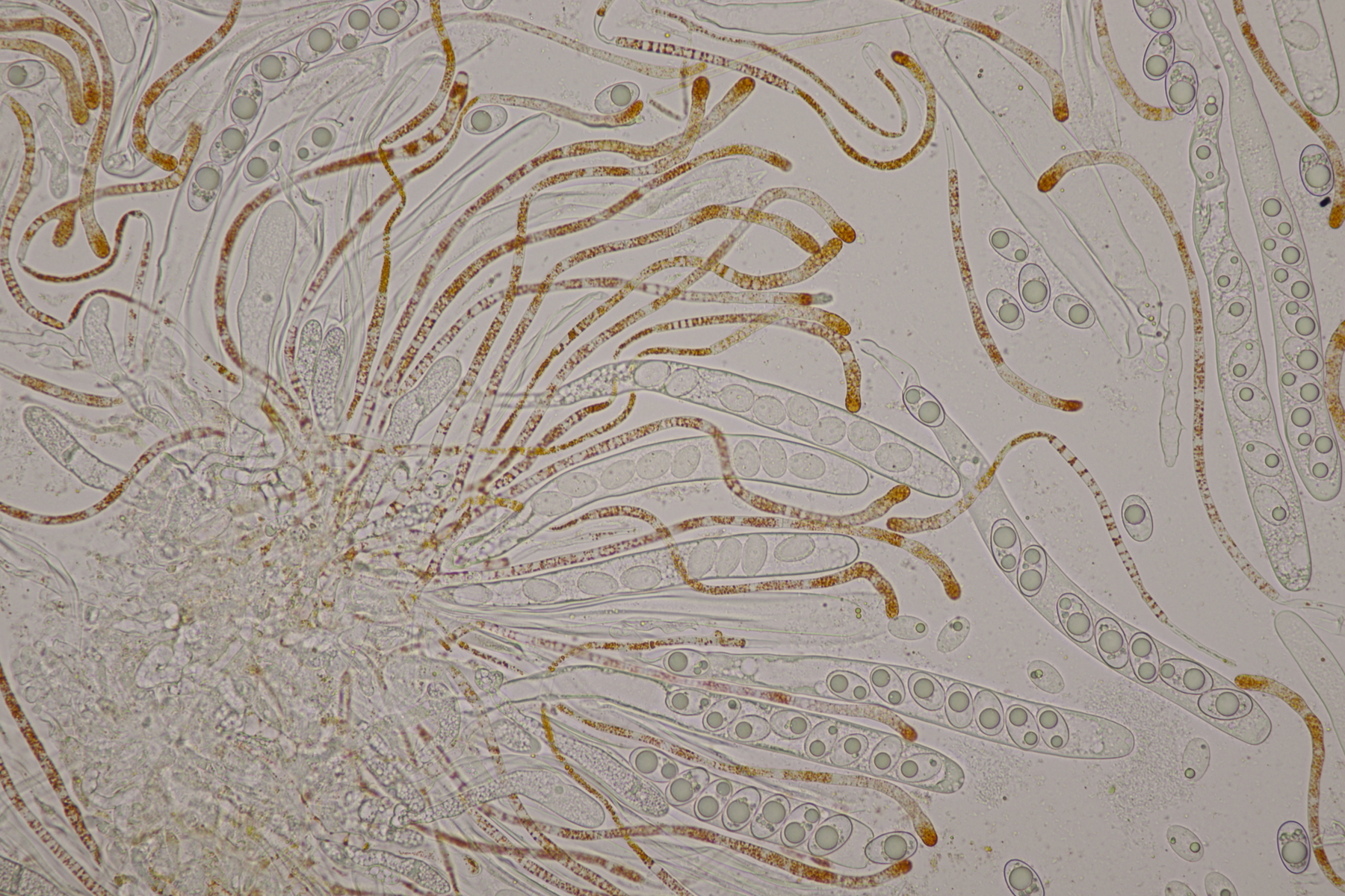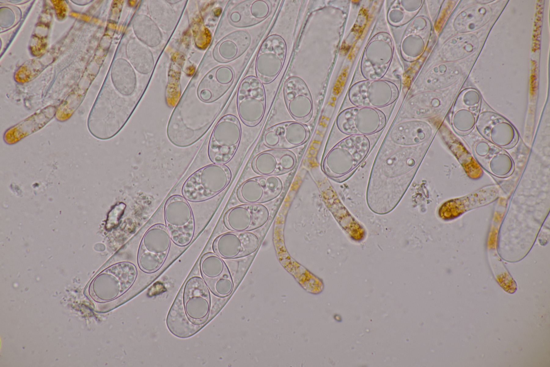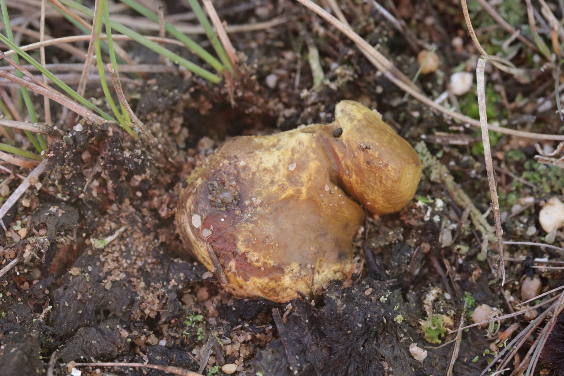 7. Auf der Sandfläche standen vereinzelt junge Kiefern unter denen sich auch Rhizopogons finden ließen. Die Peridie färbt sich mit KOH rötlich, mit Eisensulfat grünlich. Die Gleba färbt mit beiden Reagenzien nicht. Sporen messen 7.5-9.1 x 2.6-3.4, Q=2.4-3.2, im Mittel 8.2 x 2.9, Q=2.8. Bei der Beurteilung der Peridie tue ich mich schwer, würde das aber am ehesten für den Roseolus-Typ halten. Rhizomorphen bedecken nicht den ganzen Fruchtkörper. Junge Basidiolen sind dickwandig. Mit der Monographie von Paz Martin und der Funga nordica landet ich dann bei R. roseolus. Mit Montecchi und Sarasini kommen R. vulgaris, R. roseolus und R. marchii in die engere Auswahl, wobei R. marchii und R. vulgaris von der Sporengröße und -form besser passen. Insgesamt fehlt mir in der Gattung aber die Erfahrung. Kann da jemand weiterhelfen? Tricholomopsis