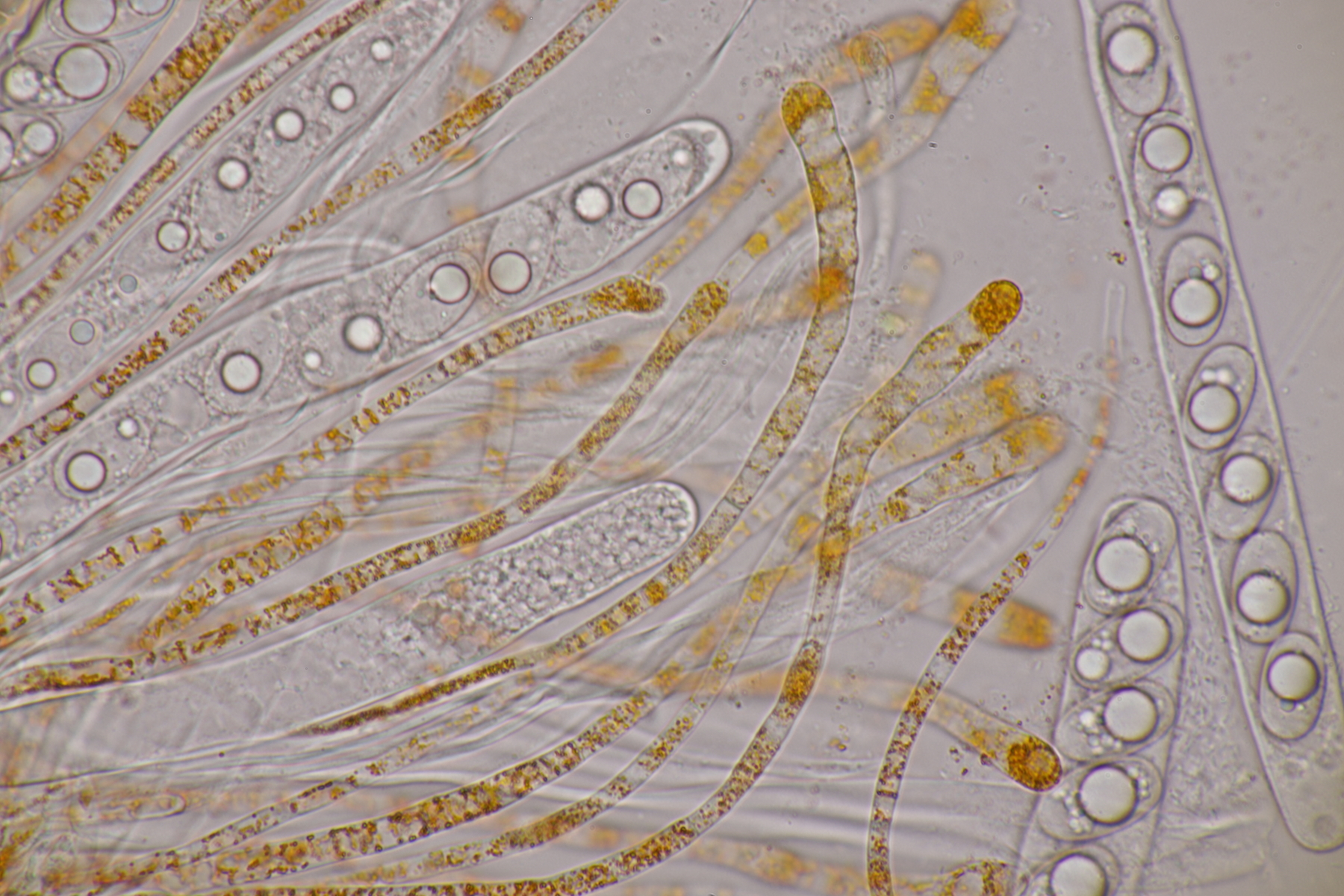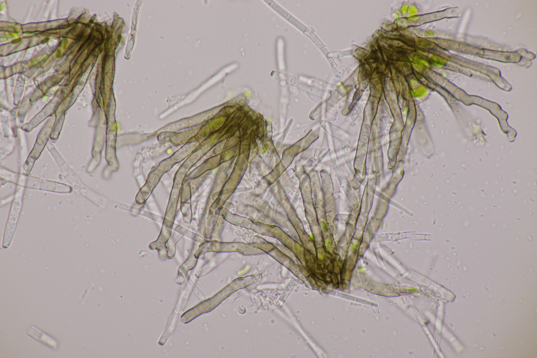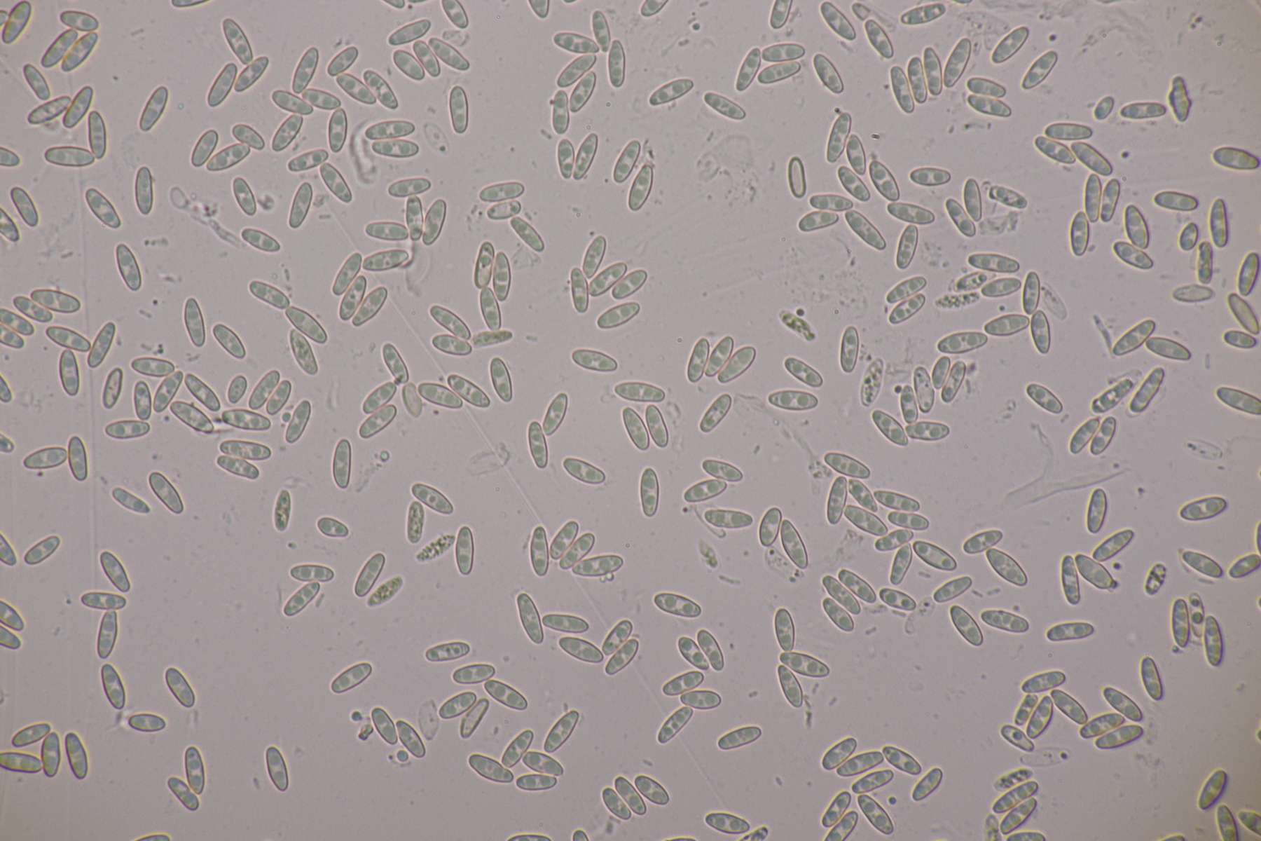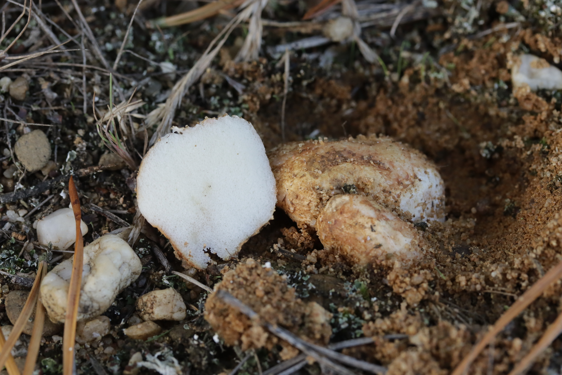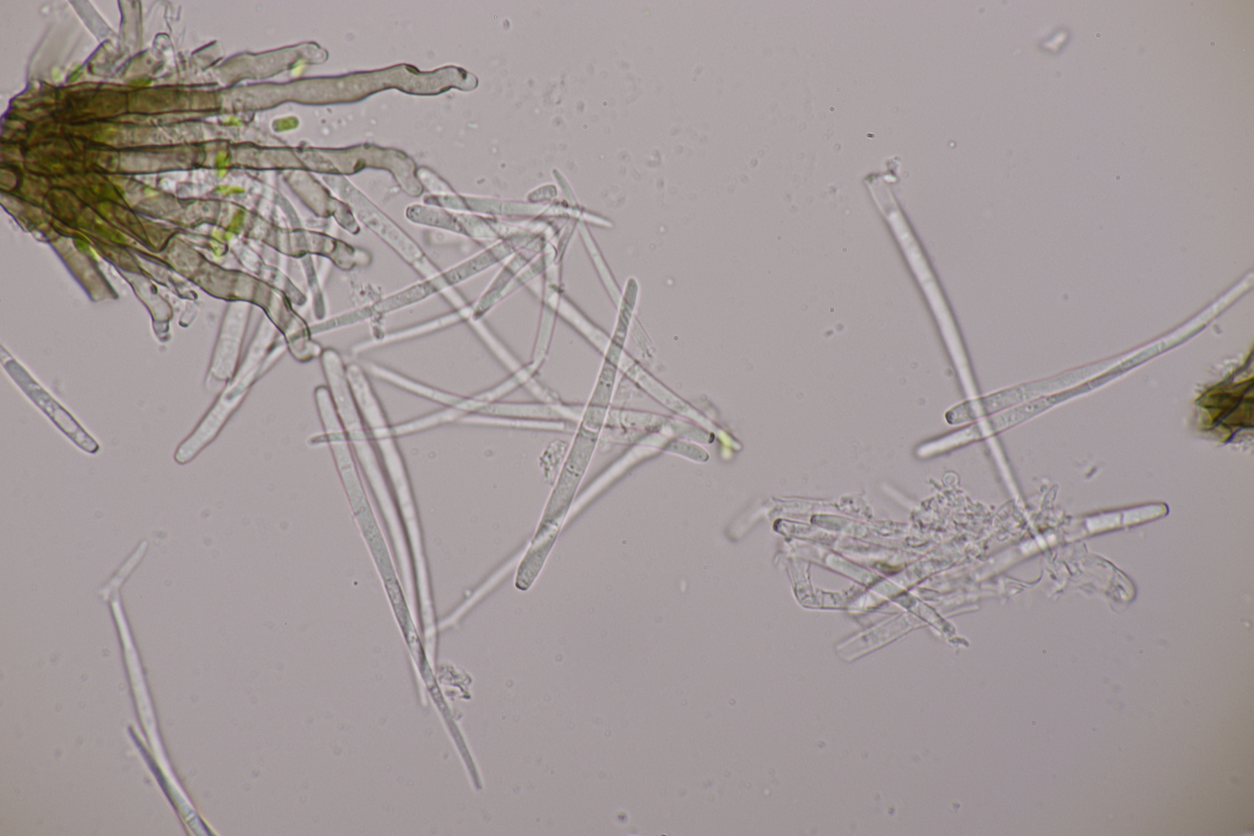 7. Auf der Sandfläche standen vereinzelt junge Kiefern unter denen sich auch Rhizopogons finden ließen. Die Peridie färbt sich mit KOH rötlich, mit Eisensulfat grünlich. Die Gleba färbt mit beiden Reagenzien nicht. Sporen messen 7.5-9.1 x 2.6-3.4, Q=2.4-3.2, im Mittel 8.2 x 2.9, Q=2.8. Bei der Beurteilung der Peridie tue ich mich schwer, würde das aber am ehesten für den Roseolus-Typ halten. Rhizomorphen bedecken nicht den ganzen Fruchtkörper. Junge Basidiolen sind dickwandig. Mit der Monographie von Paz Martin und der Funga nordica landet ich dann bei R. roseolus. Mit Montecchi und Sarasini kommen R. vulgaris, R. roseolus und R. marchii in die engere Auswahl, wobei R. marchii und R. vulgaris von der Sporengröße und -form besser passen. Insgesamt fehlt mir in der Gattung aber die Erfahrung. Kann da jemand weiterhelfen? Tricholomopsis