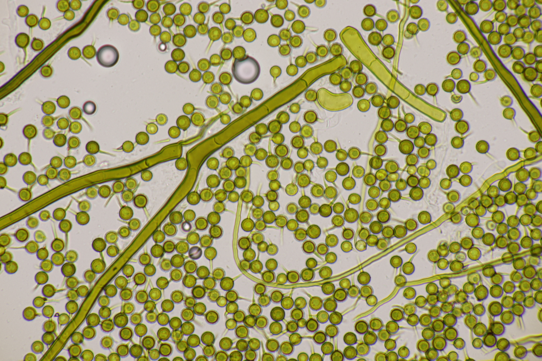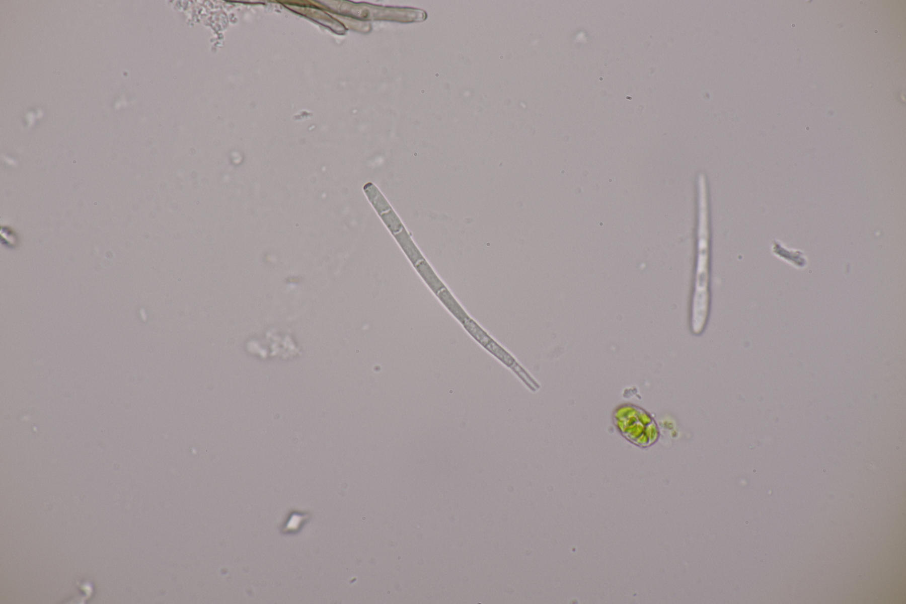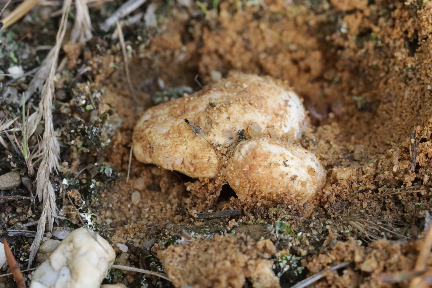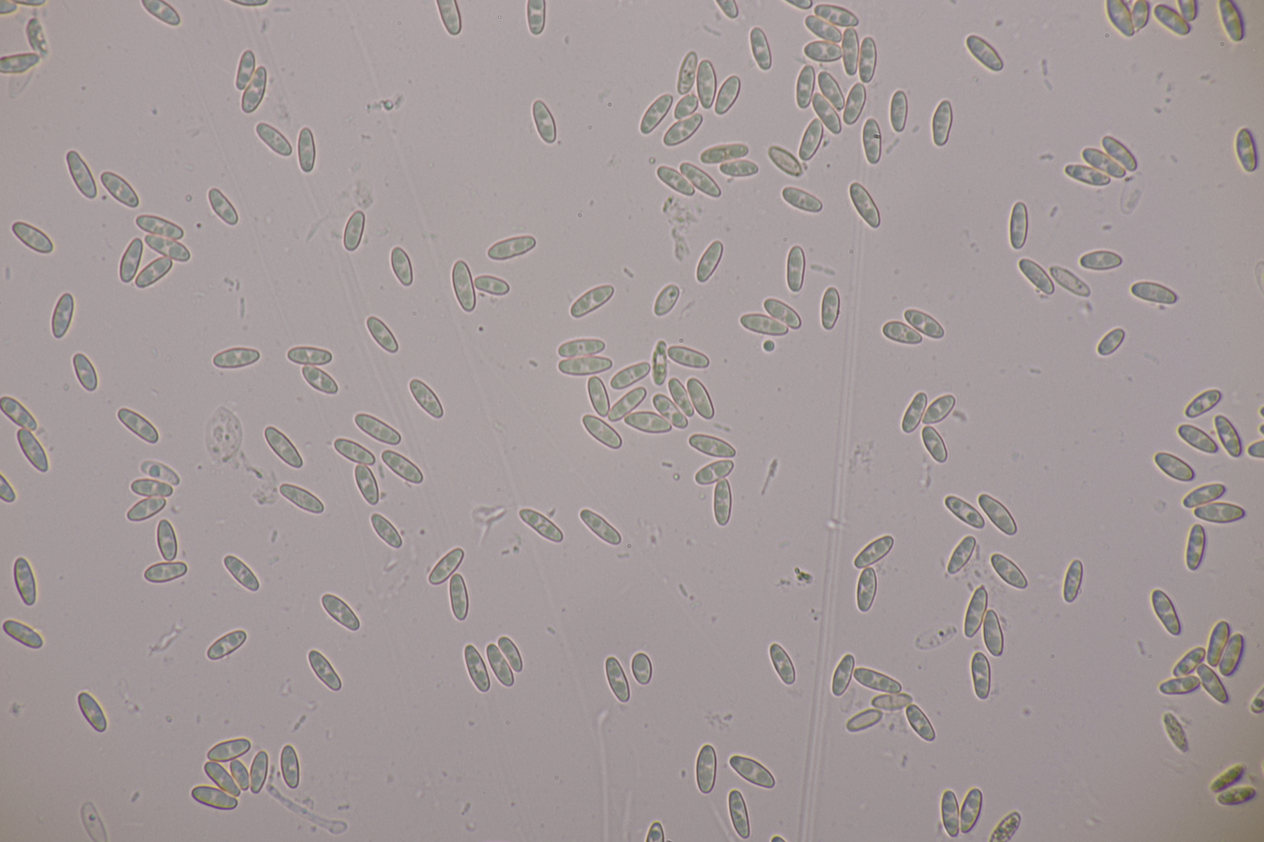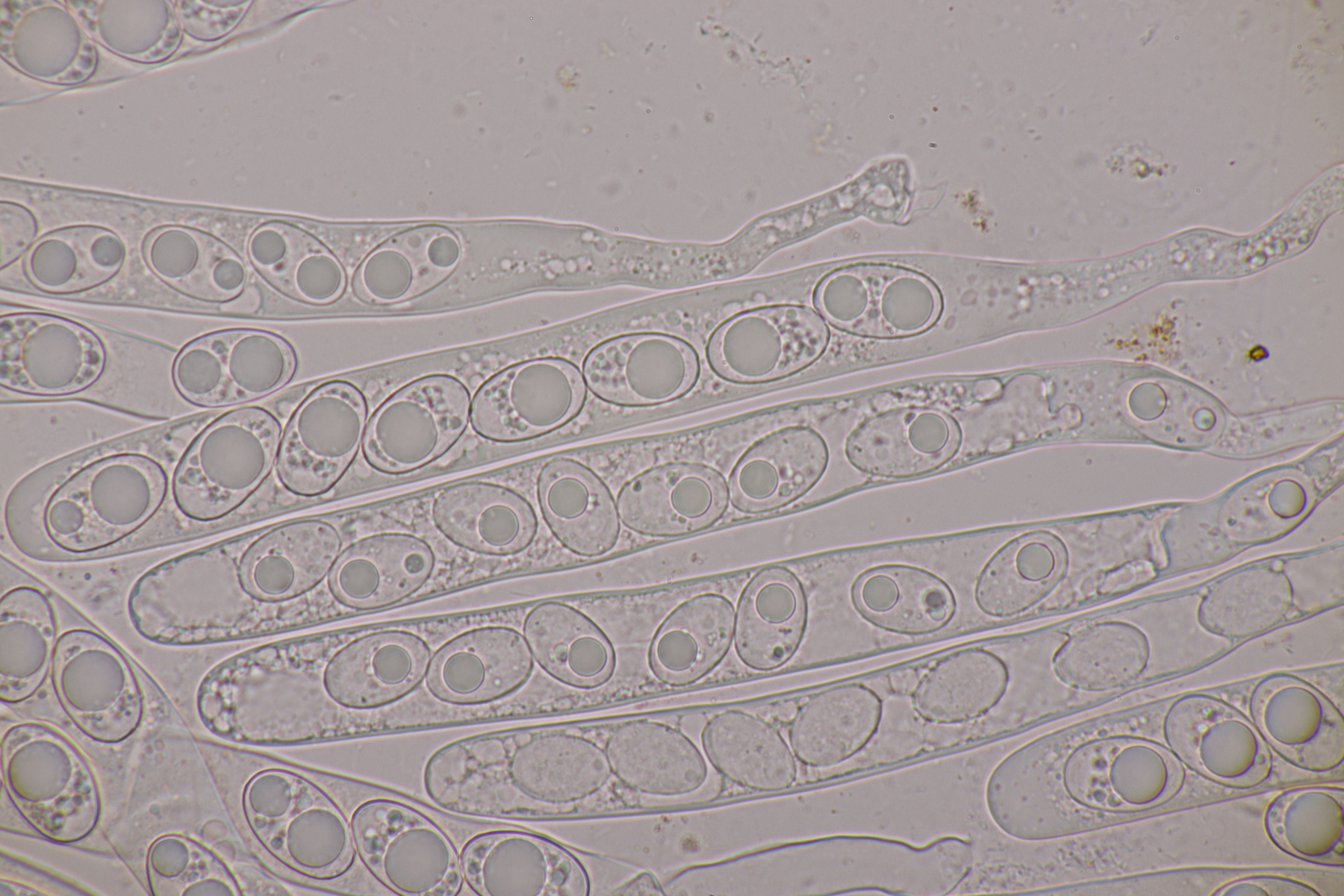7. Auf der Sandfläche standen vereinzelt junge Kiefern unter denen sich auch Rhizopogons finden ließen. Die Peridie färbt sich mit KOH rötlich, mit Eisensulfat grünlich. Die Gleba färbt mit beiden Reagenzien nicht. Sporen messen 7.5-9.1 x 2.6-3.4, Q=2.4-3.2, im Mittel 8.2 x 2.9, Q=2.8. Bei der Beurteilung der Peridie tue ich mich schwer, würde das aber am ehesten für den Roseolus-Typ halten. Rhizomorphen bedecken nicht den ganzen Fruchtkörper. Junge Basidiolen sind dickwandig. Mit der Monographie von Paz Martin und der Funga nordica landet ich dann bei R. roseolus. Mit Montecchi und Sarasini kommen R. vulgaris, R. roseolus und R. marchii in die engere Auswahl, wobei R. marchii und R. vulgaris von der Sporengröße und -form besser passen. Insgesamt fehlt mir in der Gattung aber die Erfahrung. Kann da jemand weiterhelfen? Tricholomopsis