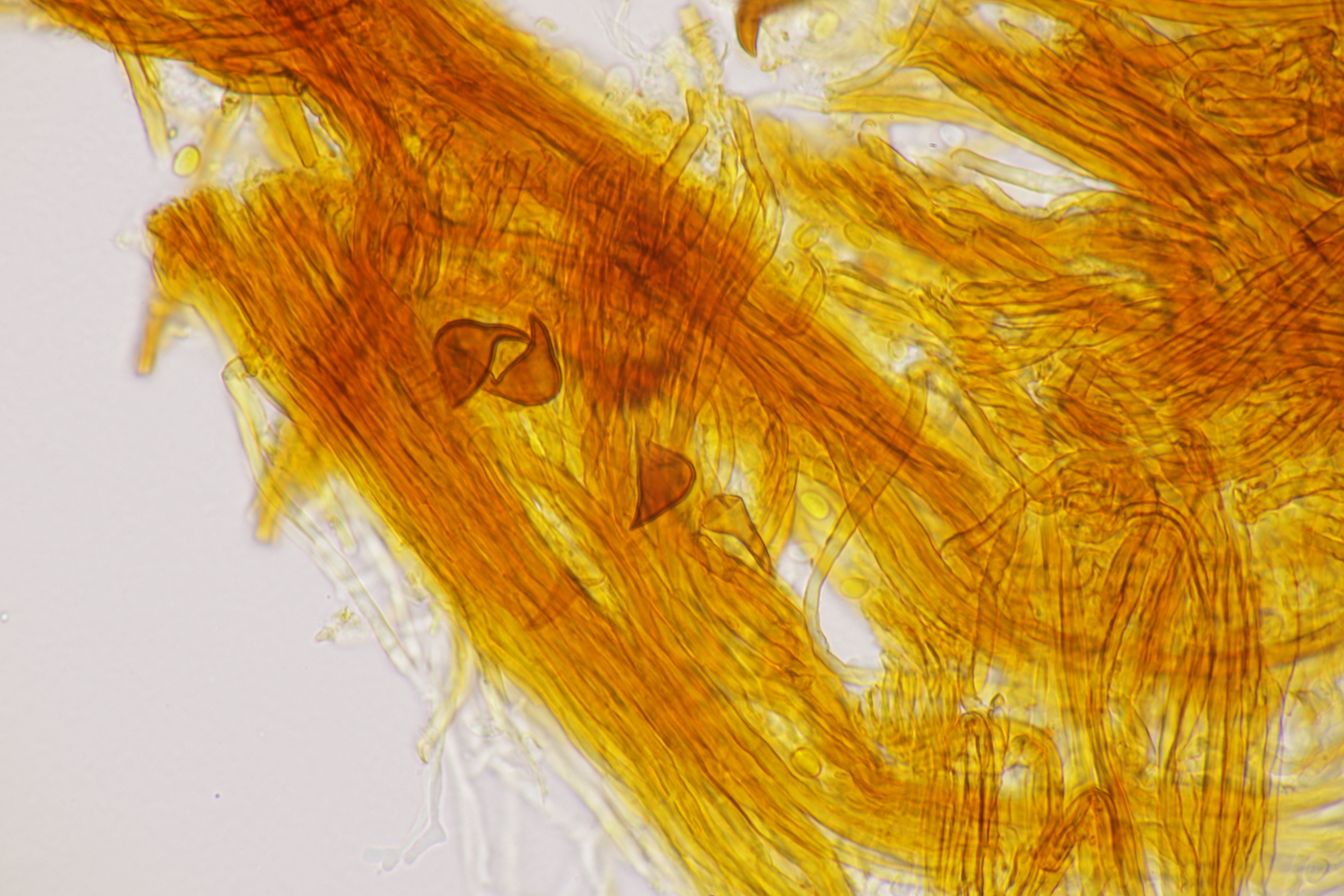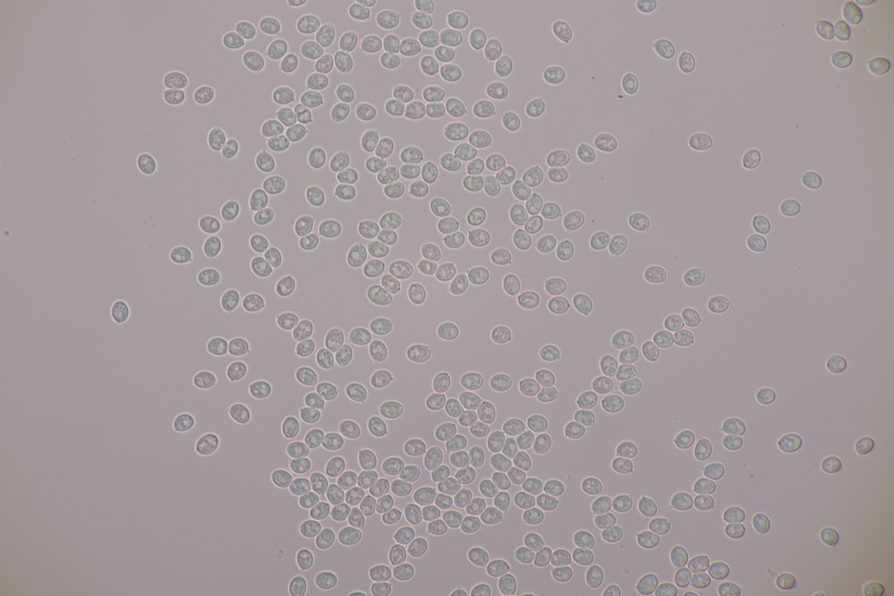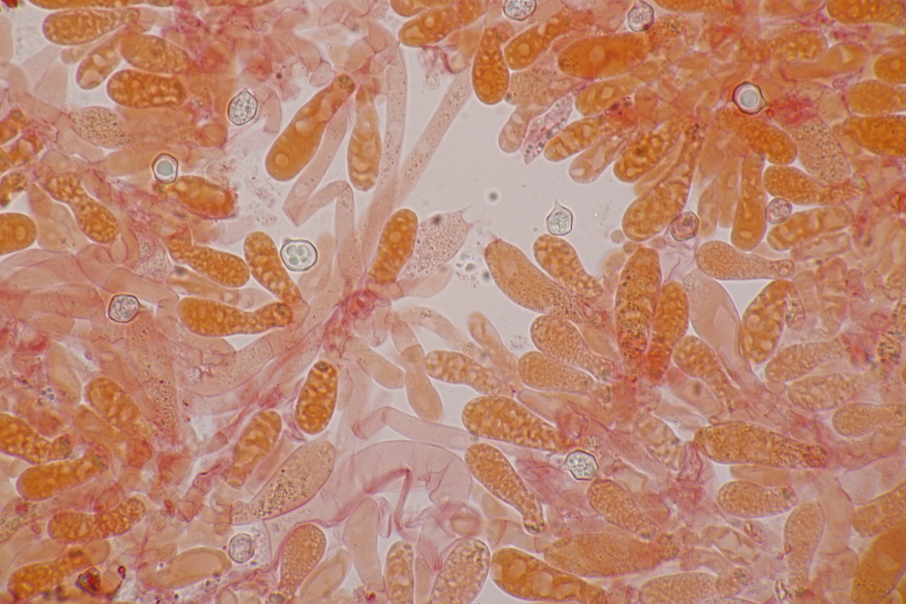 2. Hier bin ich unschlüssig. Es war eine Subgleba vorhanden, bräunlich. Sporen leicht warzig, 3.6-4.5 µm Durchmesser bzw. 4.2+-0.2 µm. Pedicel sehr kurz, um 1 µm. Capillitium ohne Septen, mit zahlreichen Poren. Der einzige Bovist, der überhaupt in Frage käme ist B. aestivalis, aber da sind die Sporen zu groß. Bei Lycoperdon lande ich dann am ehesten bei L. lividum. Kann das passen?