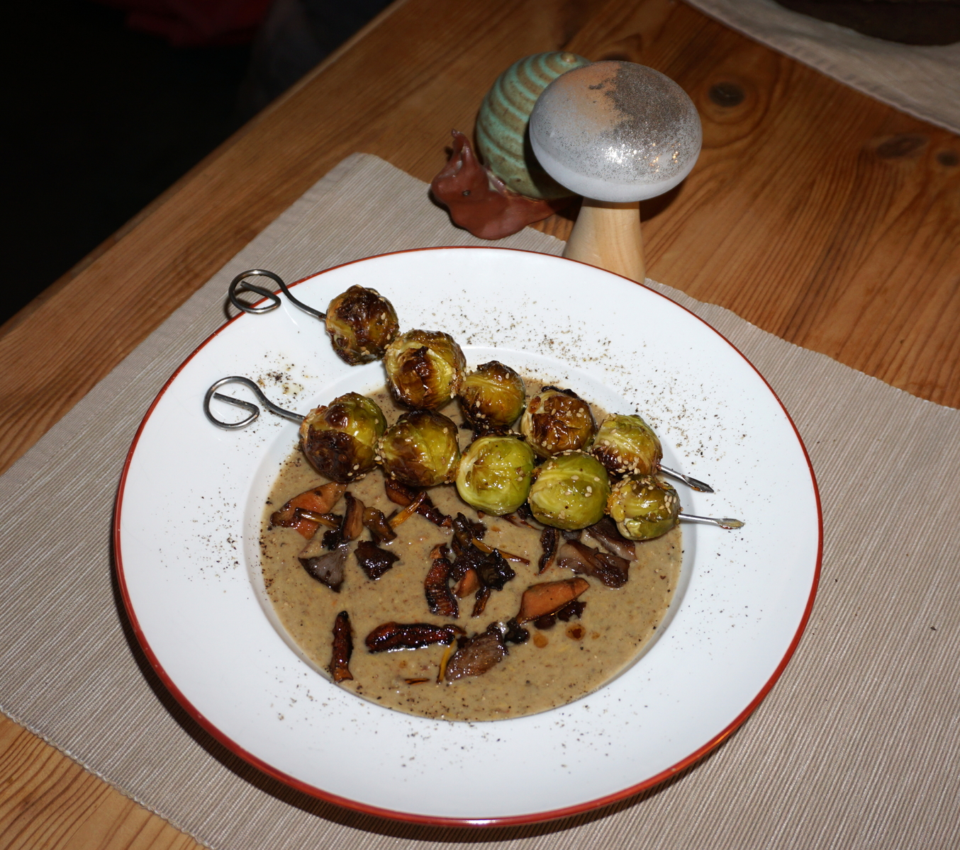 Statt getrockneter Steinpilze hab ich getrocknete Glucke und für die frischen Pilze habe ich den Violetten Rötelritterling, Lachsreitzger, Trompetenpfifferling und Hallimasch verwendet. Das Essen war ein Gedicht und passt zur Jahreszeit. Beim Rosenkohl evtl. etwas sparsamer mit der Orangenschale umgehen, war bei mir etwas dominant...