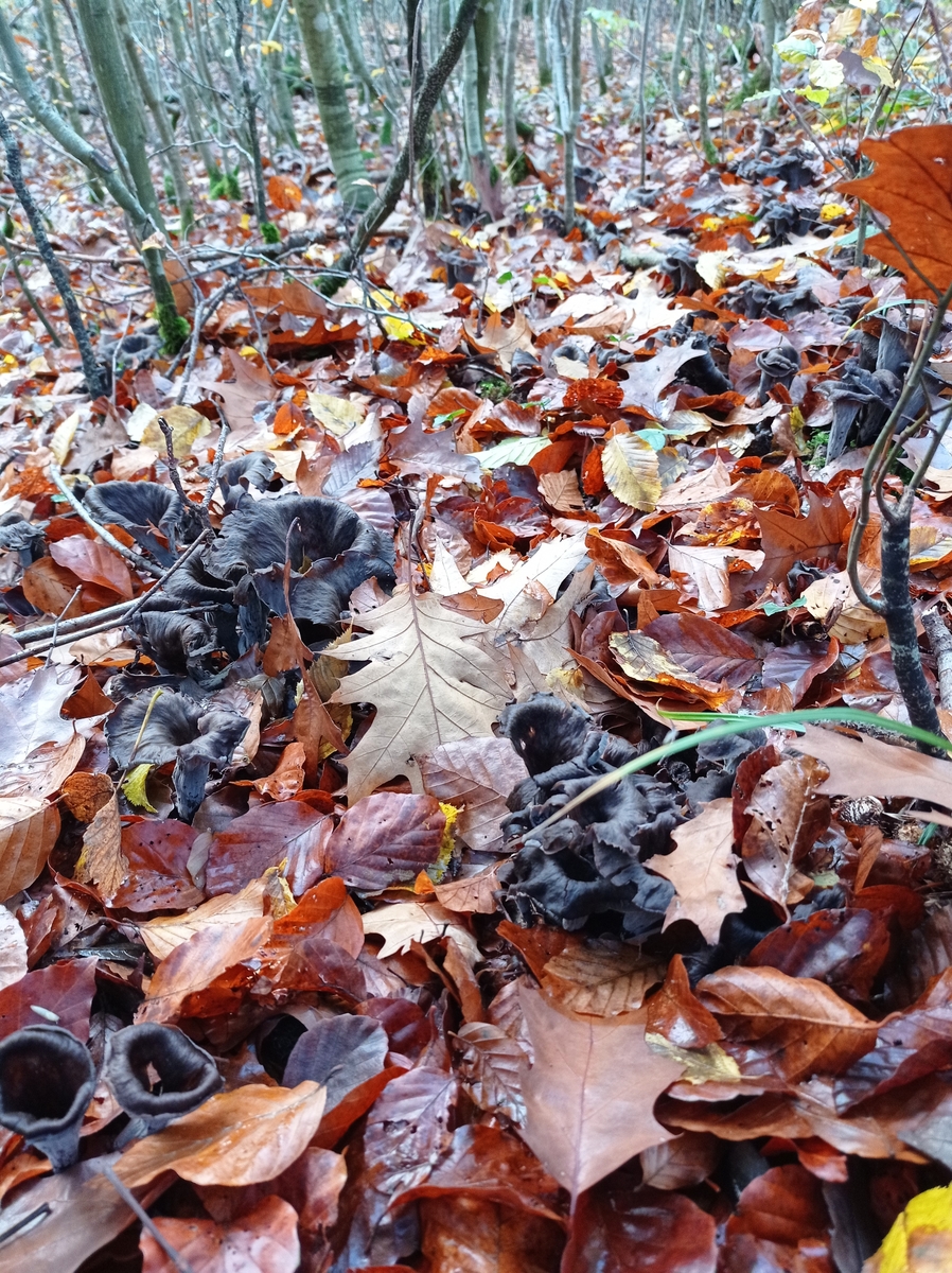 Bei uns hatten die Herbstrompeten von Anfang September bis Anfang Oktober optimale Wachstumszeit. Da sie aber nicht sehr wasserhaltig sind, kann man die Fruchtkörper noch lange, allerdings überständig finden.